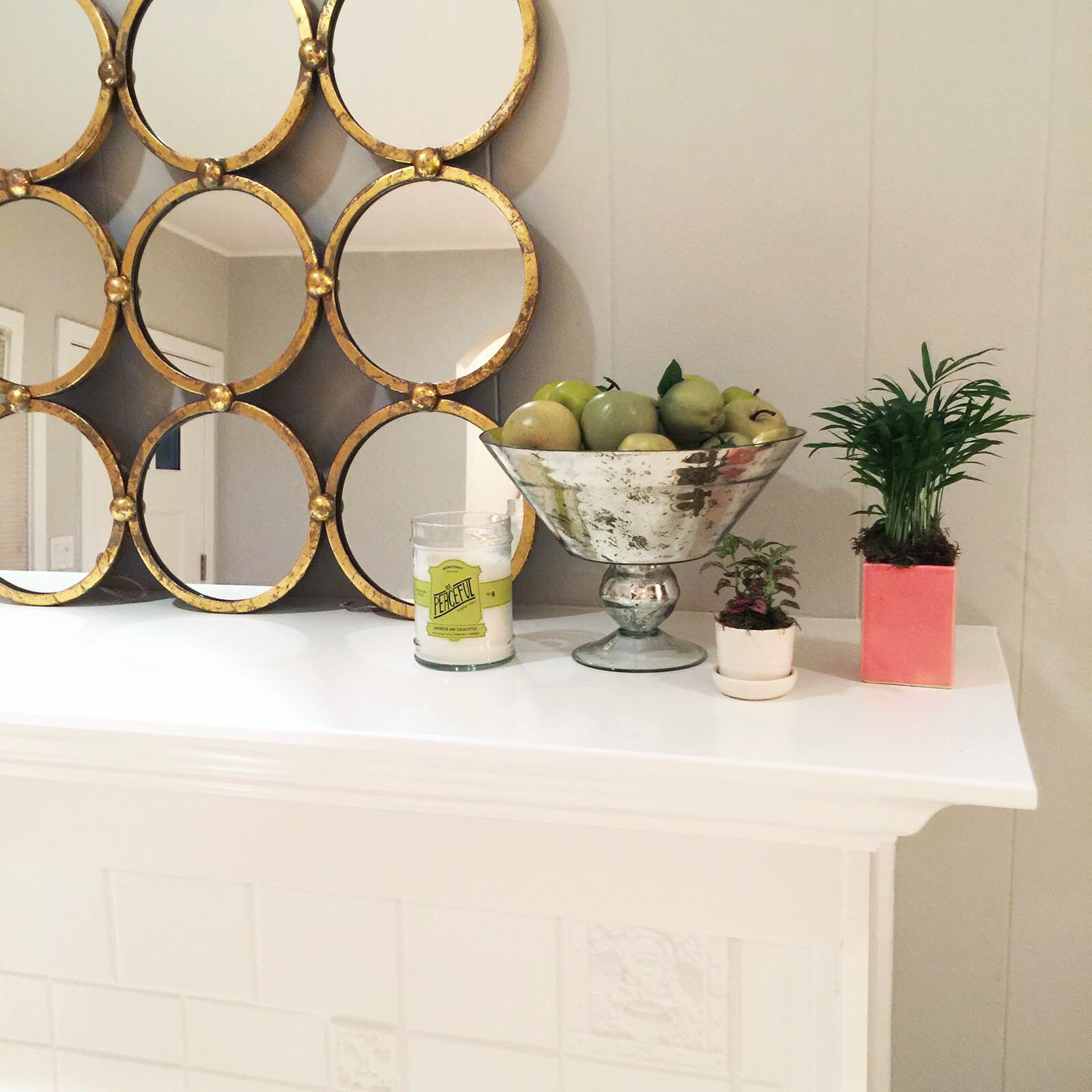 When I do add color to my decor, I like to aim for pops of green because it gives a vibrance to the home. I added these little potted plants from The Sill, how cute are they?! Decorative apples in a mercury glass bowl give a nice glam and lush touch, and this peaceful candle smells incredible.