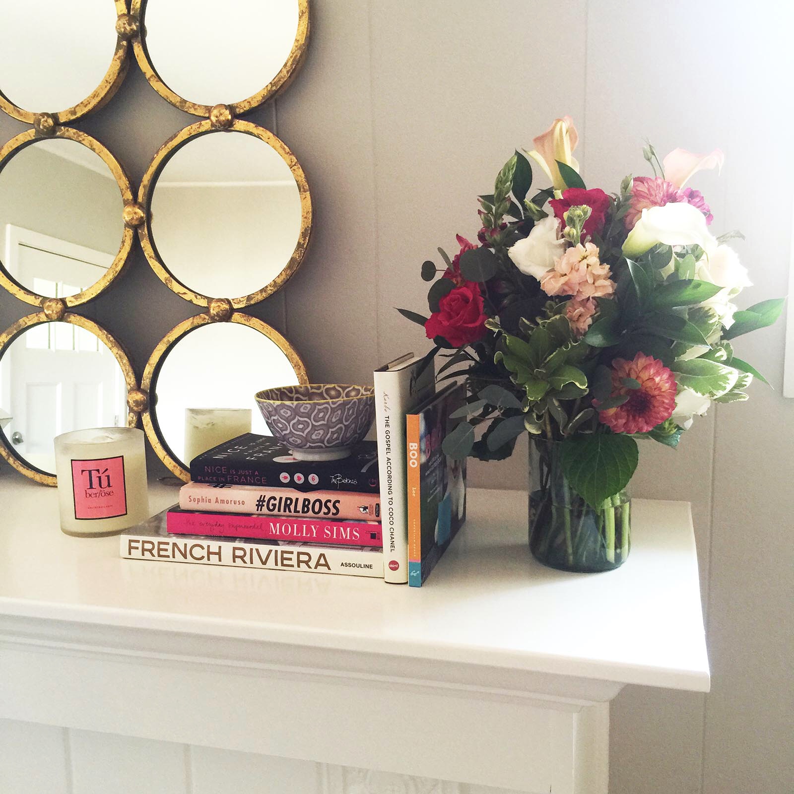 If you love all things girly and instagramable, this mantel is for you. I originally was planning to add a bookshelf to display books but changed my mind after reading The Maids tips for organizing small spaces. My girly side likes being able to display my favorite coffee table books front and center for guests to flip through while adding a gorgeous bouquet from local San Francisco favorite Farmgirl Flowers. A bright little bowl for odds and ends (mine holds random hair-ties I find around the house!) and a bright pink candle round out my girly girl mantel!