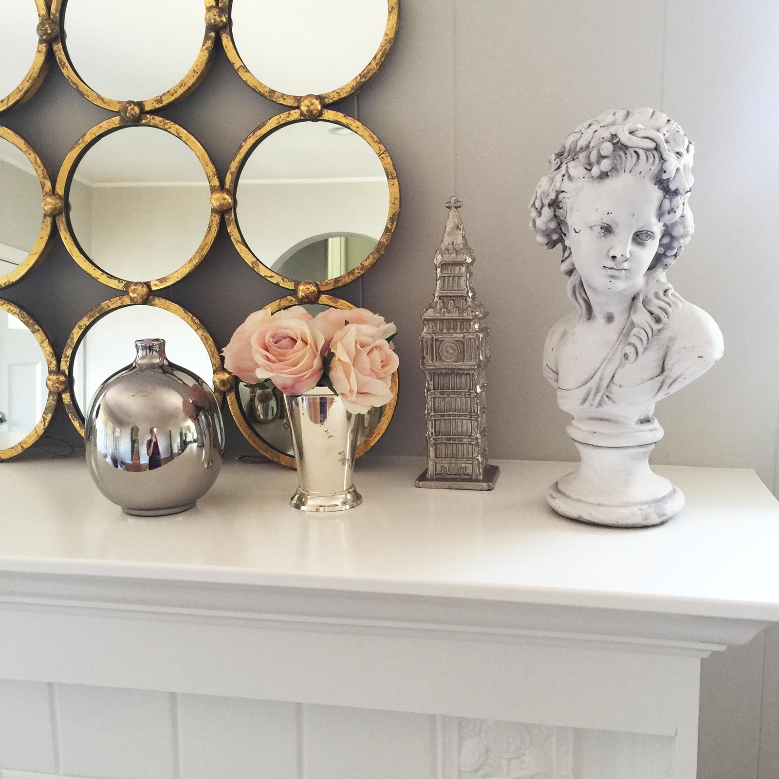 The Classic Romantic mantel is for the girl dreaming of fresh croissant and café au lait in Paris. This look is classic, sophisticated, and draws on French glamour. I found this stone bust as Marshalls and instantly knew I needed it because it’s just so cool and a fun find. Blush roses in a mint julep cup create the perfect bouquet bunch.
