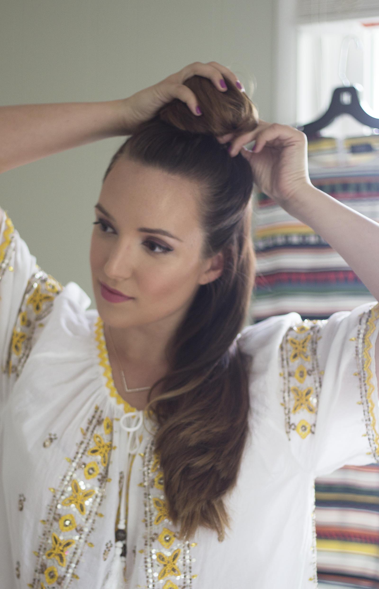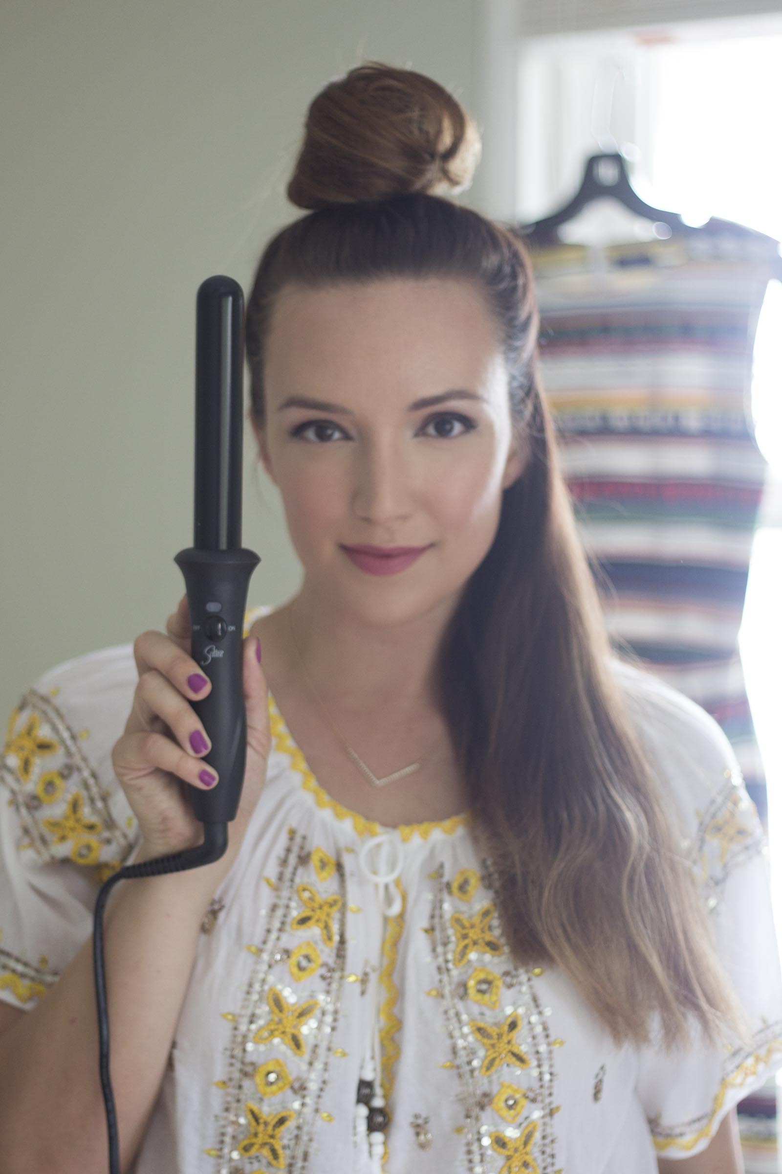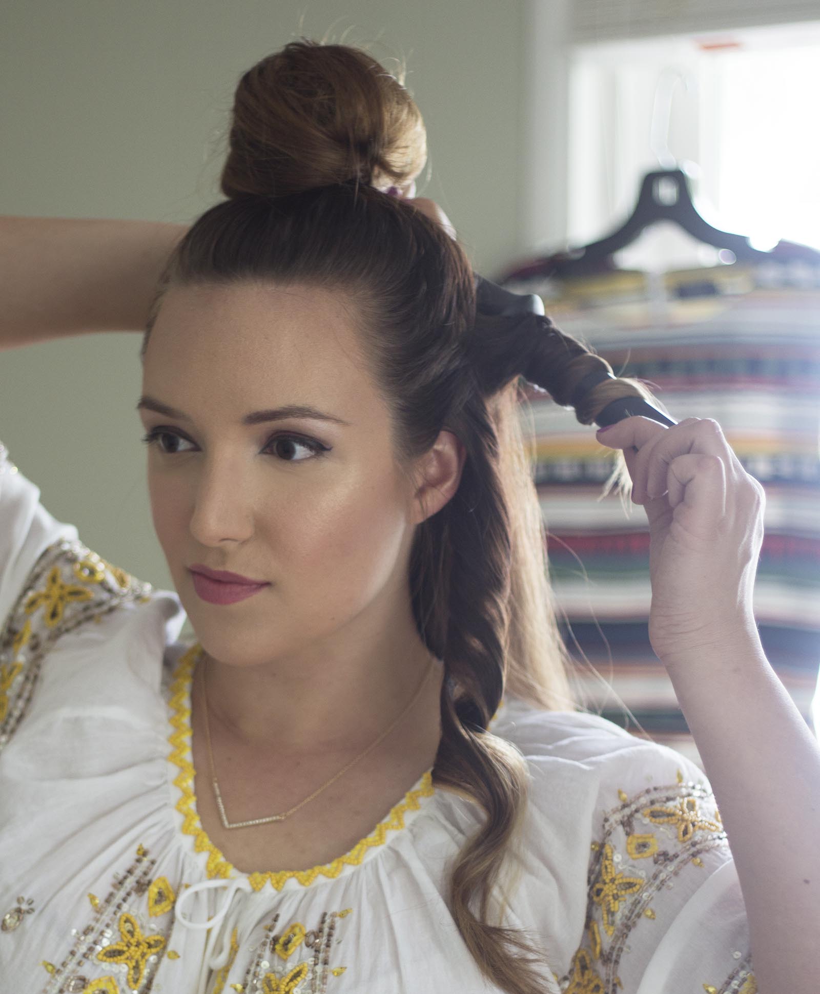 I grab a 1 inch section of hair at a time, grab the ends together, and wrap it around the curling wand. Make sure that you’re not flattening the section of hair when its being wrapped, but let it naturally twist into a rope. This allows for the ‘imperfect’ curls that have more volume and give a messy 70s waves look.