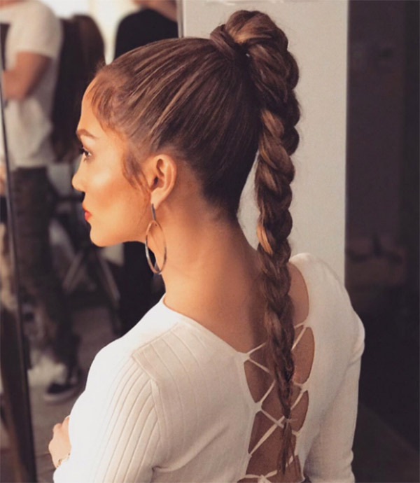 Keep hair off your back and shoulders with this low maitience look. Put your hair in a high ponytail and simple braid straight back. Use some hairspray to get a sleek look and don’t forget to secure any flyaways with bobby pins. What I love about this look is it can be dressed down and fun like Katy Perry or sophisticated and elegant Like Jenifer Lopez.