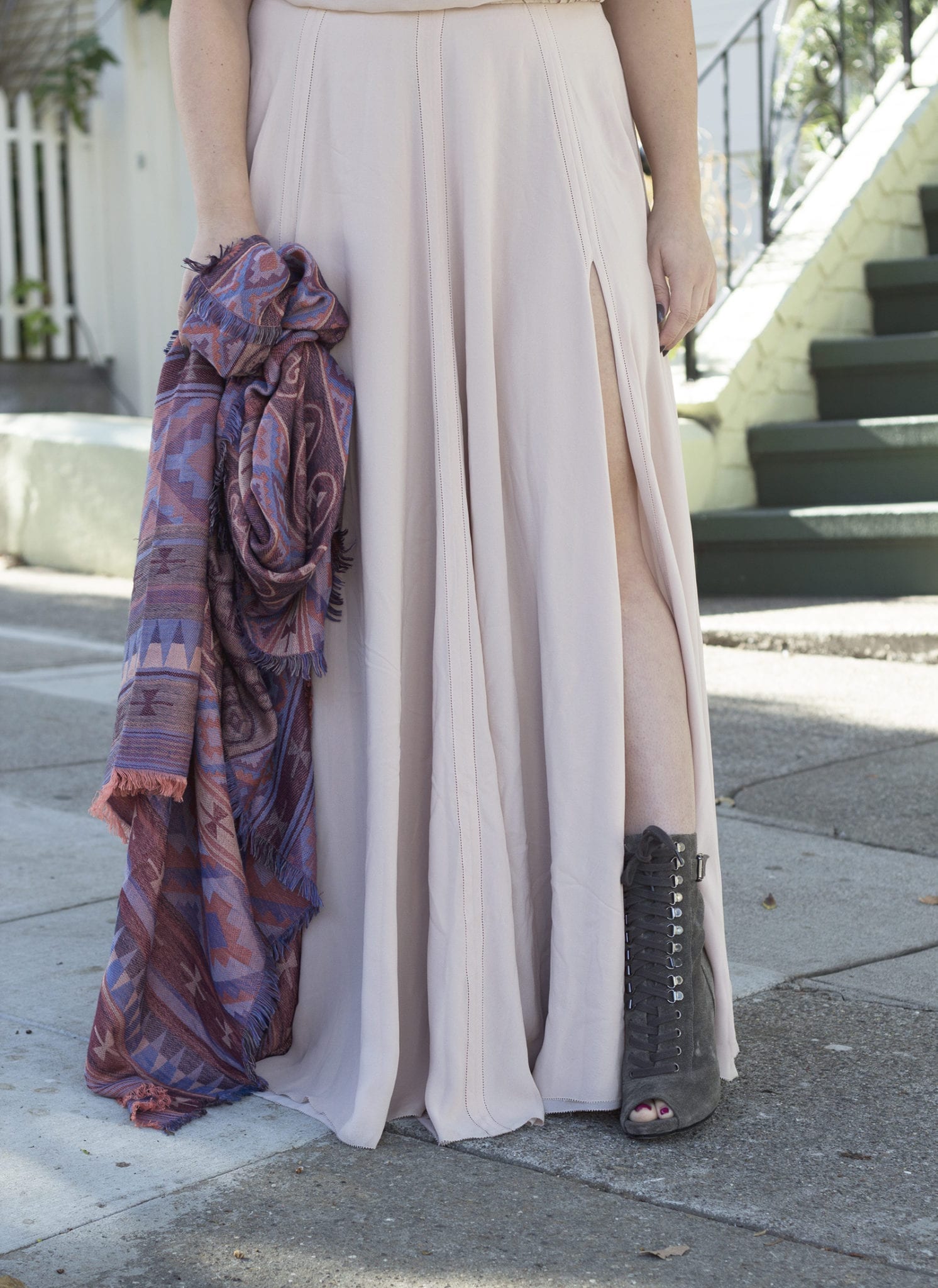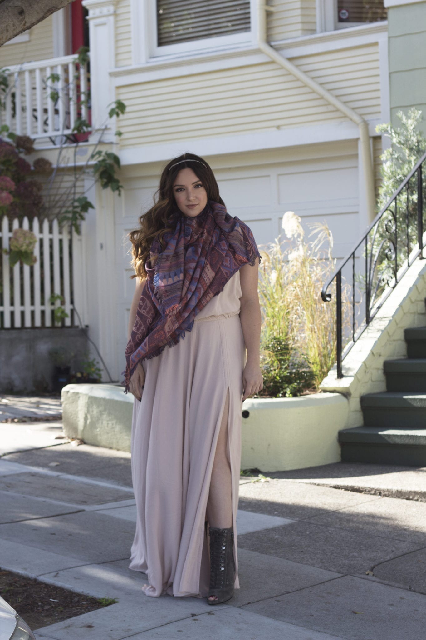 This week I attended a dressy Friendsgiving in San Francisco and wanted to go for a different look than the typical fall deep colors. I pulled this Tory Burch dress out of my closet–previously worn at a spring wedding–and wanted to challenge myself to make it work as a fall boho-glam look and my Friendsgiving party. Since the dress is somewhat backless (and it’s chilly out!) I wanted to pair it with a navajo-style printed scarf for warmth, coverage, and more of a fall vibe. The fall colors of the scarf work well with the blush pink dress and help bring together a soft fall color palette. Since this dress is very romantic on its own I added a pair of open toe lace up booties for some edge.