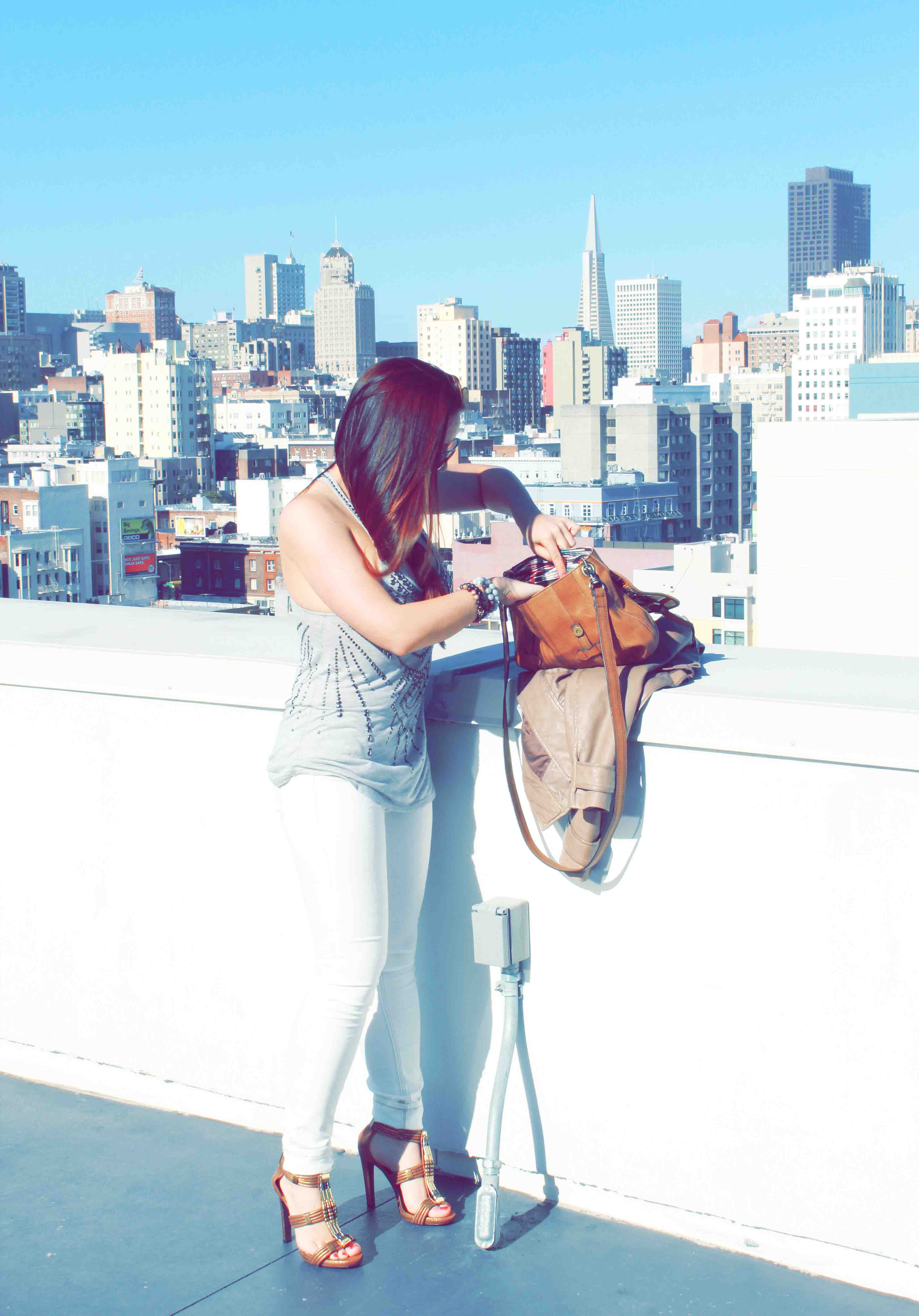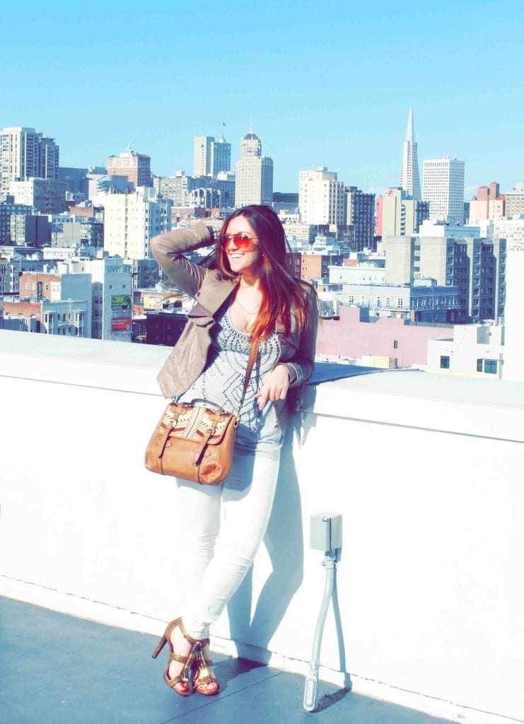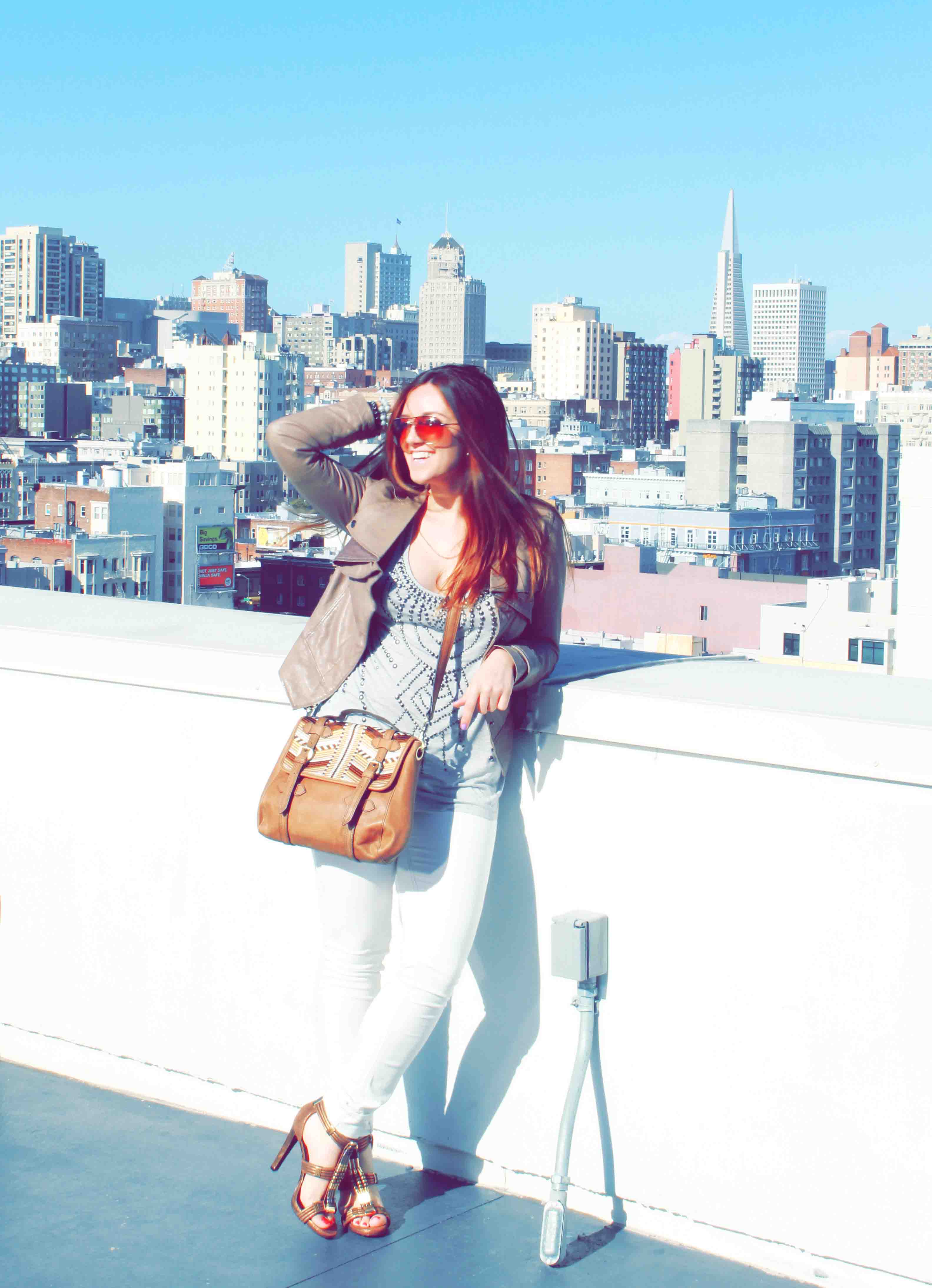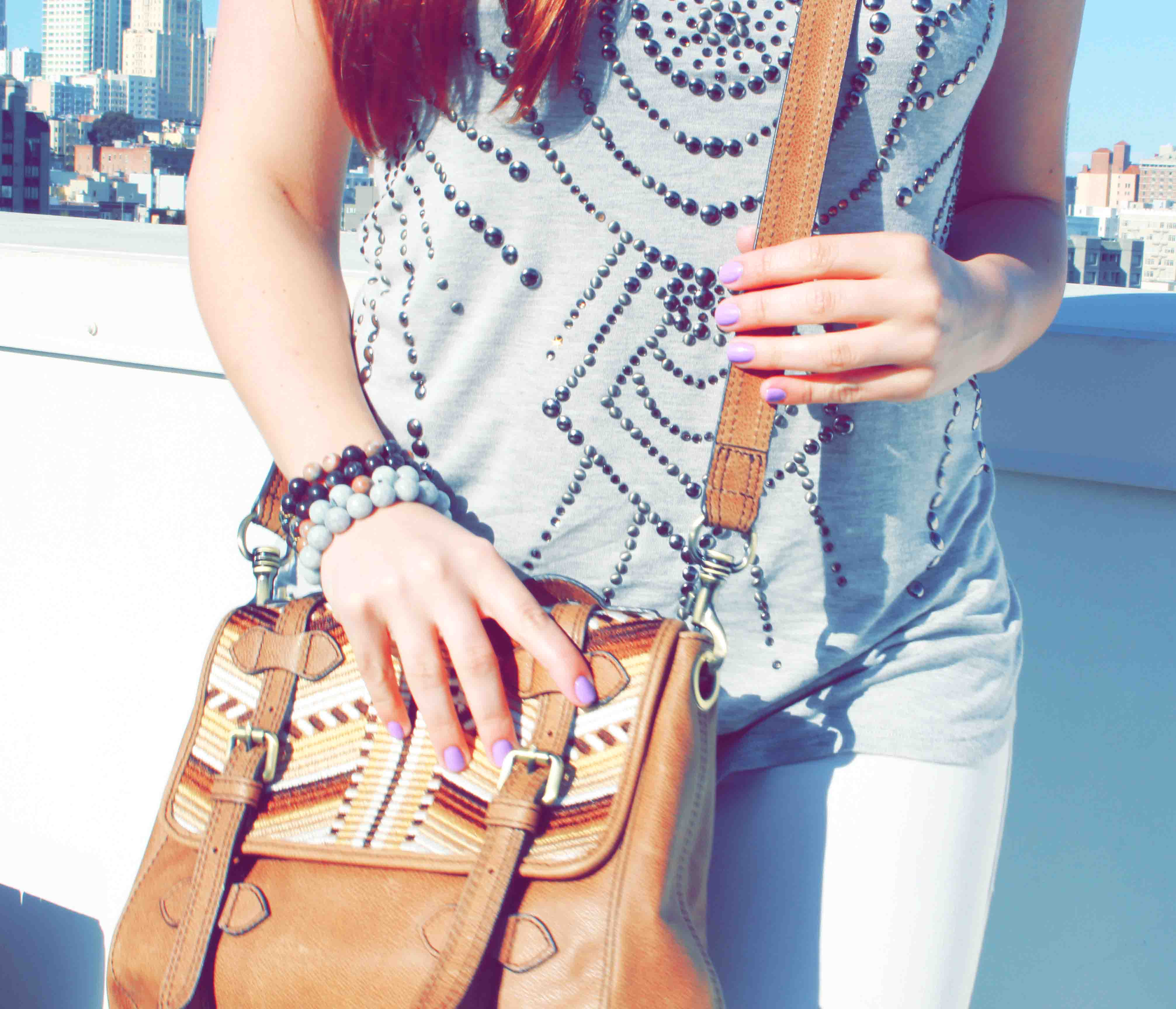 Top: Haute Hippe, similar here // Jacket: William Rast // Jeans: Free People // Bag: Cynthia Vincent, similar here  // Shoes: Tory Burch // Earrings: gifted // Bracelets: DIY // Sunglasses: TopShop