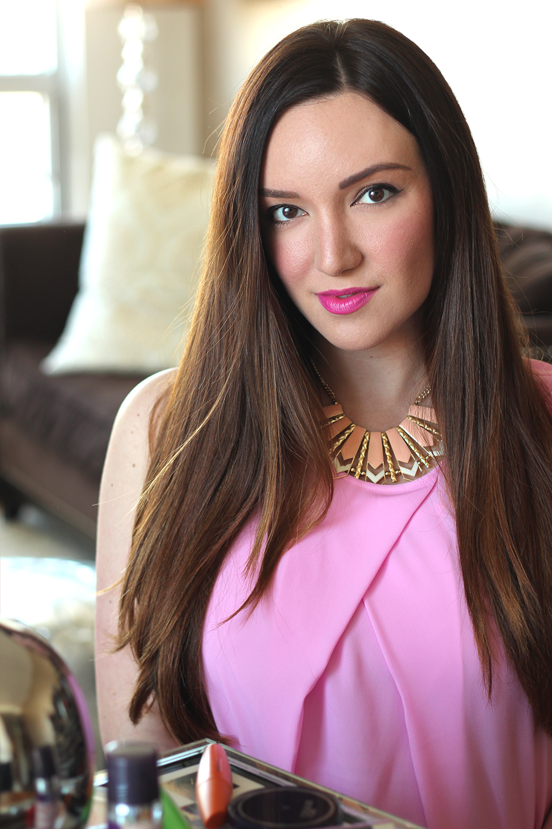 To complete my spring look in addition to my fresh-faced makeup, I opted for a powdery pink DKNY top in the softest chiffon ever and a gorgeous statement necklace from Emmajoy…I’m obessed with the peach chevrons! What tips and tricks do you guys have to update your spring beauty look? Which drugstore products do you swear by…I’d love to hear!