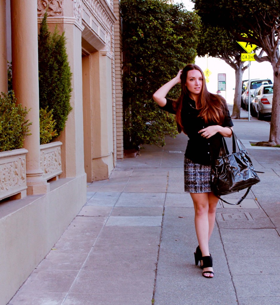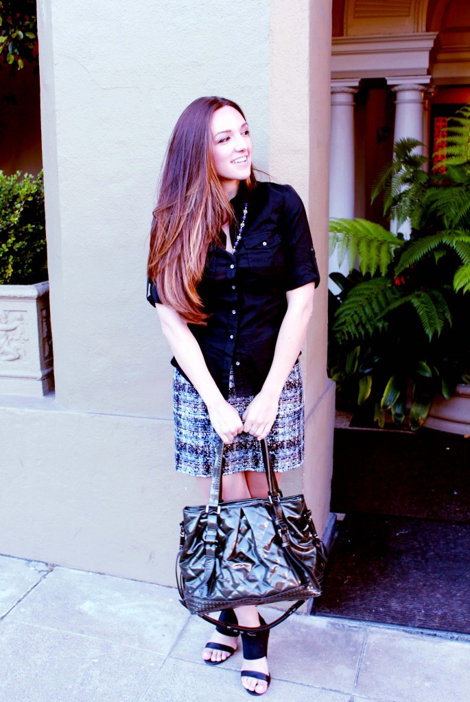Top: James Perse // Skirt: JCrew // Heels: Vince Camuto, similar here // Bag: Burberry // Necklace: JCrew // Nails: Essie Prima Ballerina