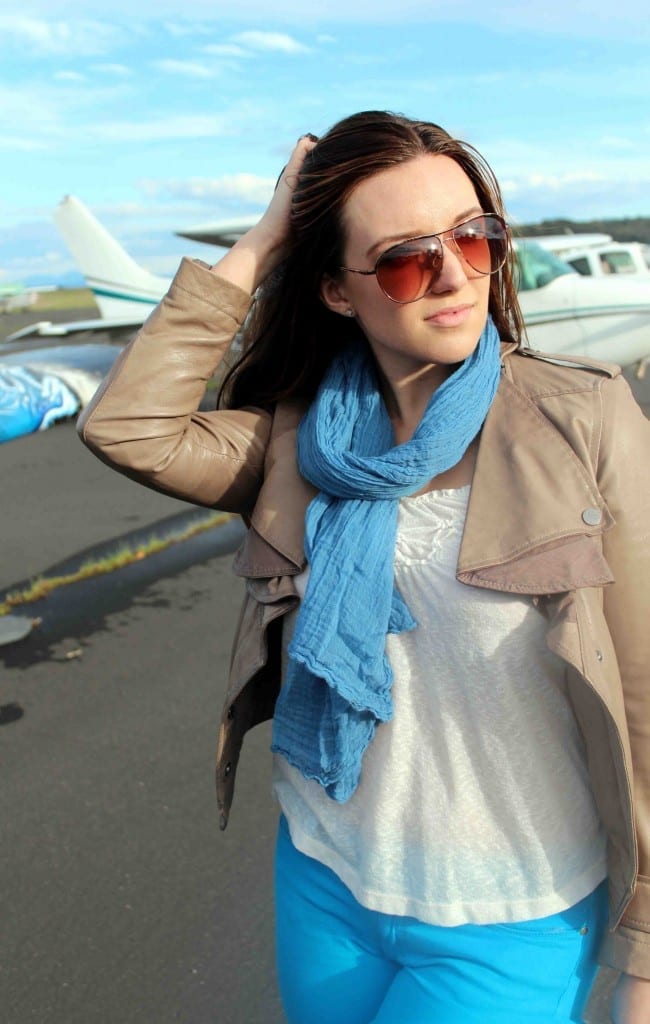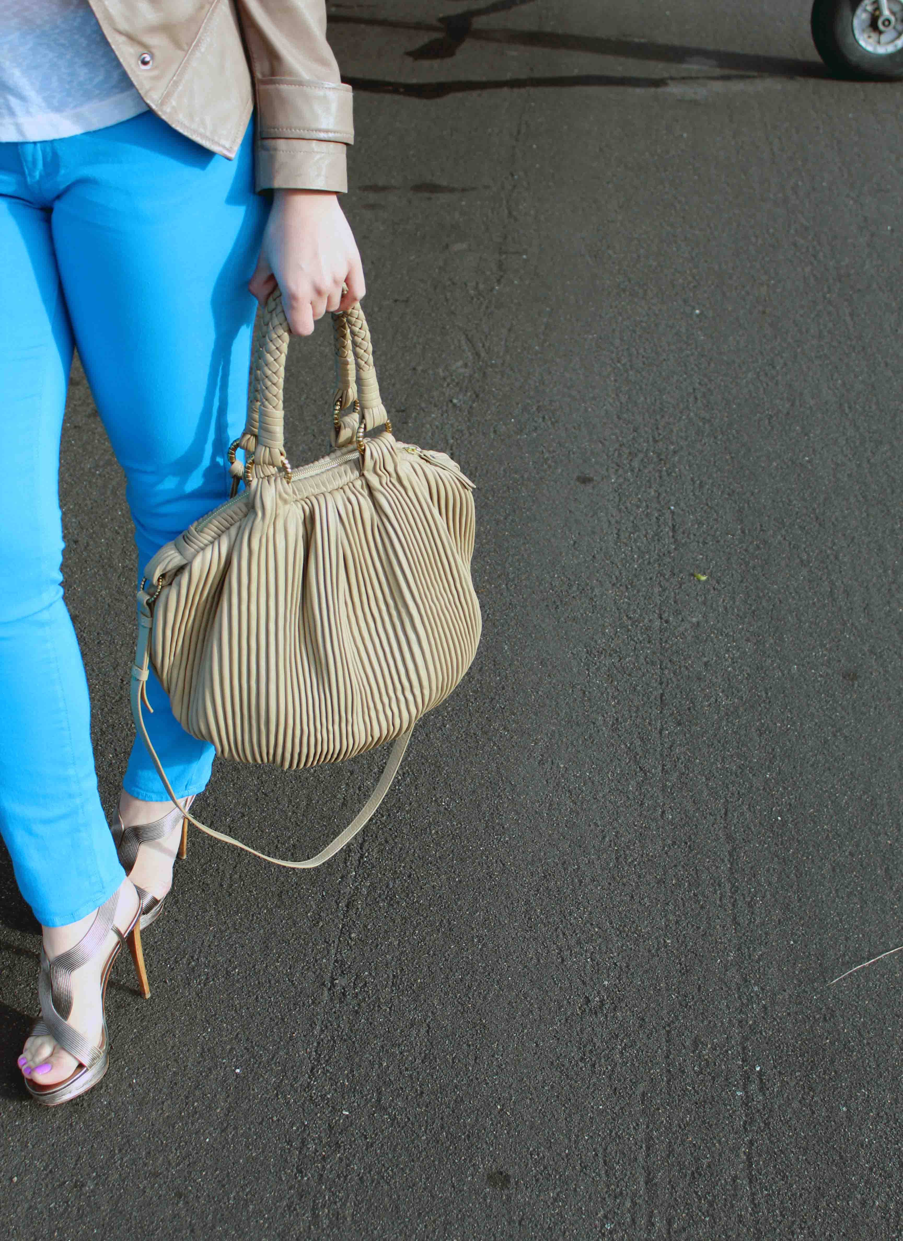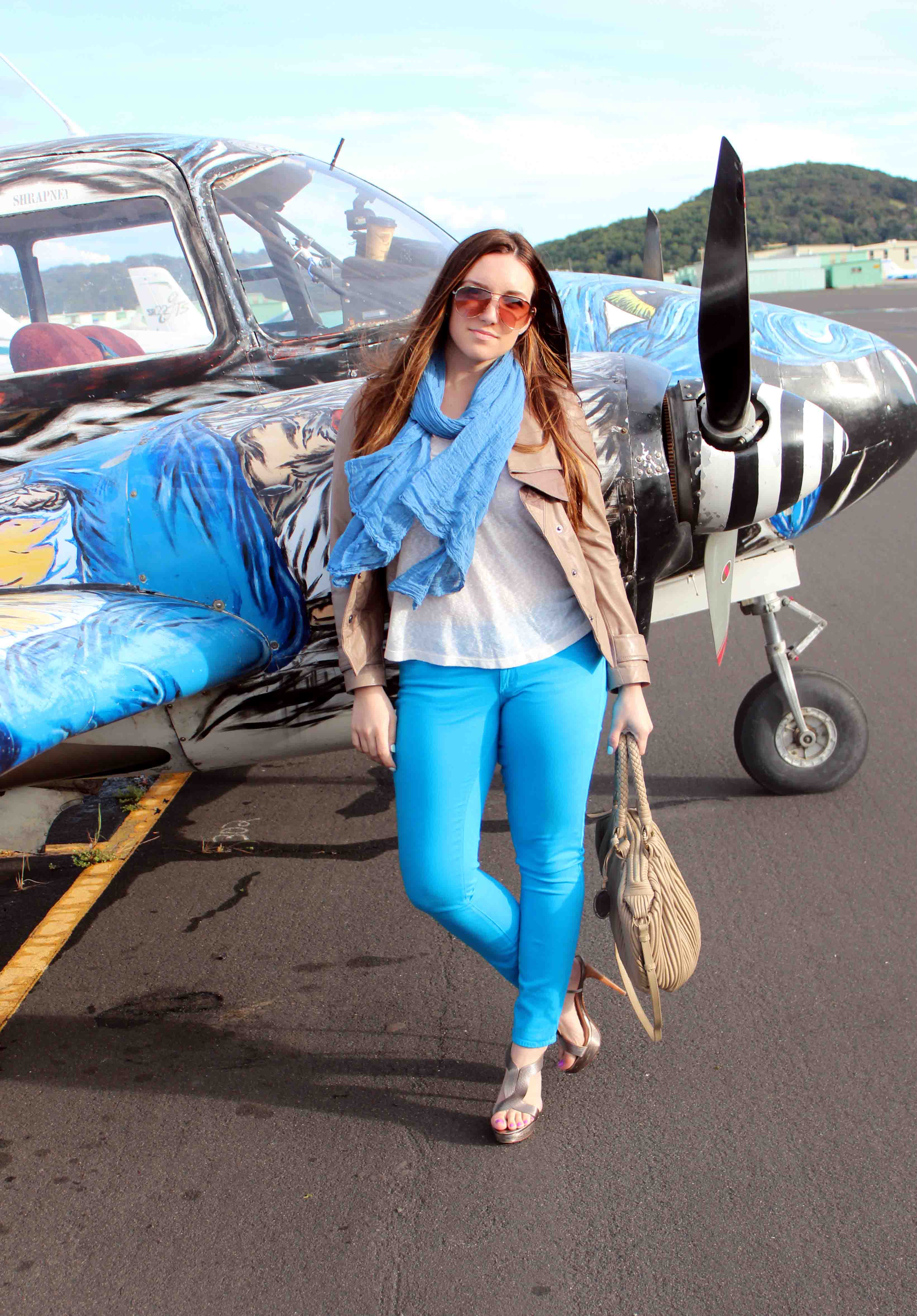 I love those bright colored pants for spring! And those are quite the heels for a plane ride! Good for you walking around in those during the day on a weekend. 🙂