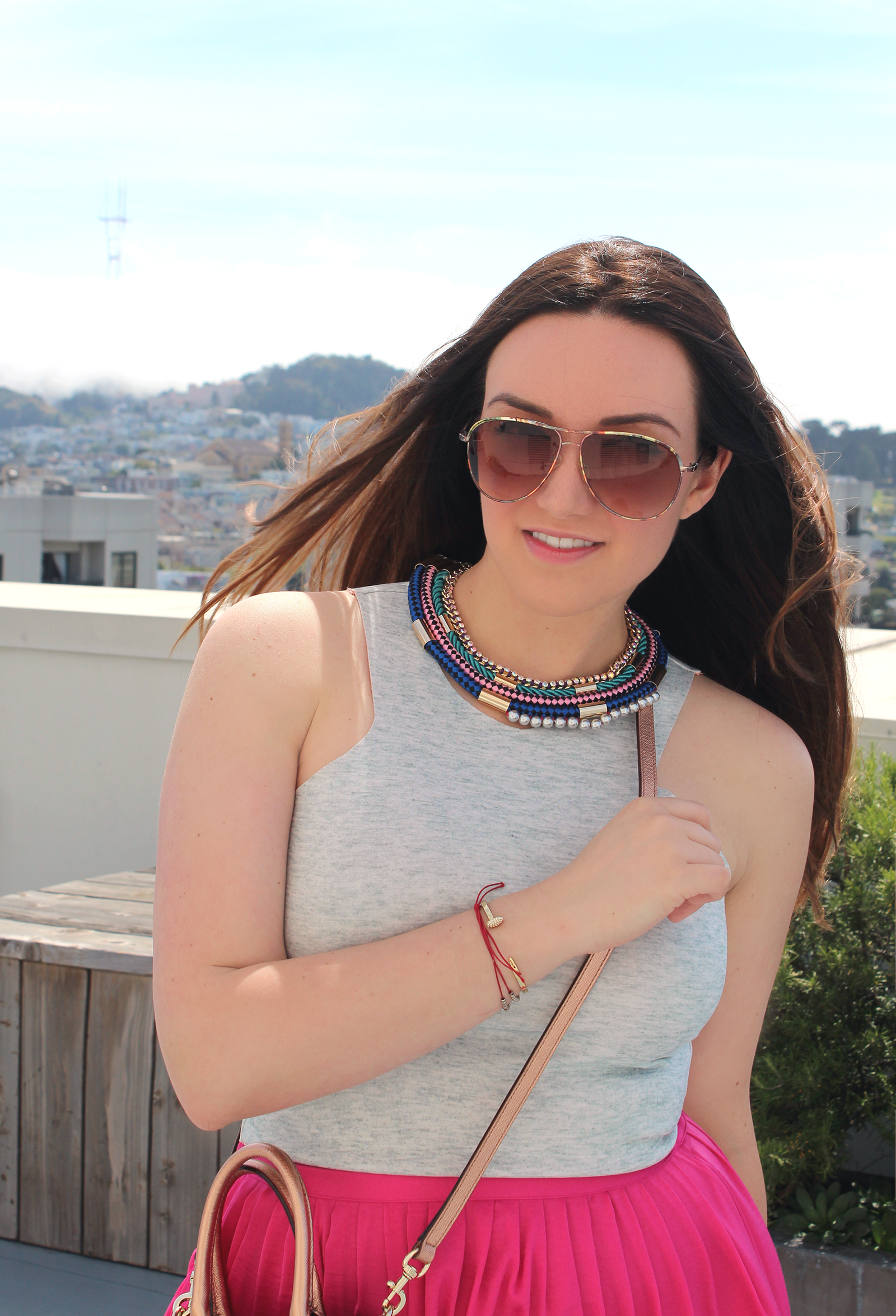 Top: Zara, similar style here // Skirt: BCBG Max Azria, similar here // Sandals: Vince Camuto // Bag: Rebecca Minkoff c/o // Bracelets: Giles & Brother, Topshop // Necklace: Nordstrom // Sunglasses: Topshop // Nails: Essie Mesmerize