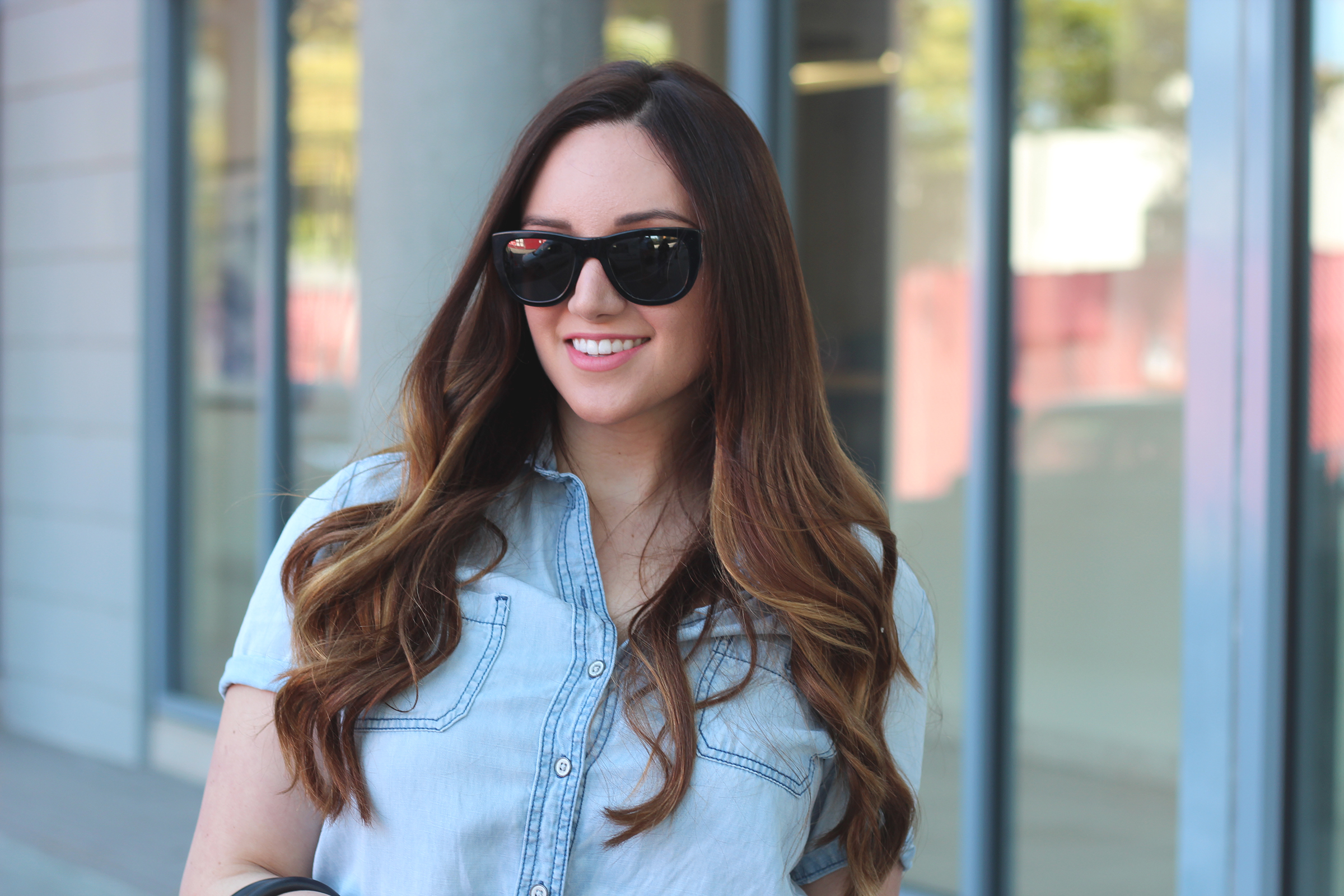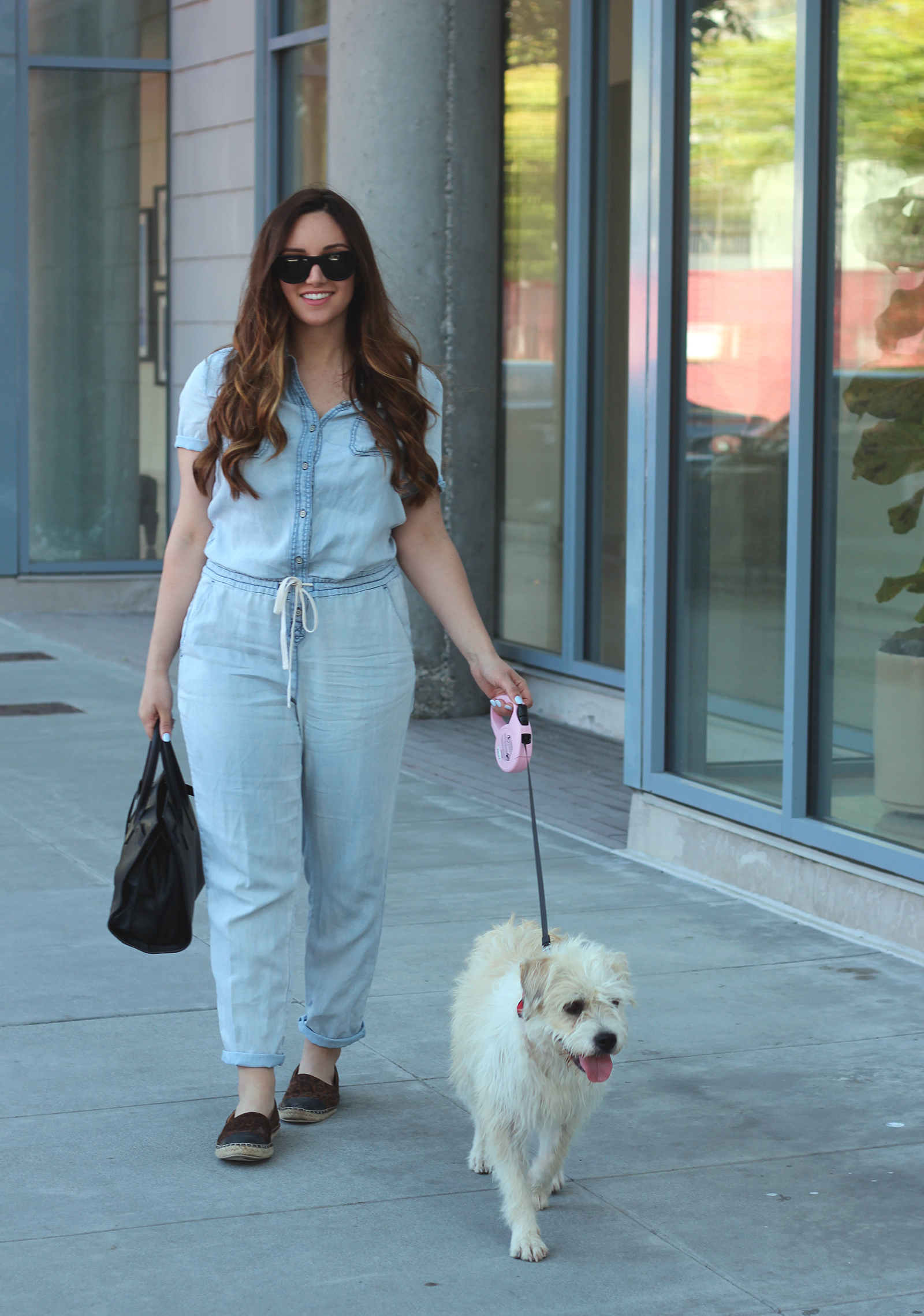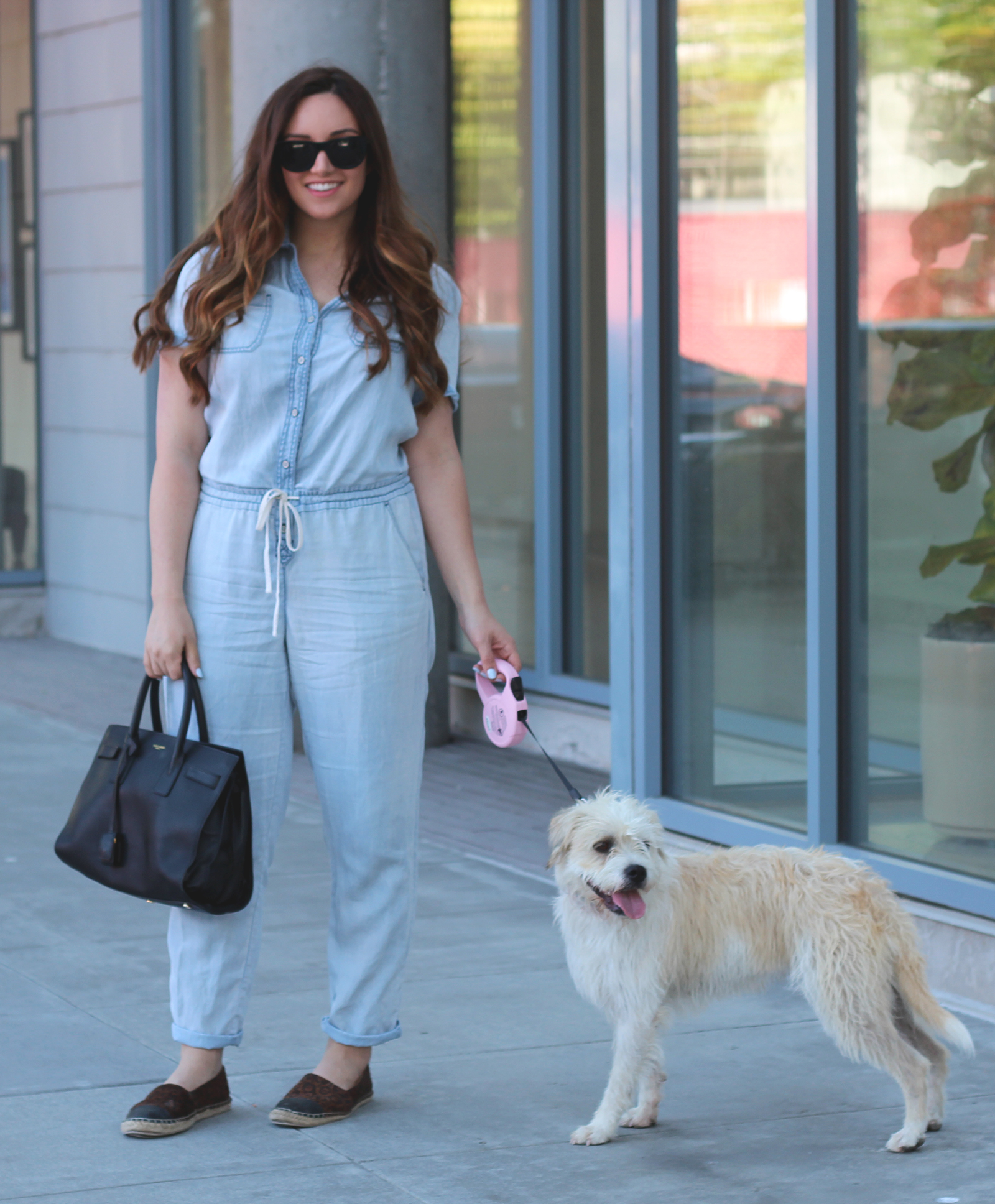 Before packing my bags, I look my little girl Lola to the dog park so she could play with her friends, chew on slobbery tennis balls, and roll around in the grass. I picked up this chambray jumpsuit a couple weeks ago and it has become SUCH a favorite of mine. When the weather gets warm I really like the idea of reaching for a one piece outfit, wether its a maxi dress or romper or jumpsuit. The drawstring waist is definitely an important detail. I tied it above my hips at the natural waist to make the casual suit more defining. It works for something as SUPER CASUAL as the dogpark, yet I can pair it with heels for my Target summer beauty video shoot a couple weeks back. Don’t you just love those versatile pieces?