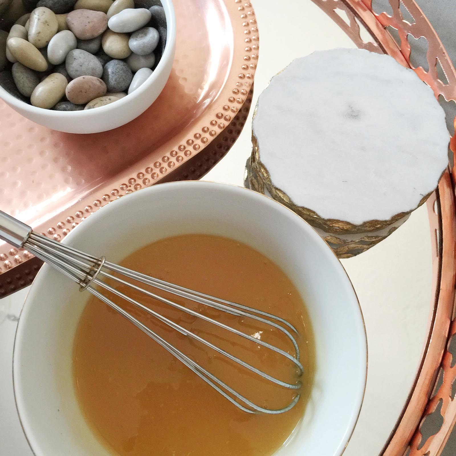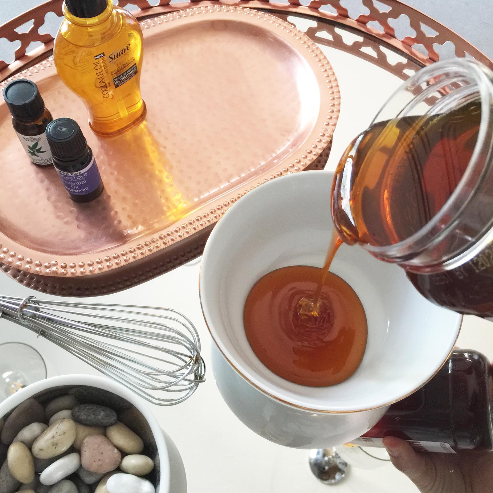 Next, add your coconut oil in equal portions to your honey. If you used a 1/2 cup of honey, use a 1/2 cup of coconut oil. Since I was making extra scalp treatment to save for future uses, I ended up using the entire bottle. Also add in a few drops of essential oils! I really like the texture of this Suave oil since it is super hydrating!