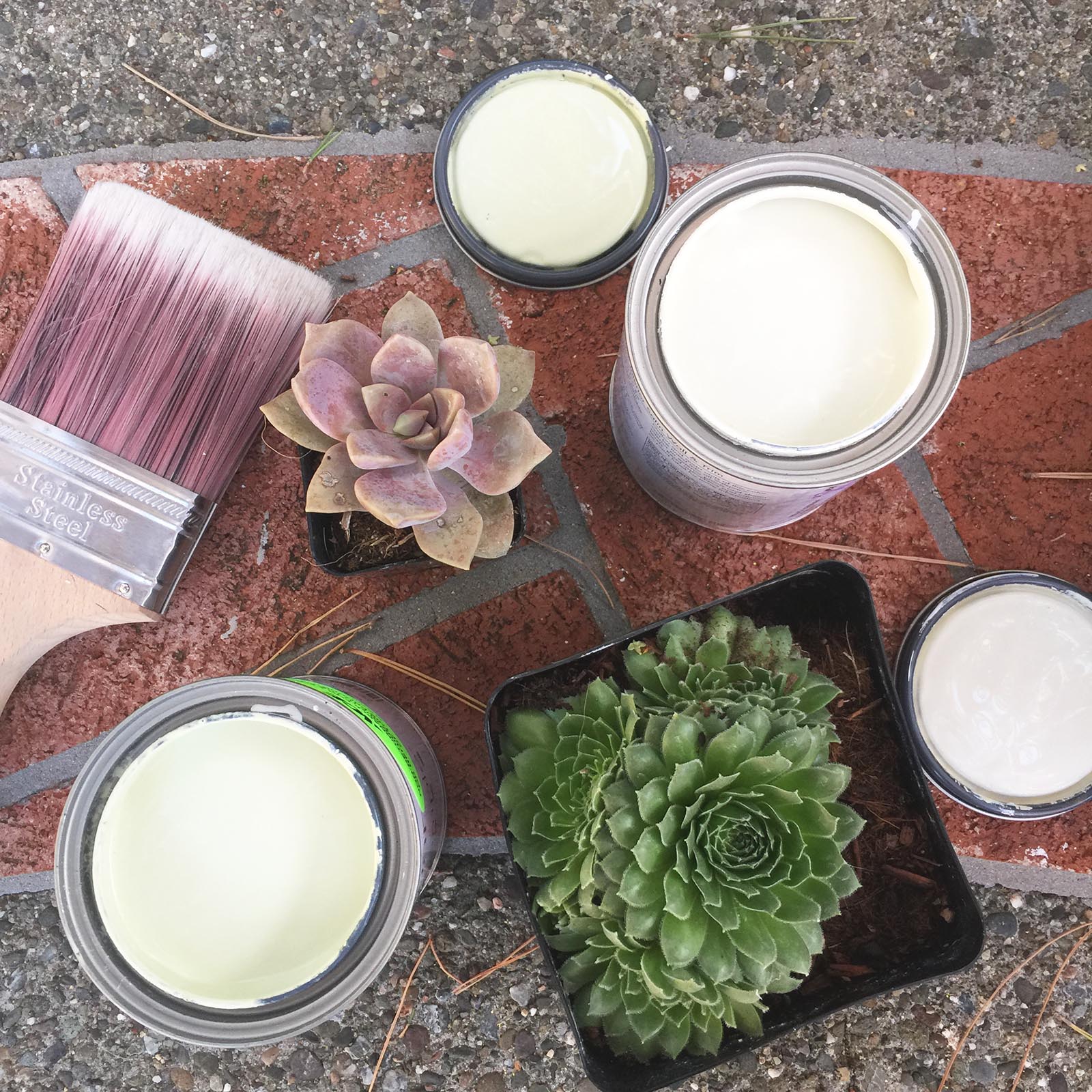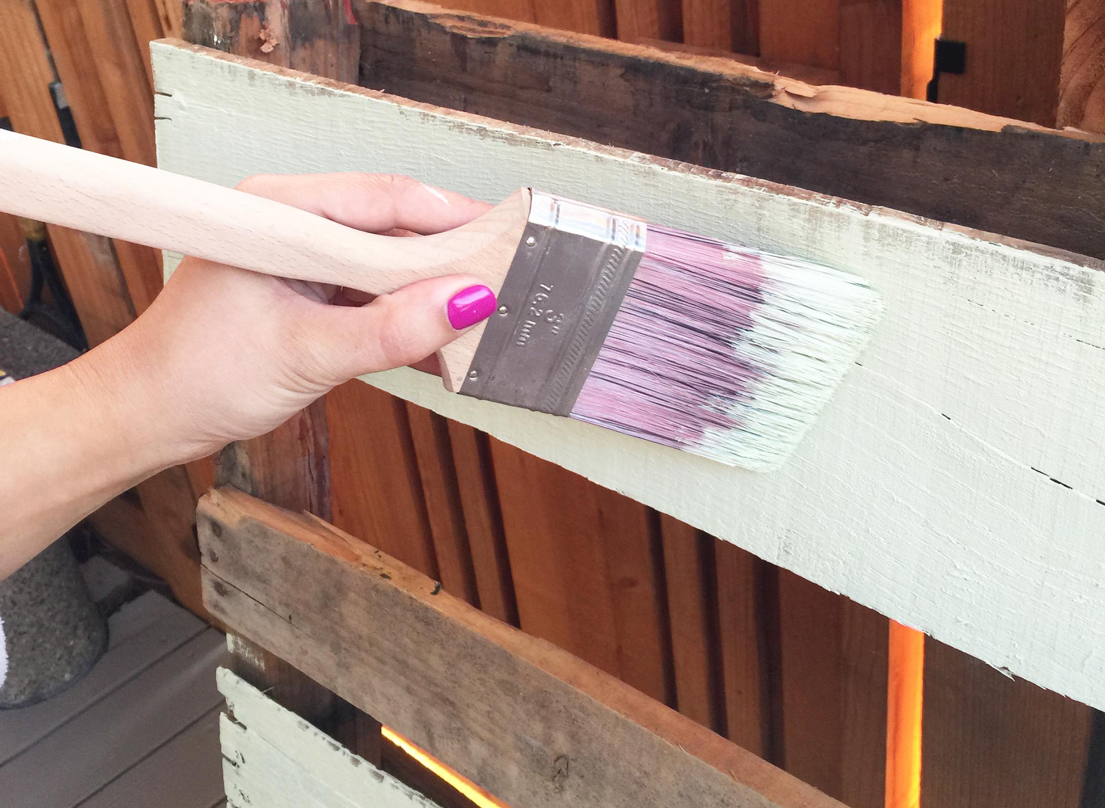 Next, I popped open my paint pints to get started in transforming my pallet from raw wood to a soft green color, perfect for my backyard. I picked up these small pints at my local Ace Hardware during their 99 cent paint pint sale (usually they are full price at about $5 per pint) so I decided to splurge and get two different colors. I think selecting the colors was the hardest part about creating my succulent wall because there were SO MANY to choose from, but I was really happy with my two selections. I wanted a rustic look so I applied thin layers of ‘Tea Party’ to the pallet in hard strokes to give a vintage and worn down look to it. I wanted it to look a bit imperfect so it was really easy to dab a little paint here and a little paint there.