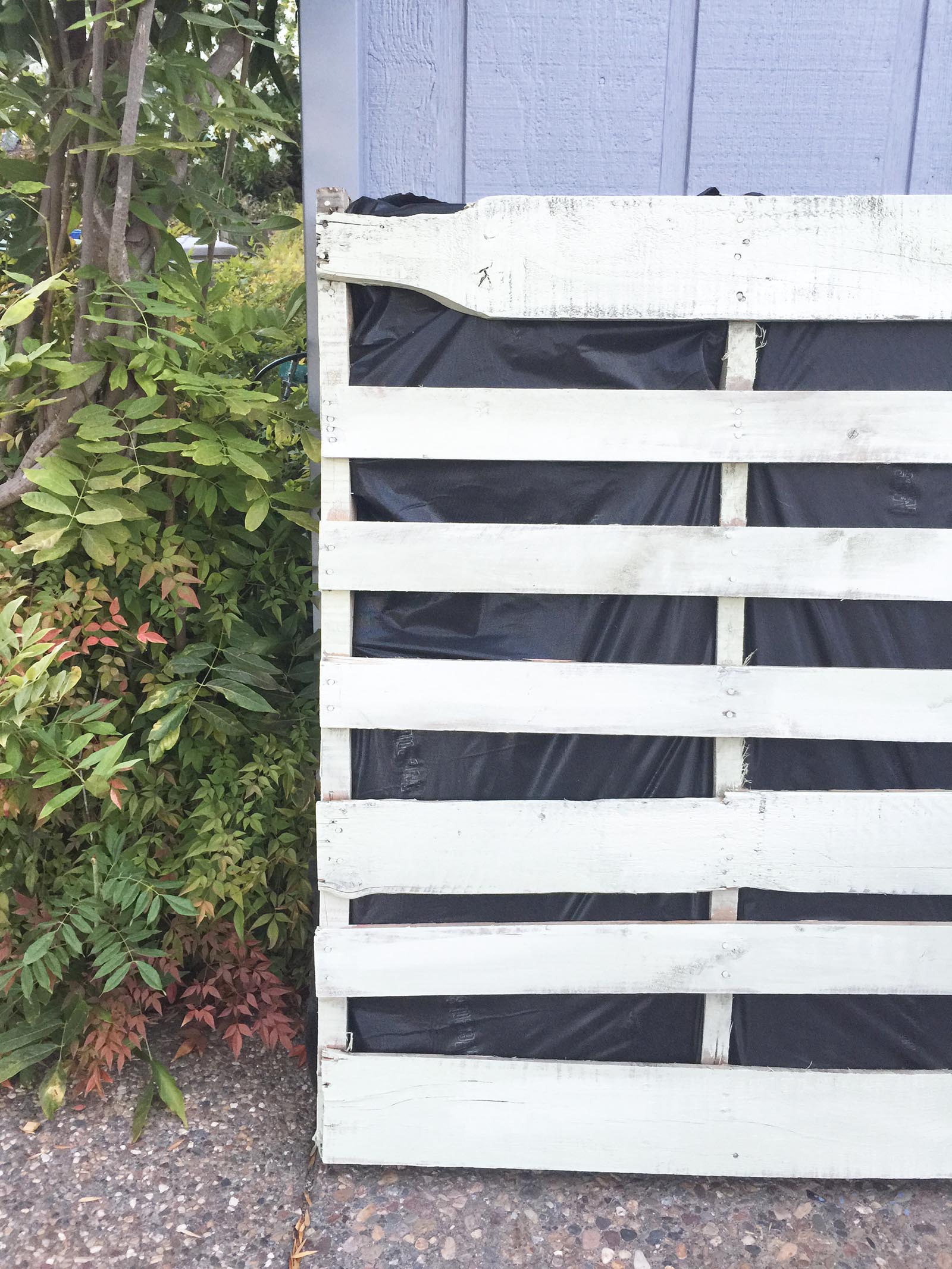Once the pallet dries, line the inside with landscaping fabric and use a staple gun to secure to each beam of wood so that it forms a pocket inside the pallet. Make sure to use more staples than you think so you have a tight seal.