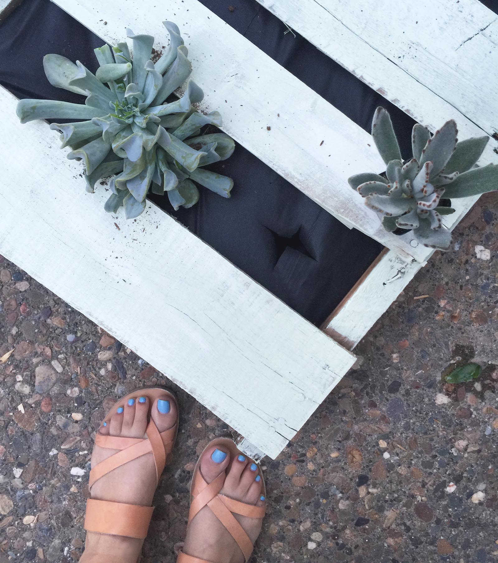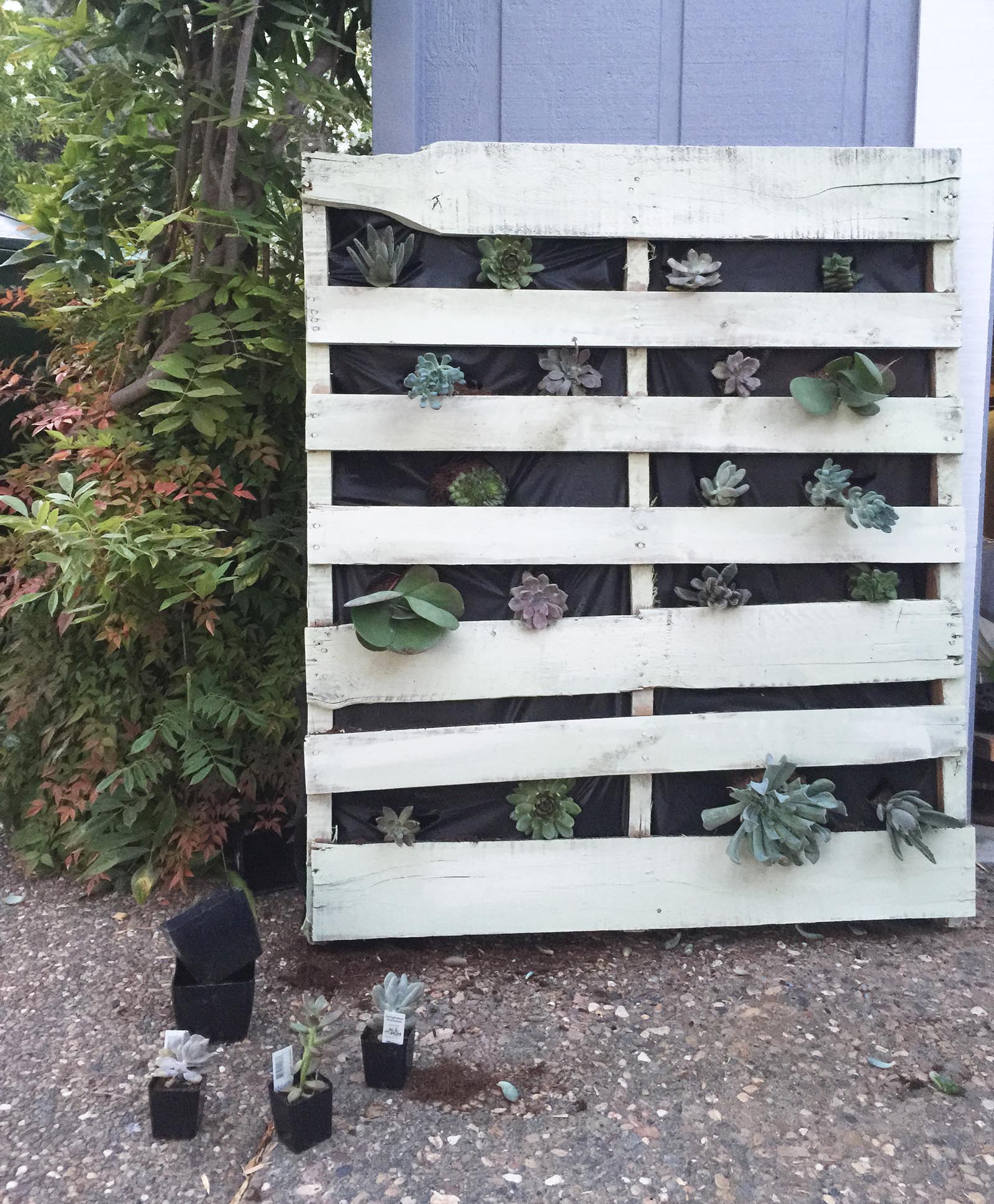 Once all succulents are placed, stand up the pallet and secure the top opening with staples and close the landscaping fabric pocket. I learned a lesson here that you’ll end up needing more succulents than you think (unfortunately Ace was closed by the time I realized this — picking up some more this weekend!). Over the next few weeks, the succulents will take root into the soil and begin to grow with their weekly watering. You can add or swap out succulents easily by making additional holes in the landscaping fabric.