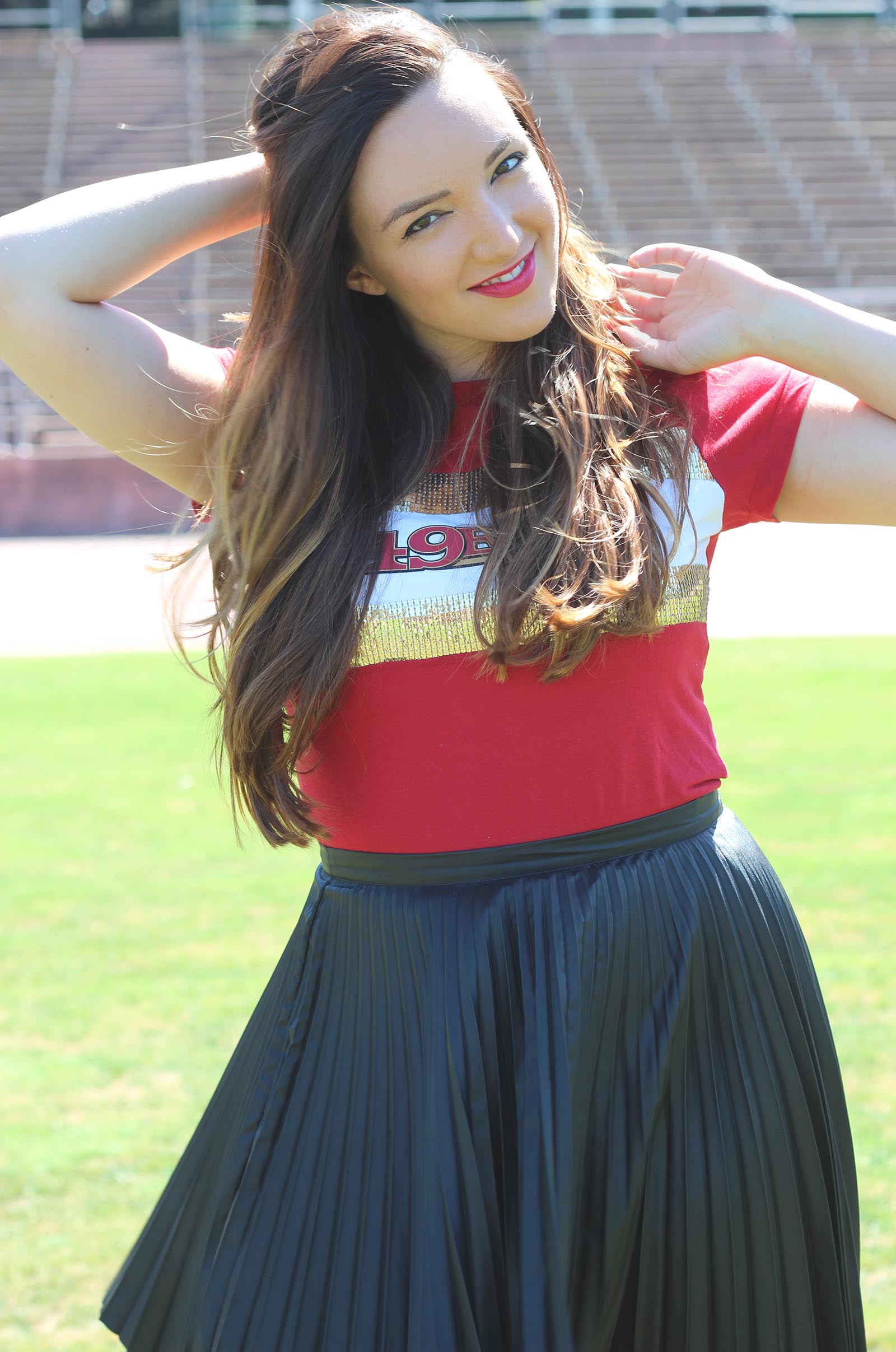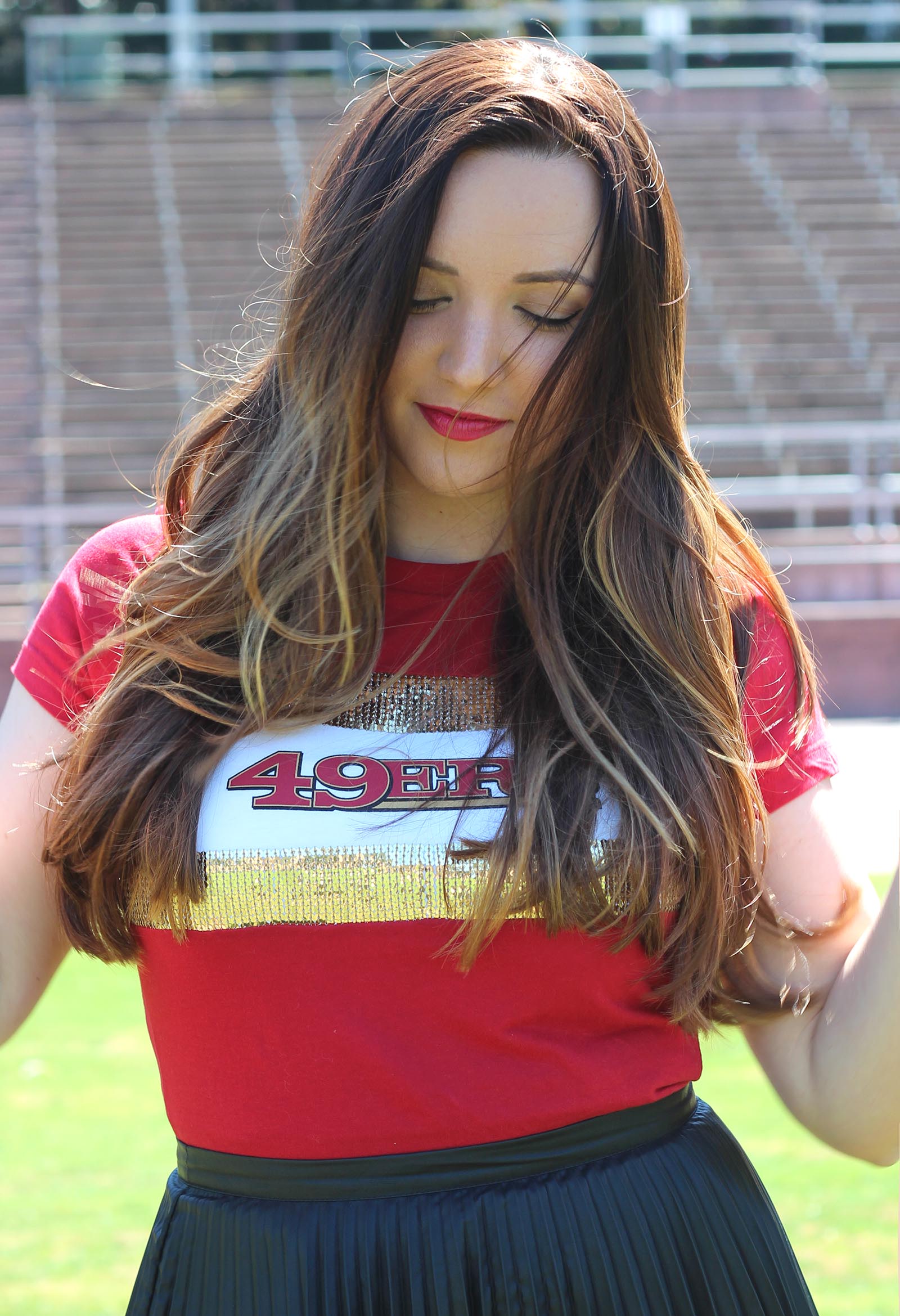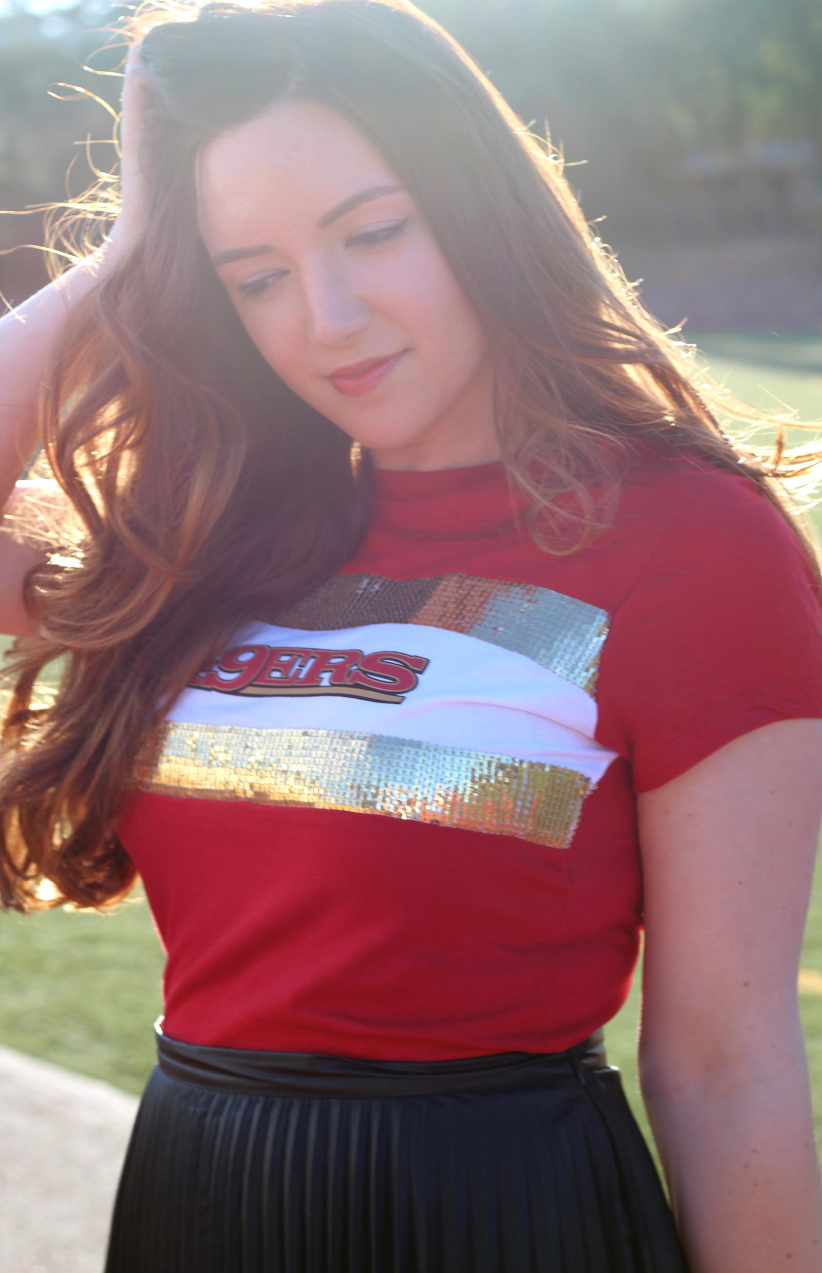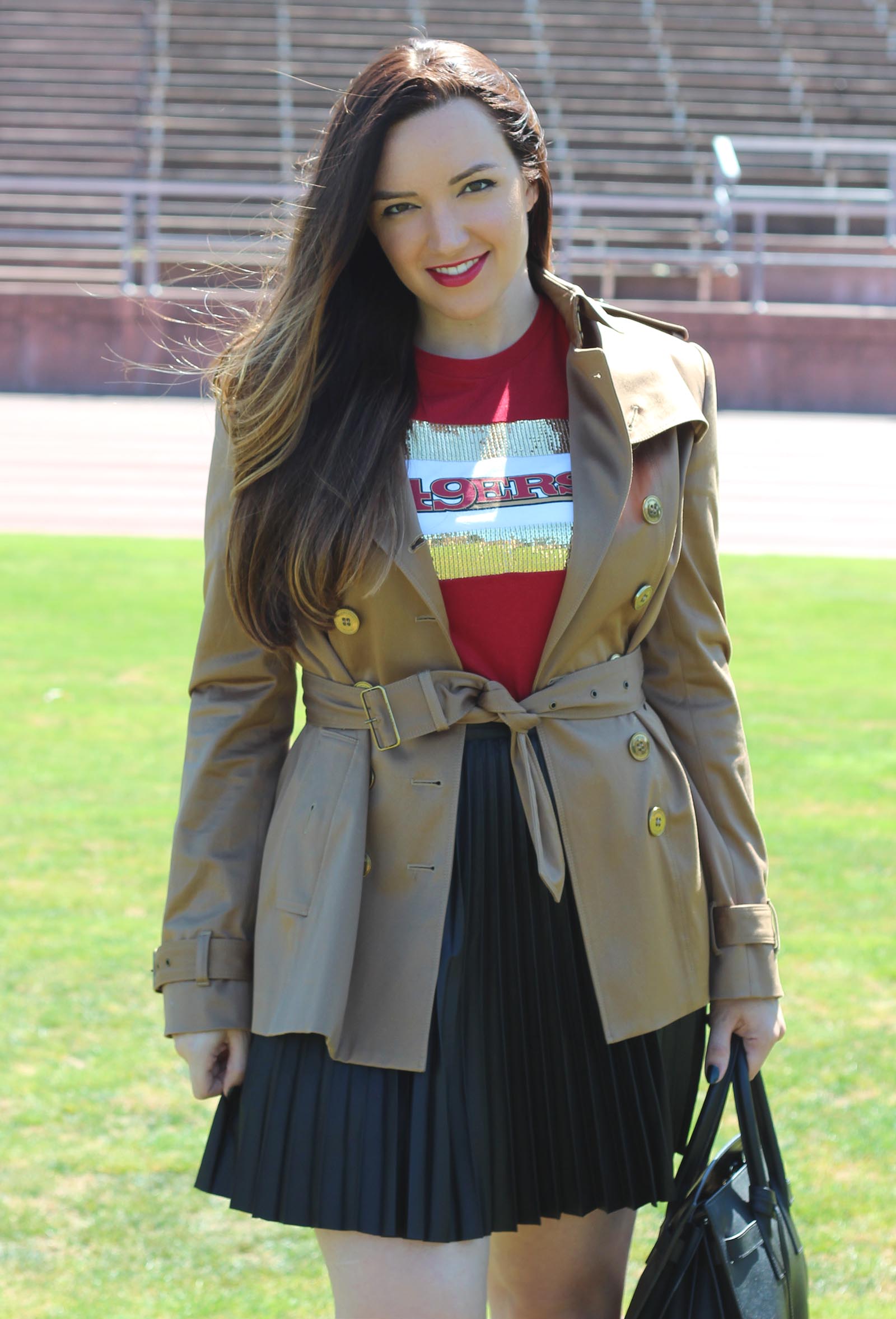 Being a San Francisco girl, the 49ers are obviously my team and its fun to dress up a bit to celebrate the games. It’s such a fun feeling to get together with friends and huddle around the TV–at home, at a bar, or ideally at the new stadium (I’ve been and its amazing!)–and even better to serve up football with a little style! For game day, I like the idea of incorporating my team’s apparel and then giving it a touch of glam and girly so that it’s ‘me’. I actually didn’t realize this top was sequinned when I ordered it online but it definitely gives it an extra dose of sparkle, and is a nice addition to my Burberry trench. Dressing sporty and supporting your team doesn’t mean you have to sacrifice your own personal style, and I love that!