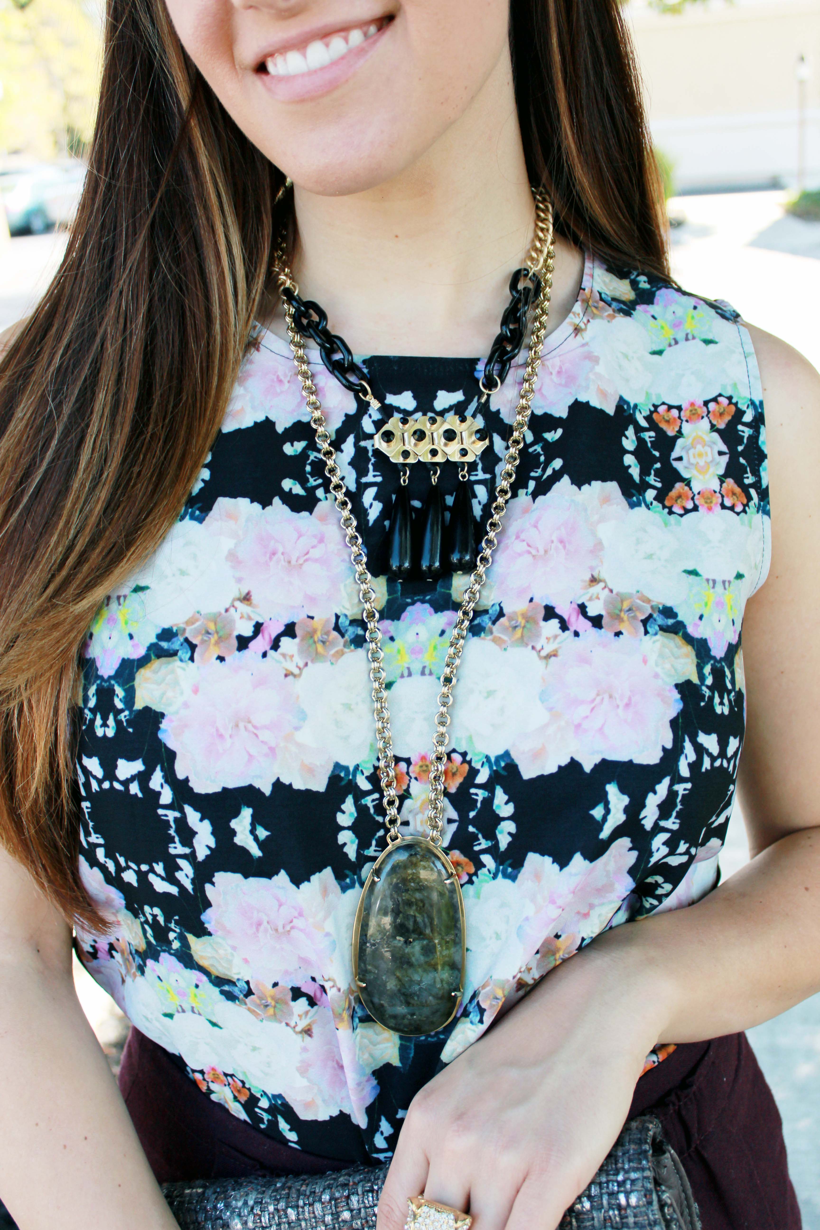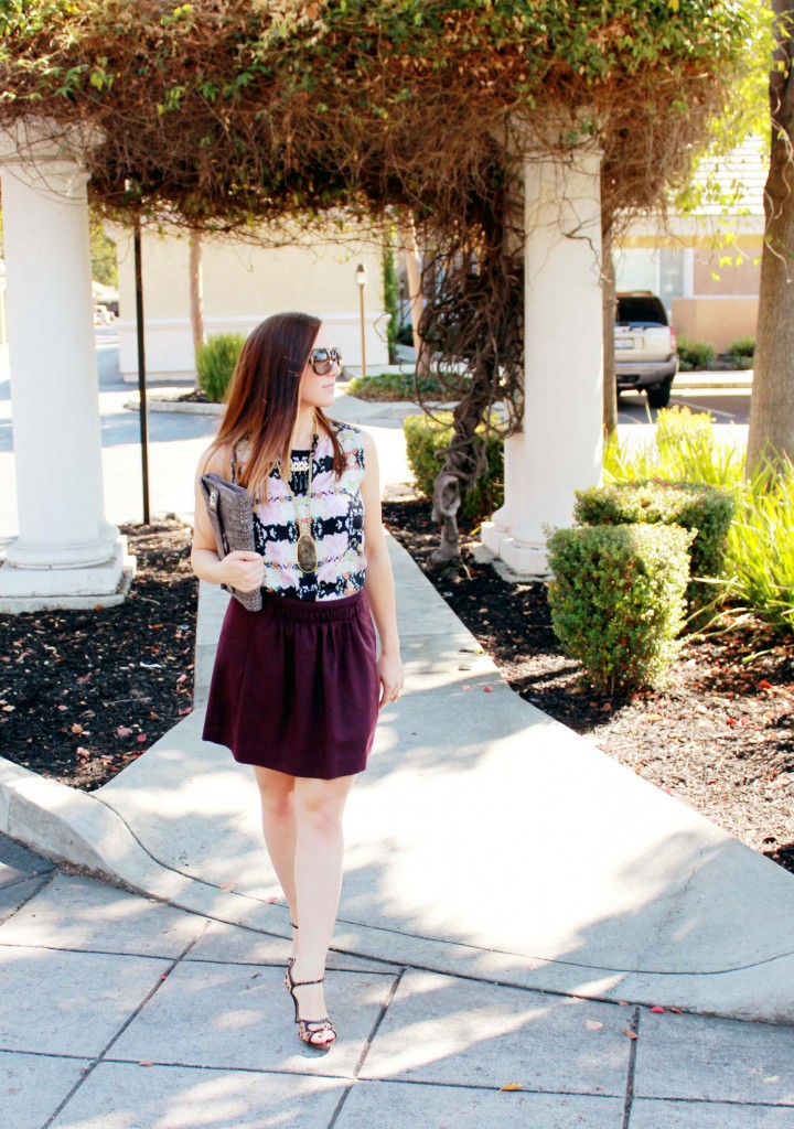 Jen, kaleidoscopic prints add a flirty fun touch to a simple outfit. Great pairing with the oxblood skirt and that statement necklace.