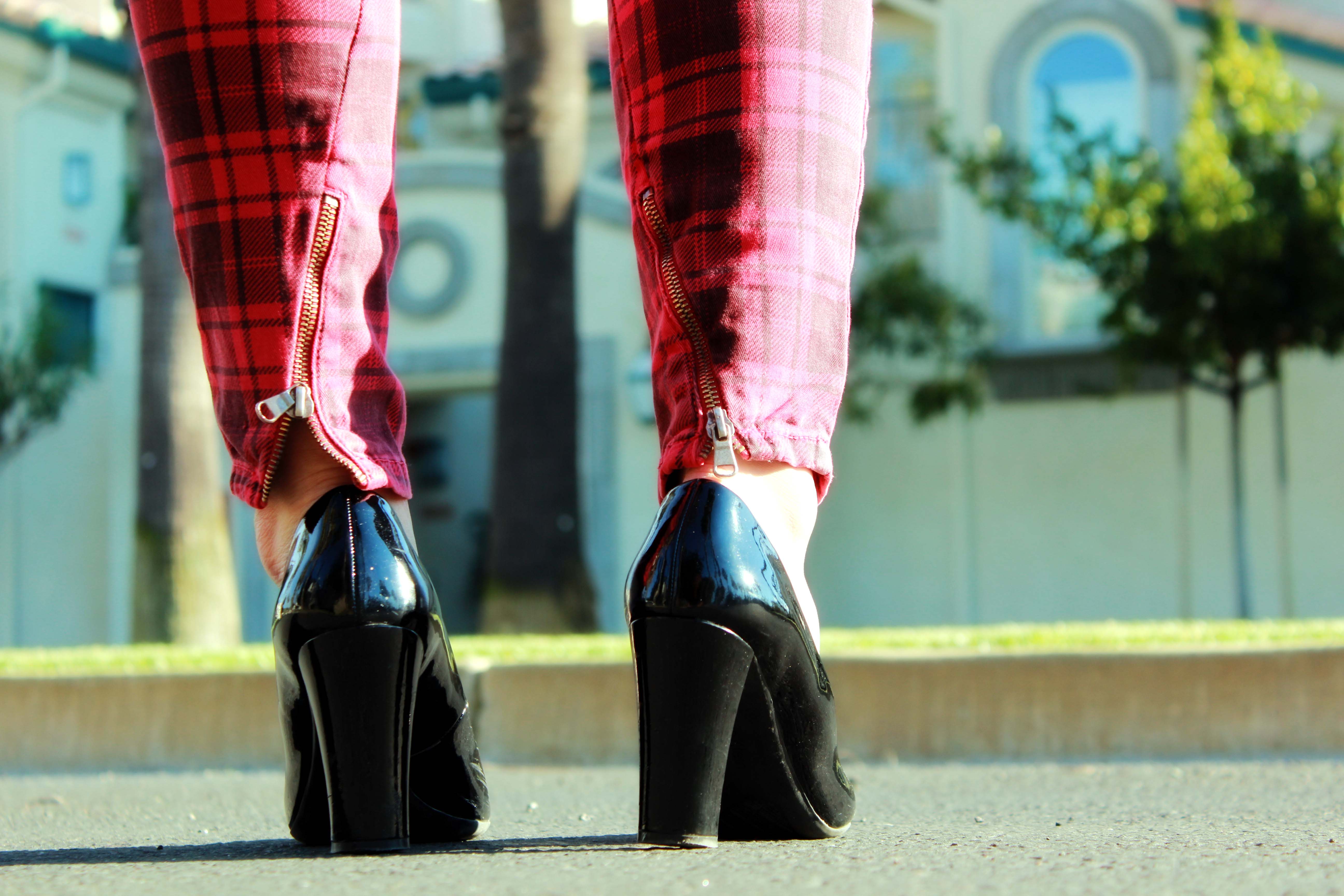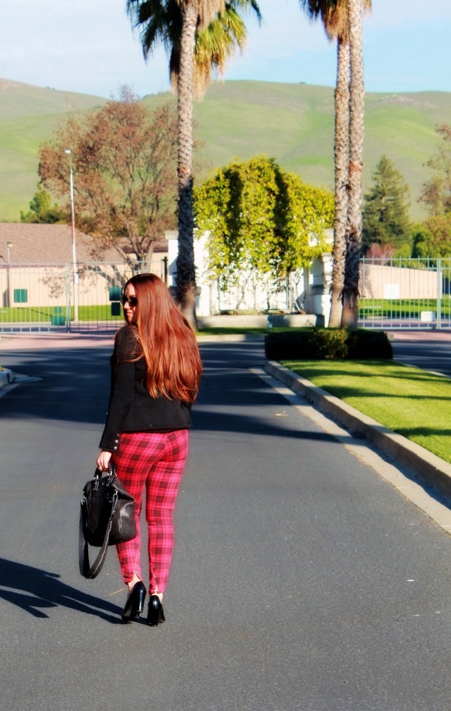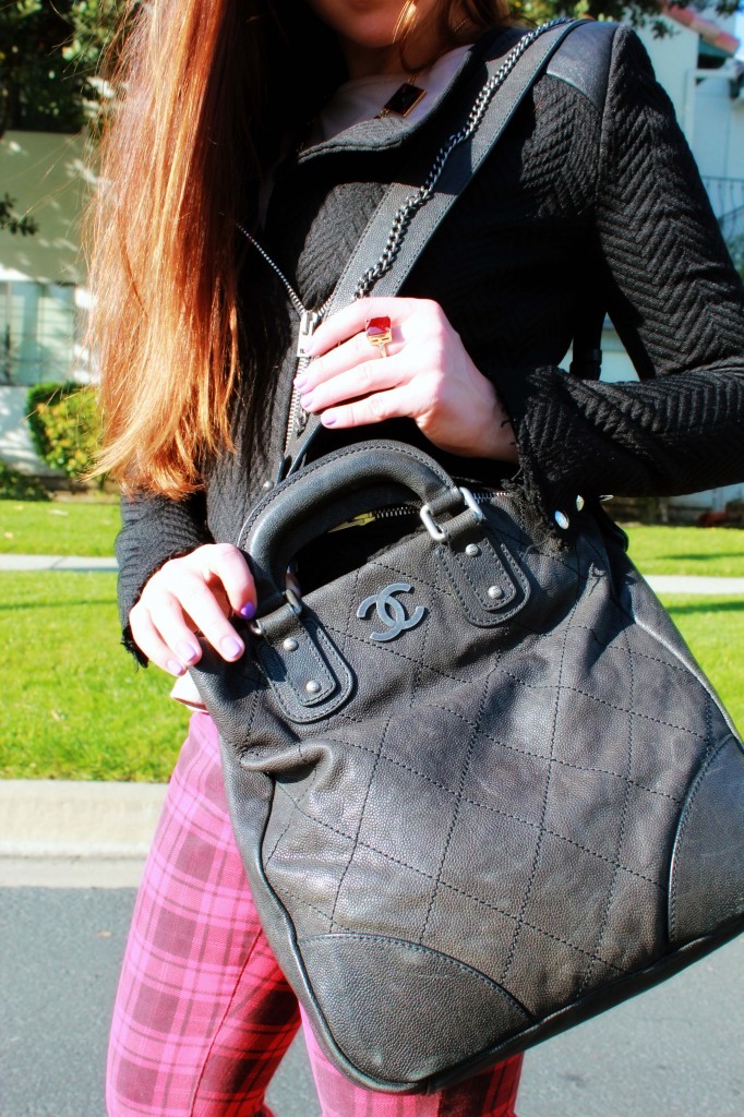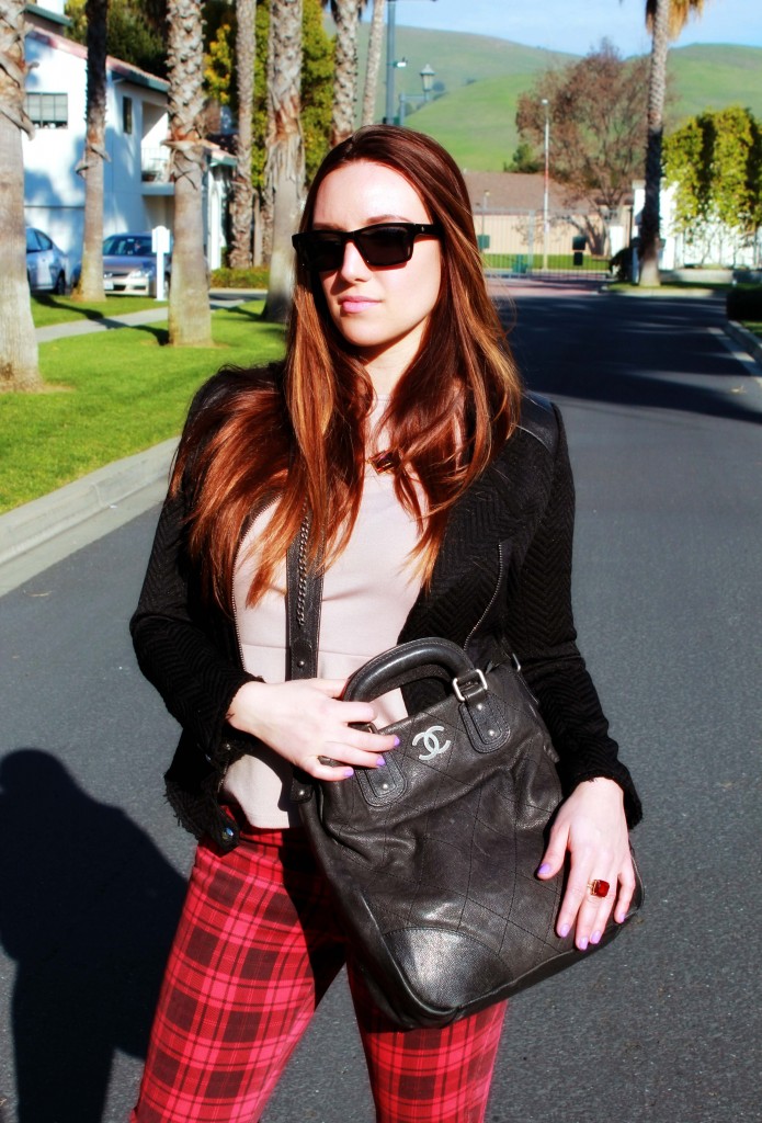 Yes, yes…I am mad for plaid! I especially like the way red plaid looks paired up with rock-inspired pieces, like patent leather pumps and a motorcycle jacket. Throwing on a black leather and chain adorned Chanel bag and my favorite go to sunglasses doesn’t hurt to glam up my very edgy Kate Moss look. One part plaid, two parts leather–all parts glam rock!
