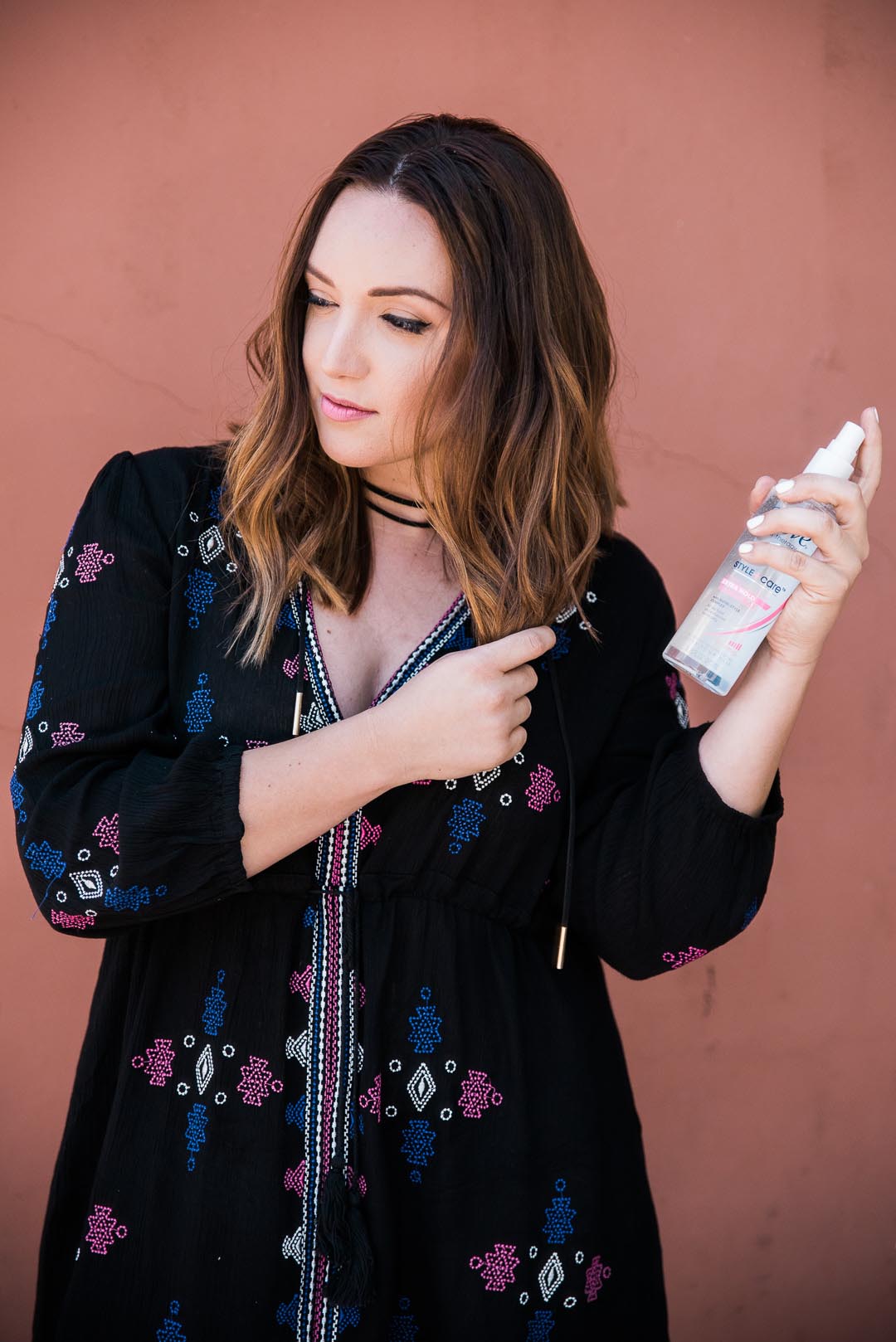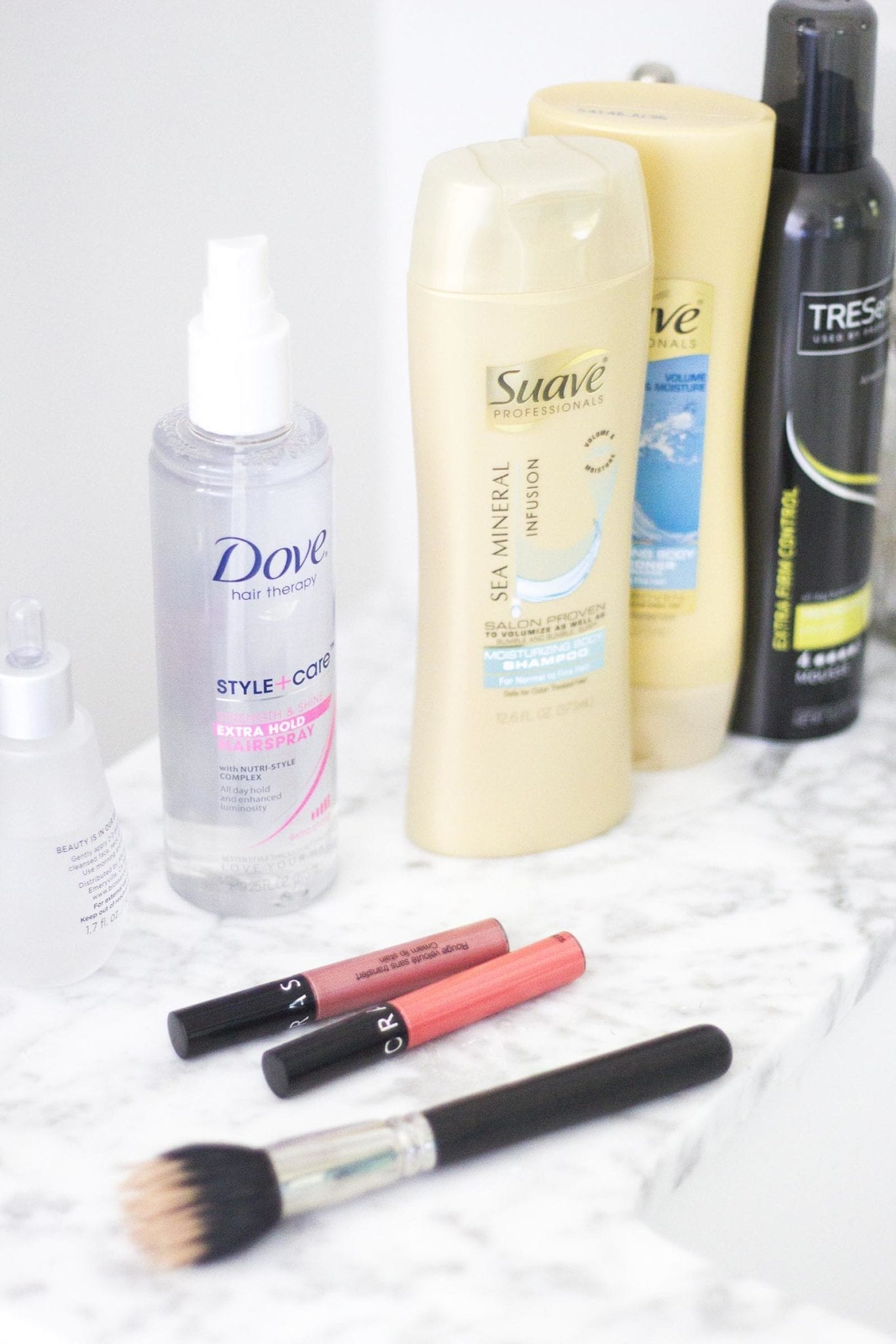 When I’m doing my hair and dealing with the heat, I’m not looking to spend tons of time perfecting curling or putting a wave in my hair because it can disappear so easily. I picked up some new drugstore products to try out on a recent Kroger trip–Suave Mineral Infusion shampoo and conditioner, TRESemme mousse for some extra hot-defying body, and Dove Style+Care spray to hold my waves in place (plus, let’s be honest, I love the packaging!). I typically prefer purchasing more affordable hair products because I go through about a bottle of shampoo and conditioner every two weeks so I’m not about to spend a ton. I like this Suave shampoo and conditioner duo because it has this awesome fresh scent and is so afordable–me likey! Since the heat is causing my waves to disappear, I style my hair as usual and add a few spritzes of Dove hairspray for that extra lock on my style.