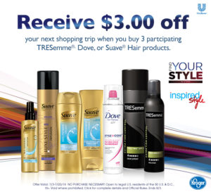 Want to create this look for yourself? Buy 3 participating TRESemme, Dove, or Suave hair products at Kroger and receive $3.00 off next shopping trip July 3rd through 20th!