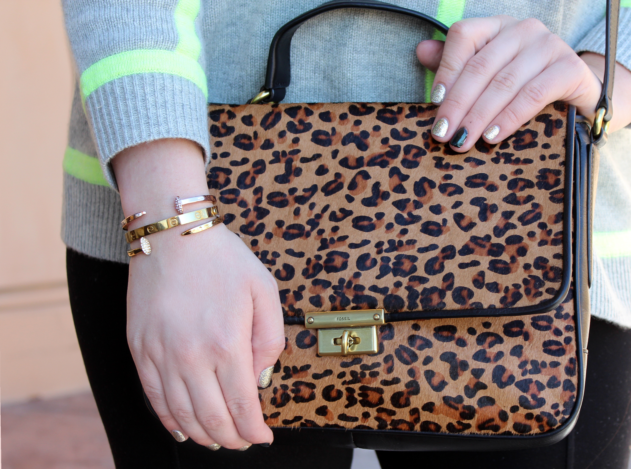 Great look – I love that fun sweater paired with the chic animal print bag. Lovely!