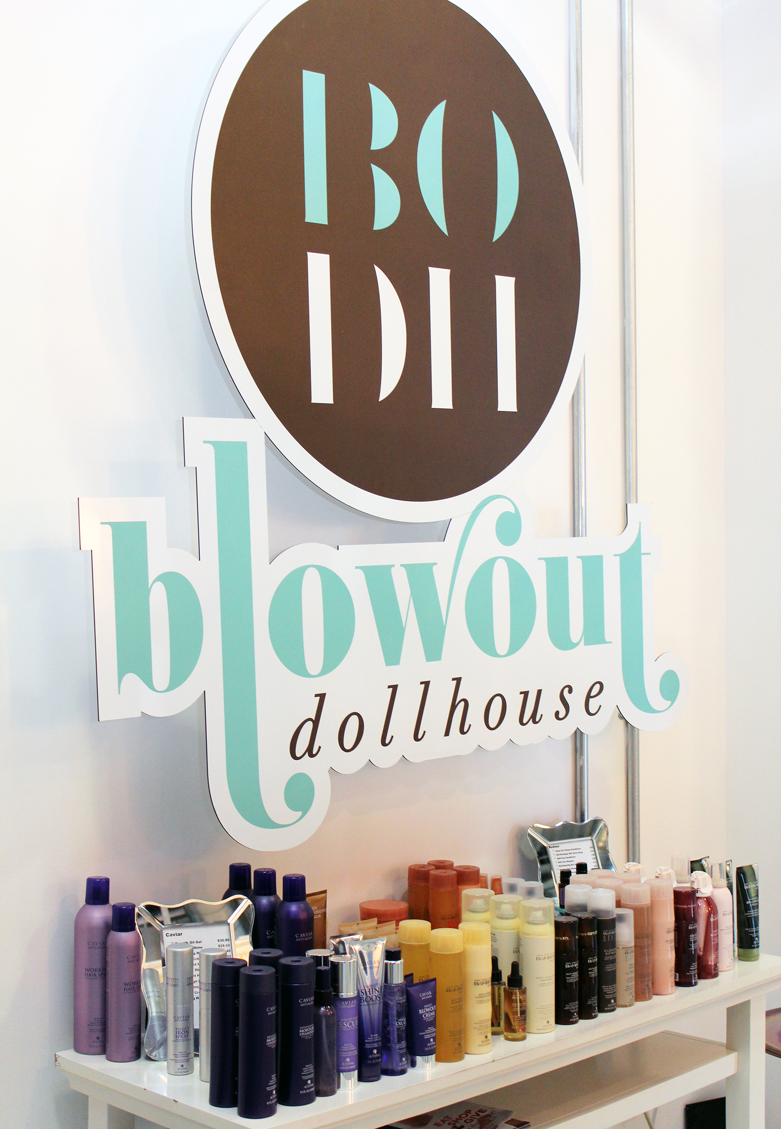 Outside of the salon, a Blowout Dollhouse branded step-and-repeat wall is just begging for a photo opportunity to show off major curls.
