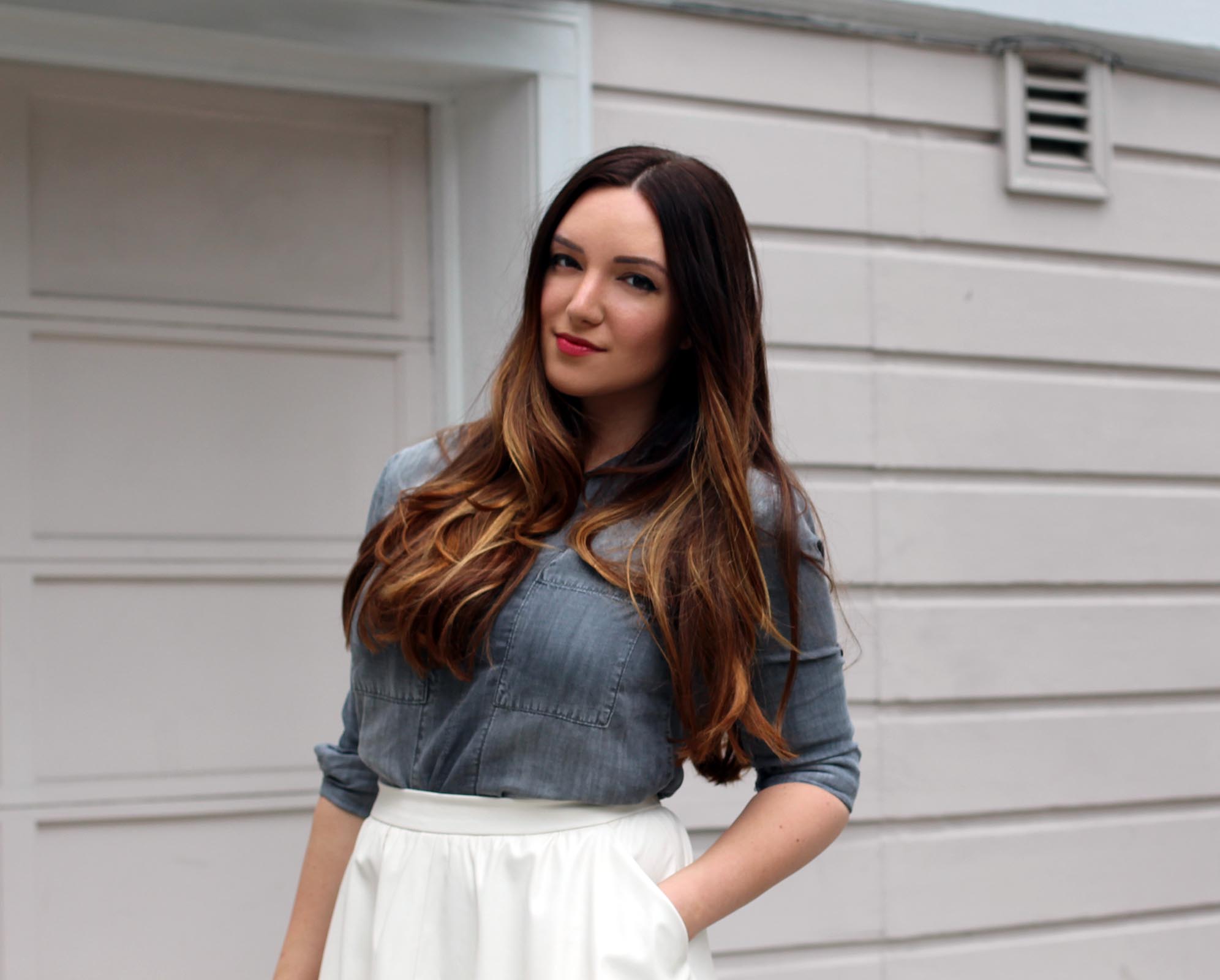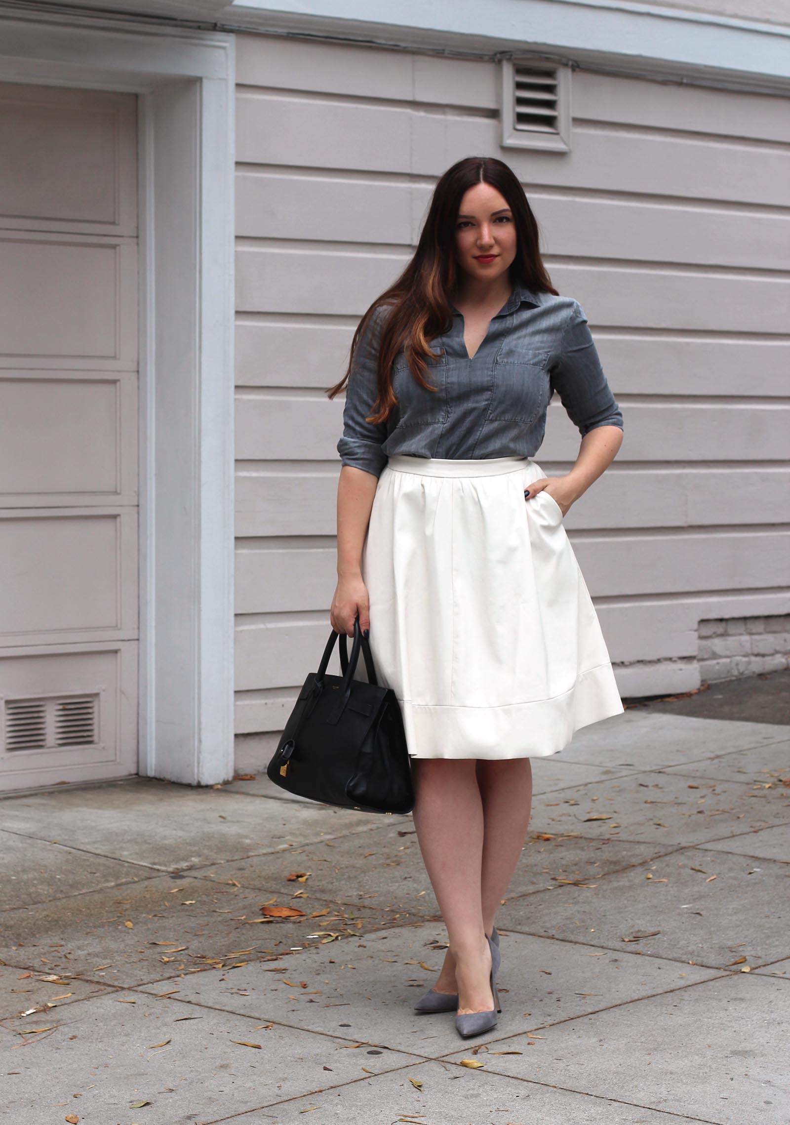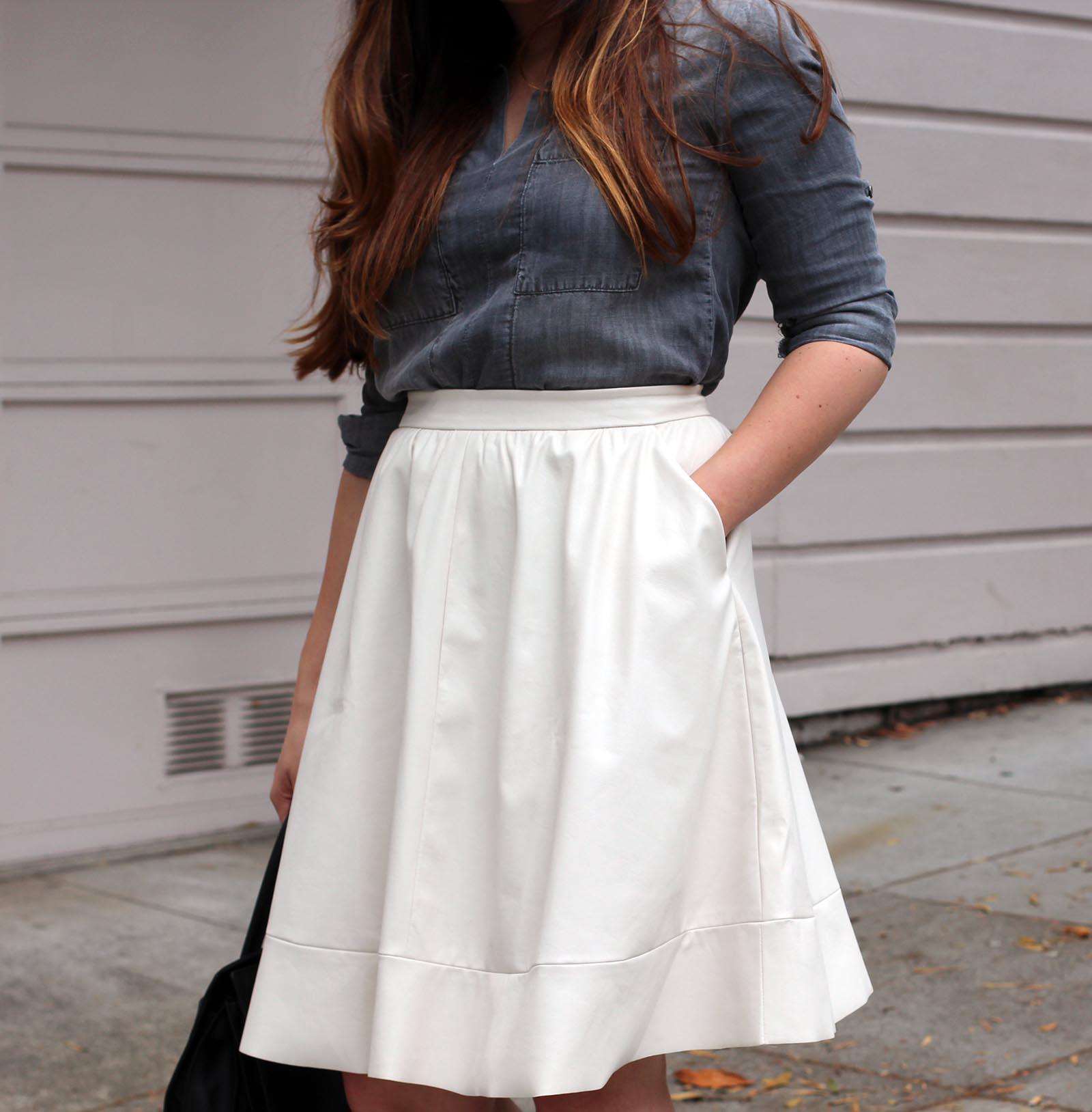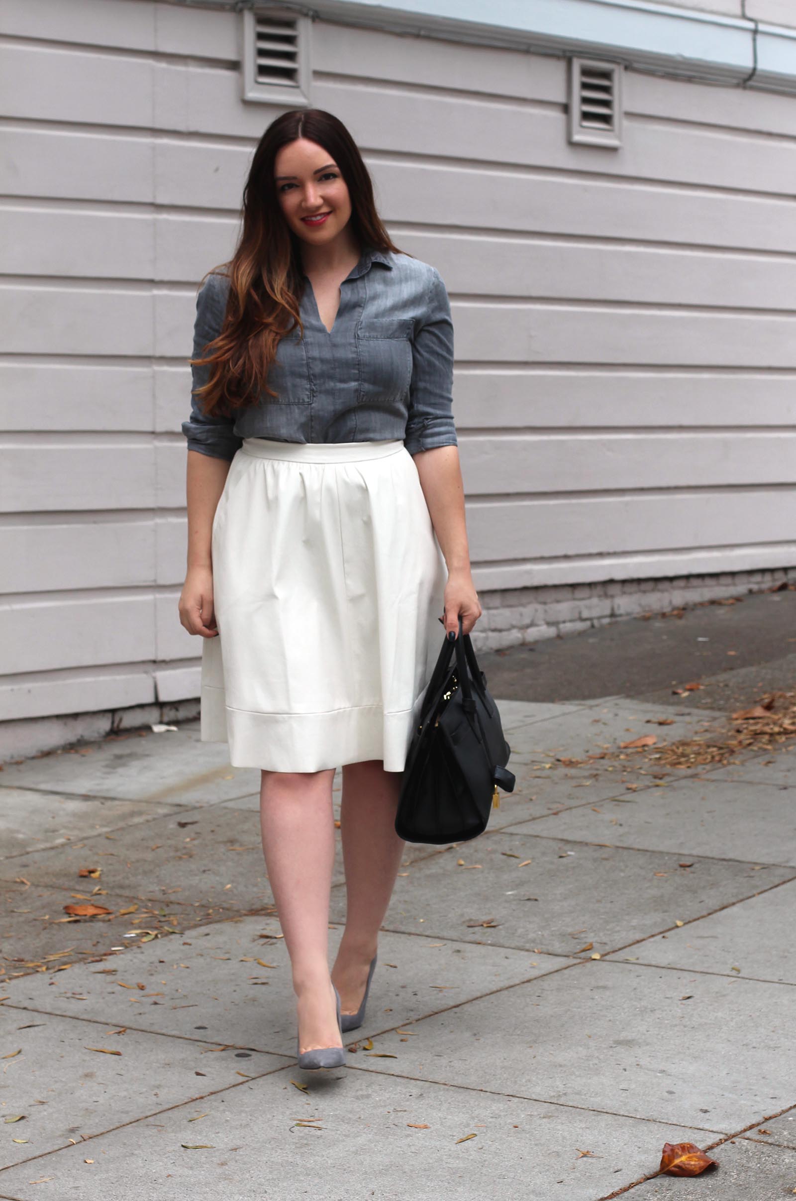 One of my favorite looks is an A-line skirt that has a lot of movement to it. I picked this up a few weeks ago and surprisingly haven’t gotten a chance to wear it until now. To mix up the faux leather, I added a chambray shirt in a grey color wash…definitely different from your typical chambray! And the finishing touch, some amazing grey suede pumps which may or may not have been an early birthday present to myself…oops! 🙂 I’ve got my suede shoes on and I’m twirling my skirt all over San Francisco!