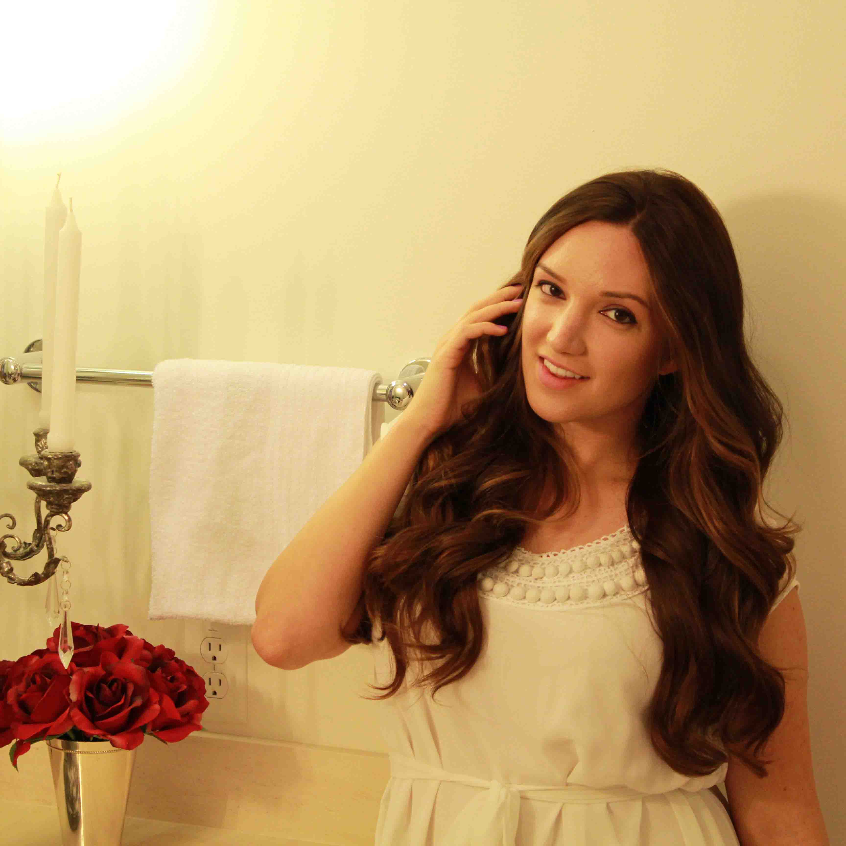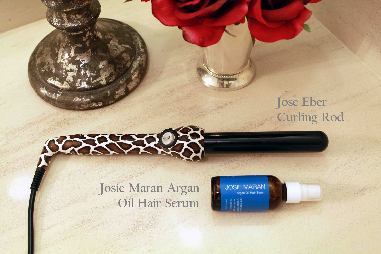 To make the big bombshell curls, I used my Jose Eber Curling Rod and Josie Maran Argan Oil Hair Serum. I prefer these newer curling rods to the traditional clamp curling irons because they don’t leave a crimp in your hair and–I don’t know how they do it but–this curling rod keeps my curls intact for days….DAYS! And that’s without any hairspray.