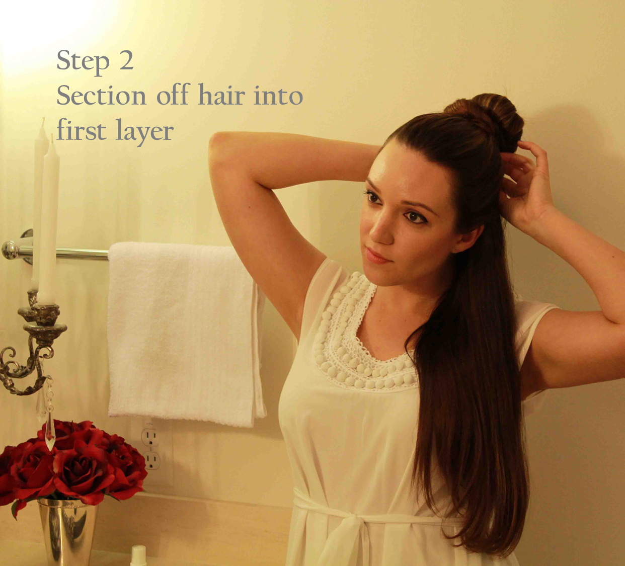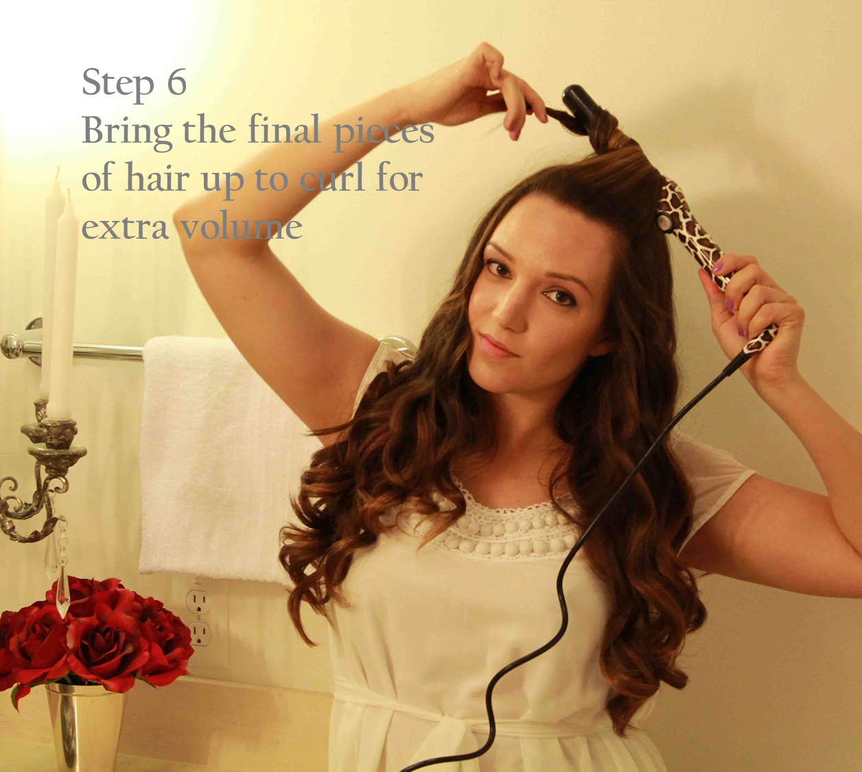Step 6: For the very last pieces of hair at the top of my head, I like to wrap the hair by pulling straight up (as opposed to the left or right) to help add a little extra volume and lift at the roots.