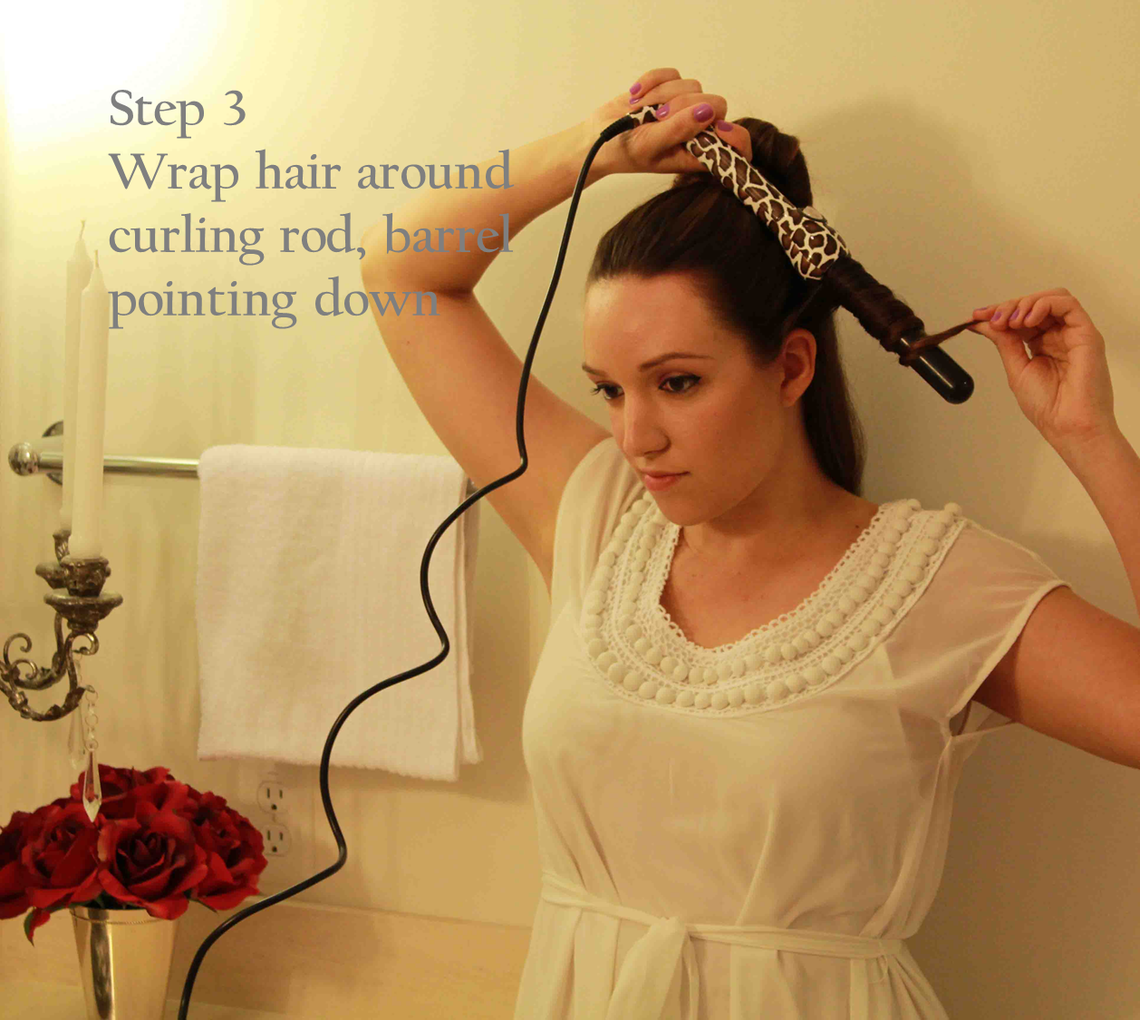 Step 3: Once hair is sectioned off, select a 1-1.5″ section of hair and wrap around the barrel of the curling rod. The roots end of the hair should start wrapping at the base of the barrel, with the barrel pointing downward. Hold the wrapped hair on the rod for about 10 seconds and then carefully release it. Note: my curling rod came with a protective glove however I prefer not to use it (read: I like to live dangerously…)