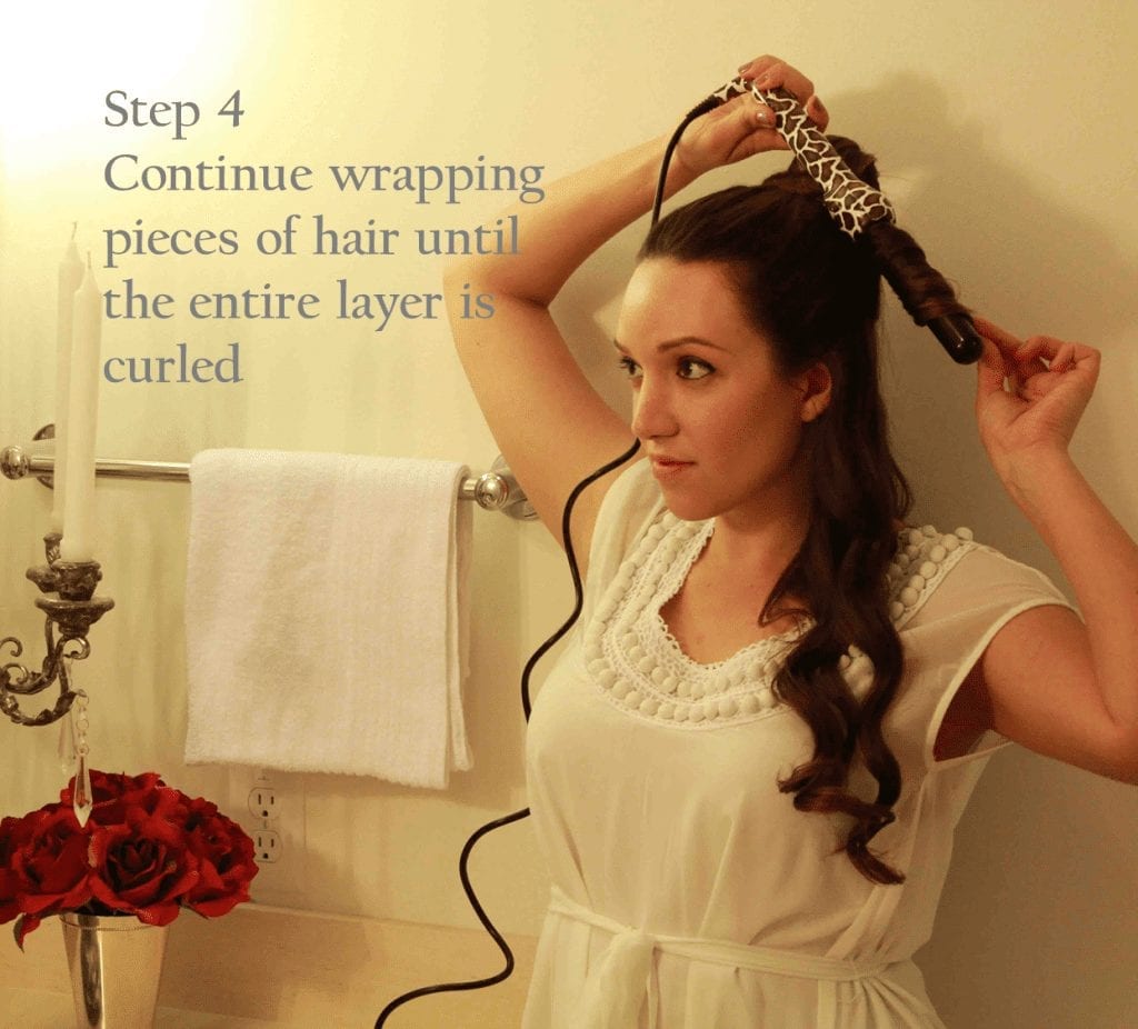 Step 5: Once the entire first layer is curled, let down the next layer of hair and continue the wrapping and curling process. Remember to hold the hair around the barrel for approximately 10 seconds and carefully release it until cooled.