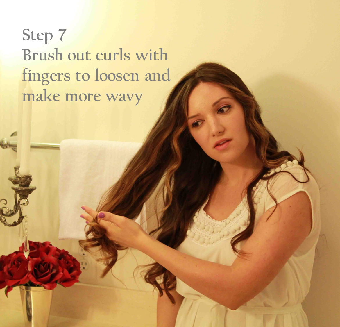 Step 7: If you are looking for a looser curled look, I like to run my fingers through the curl to help soften them up and give a more natural look. Don’t worry about your curls falling out from running your fingers through your hair…they will last for DAYS!