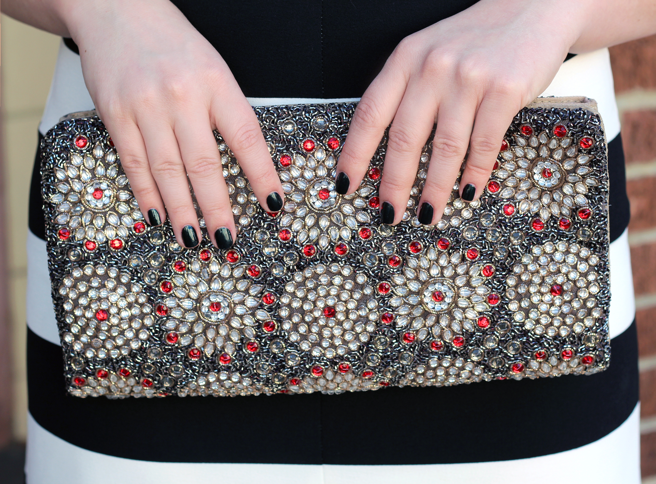 The holiday party craziness has already started–I feel like it was just Halloween! I’m sharing one of my holiday looks that I wore to a holiday themed cocktail party the other night and I decided to go with a glammed up (obviously) theme of black and white. I feel like there is a lot of red, green, and blue at holiday parties so I wanted to go for a classic color palette of black and white. I found this holiday cocktail dress nearby my office at my local Banana Republic Factory Store (I’m a sucker for the outlet malls, guilty!) and really loved the thick stripes and the nice hourglass shape. Not to mention, all of their dresses are 50% off from December 2-12…so it was basically free, right?!?