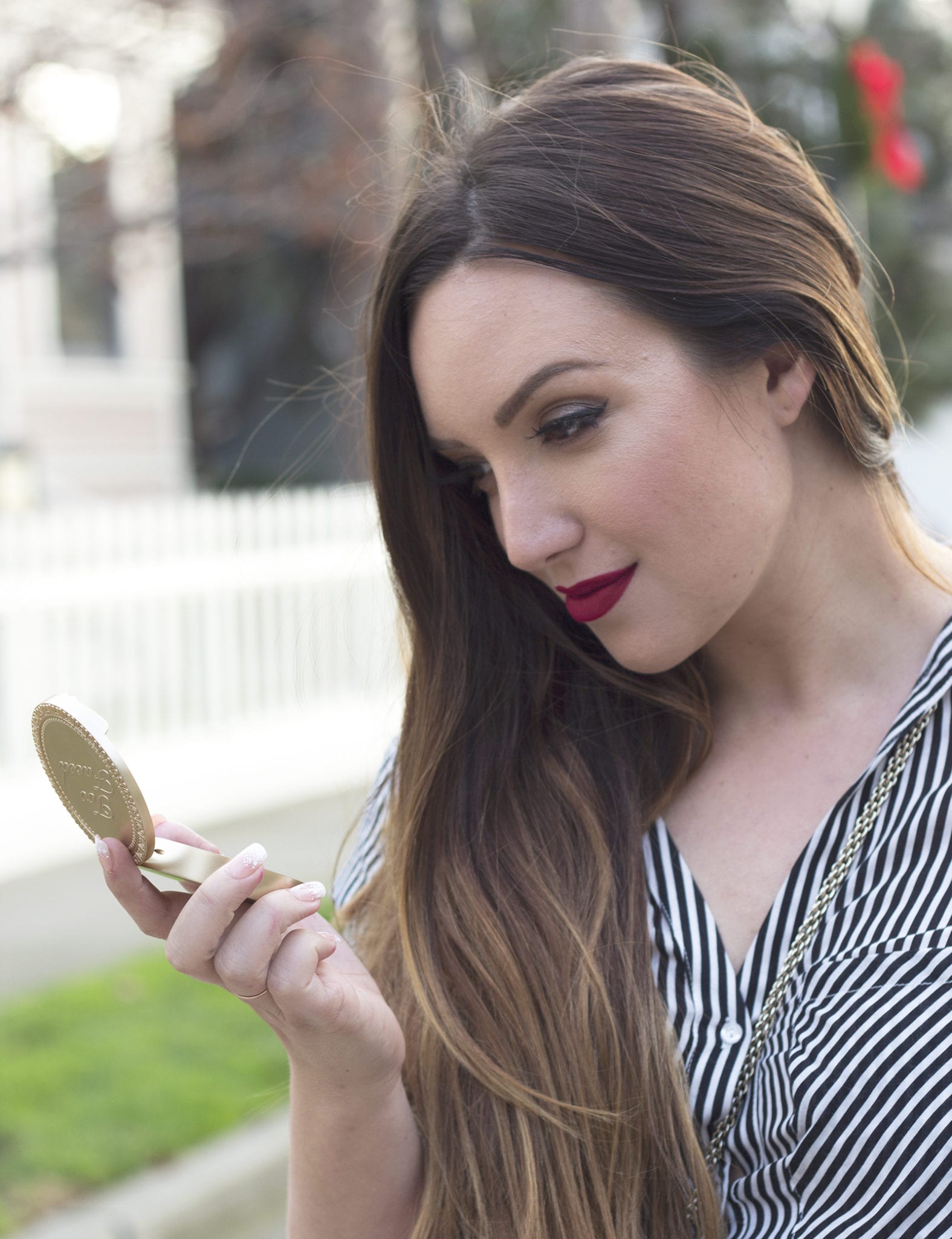 For my holiday party makeup, I wanted to go red and glam! I stopped by my local Beauty Concierge on a recent Target trip (my fav!) and asked her for help on new products that I need to try out for my holiday glam look. She recommended these beautiful Sonia Kashuk makeup brushes, and I was seriously so impressed with the quality. Additionally, she added a new favorite pair of false lashes into the mix—the Full Glam Sonia Kashuk lashes. She reiterated one of my favorite tips when it comes to false lashes: Don’t forget to trim the outer counters to fit your eye size. Oftentimes, you can apply the strips as is and they can look way over the top instead of naturally enhancing. Knowledge dropping in the beauty aisle!