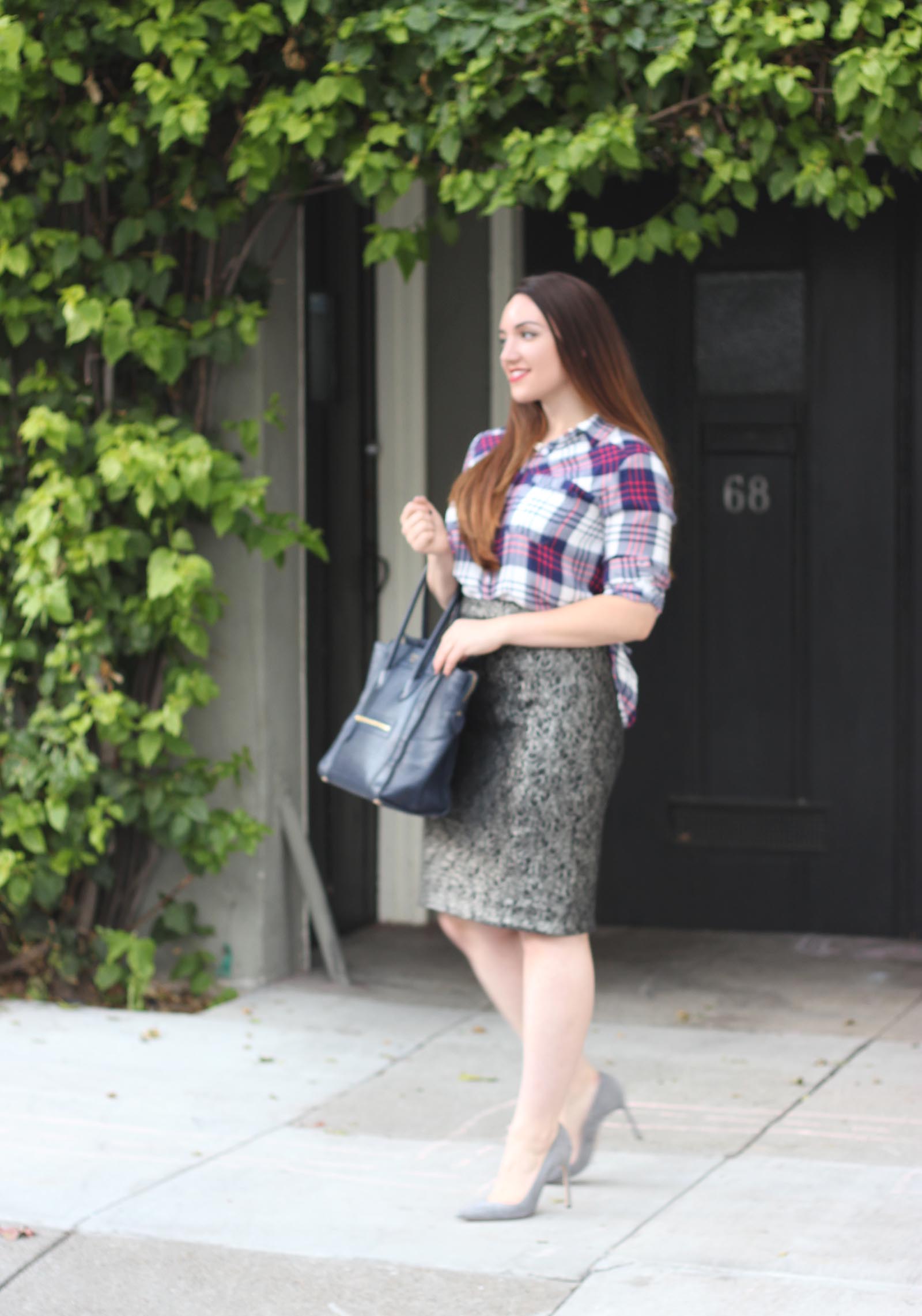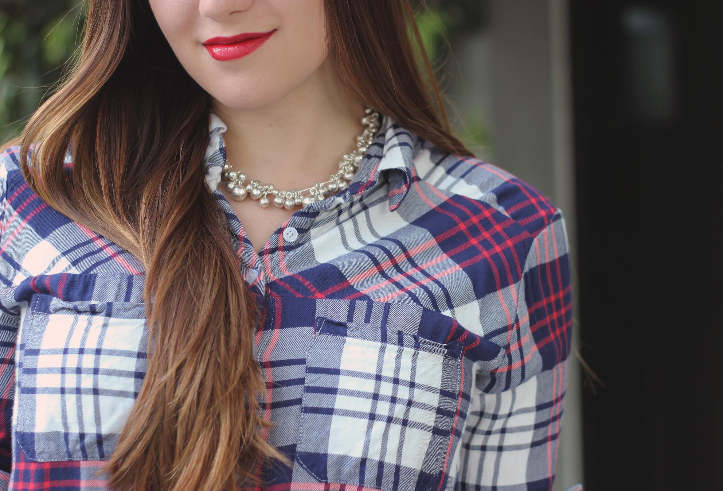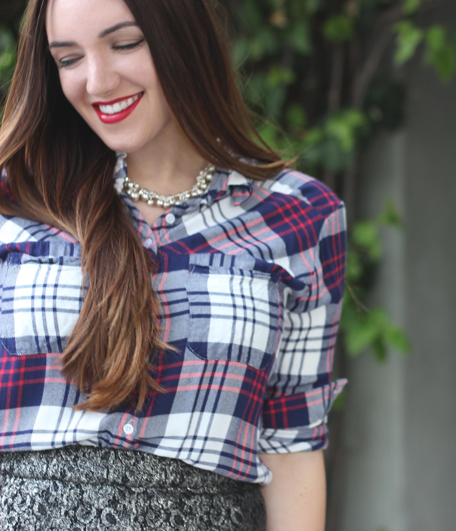 For a holiday work party or Friday night happy hour with coworkers, I love the idea of a casual plaid shirt (totally festive on it’s own..) and mixing it with a shimmery pencil skirt and silver jewelry. This necklace from Pat Areias is an extra special touch to glam up my plaid shirt–it almost looks like jingle bells! I’ve found myself leaning more towards silver jewelry this season which is a nice change with the seasons and I’m going to be reaching for this piece for a lot of my holiday looks.