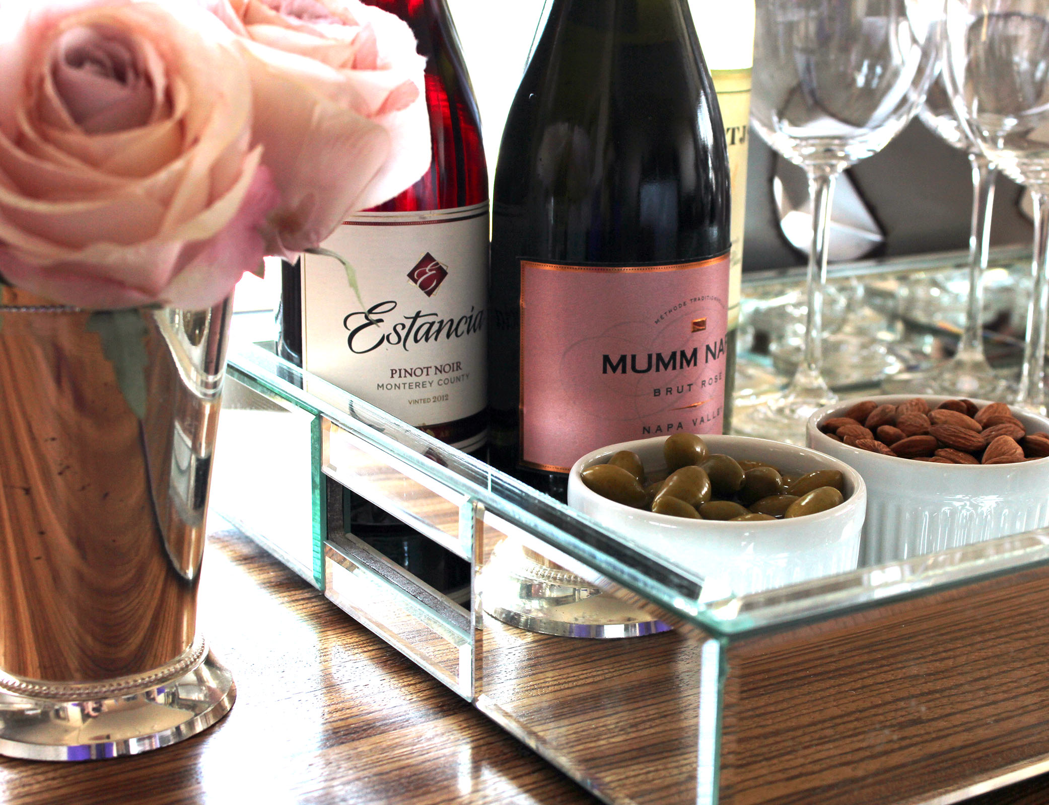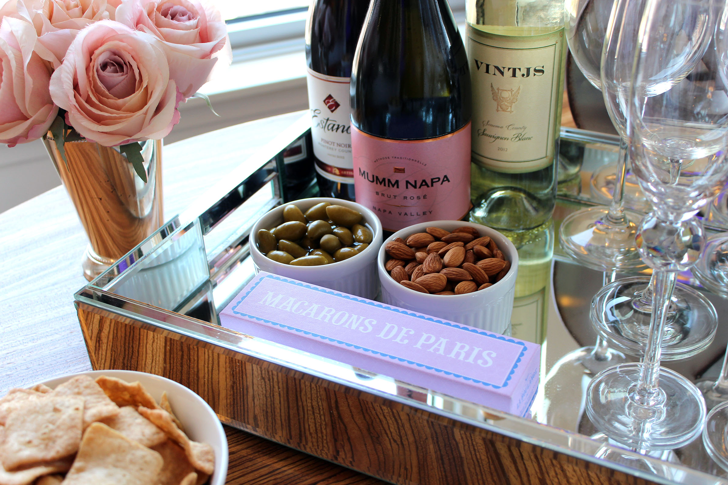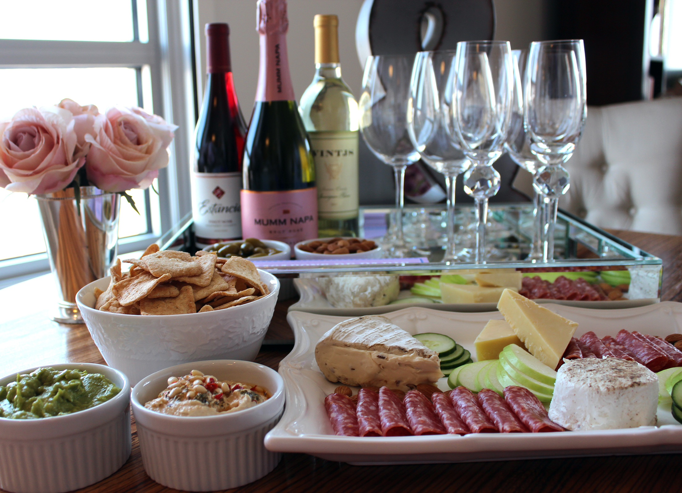 How to host girls night inWine – Girls night in isn’t complete without a bit of vino, and since a lot of my friends have different preferences on what they like to drink, I opted to get a variety.  A Pinot Noir from Estancia,  a Sauvignon Blanc from VINTJS, and a Brut Rose from Mumm Napa (my favorite!).