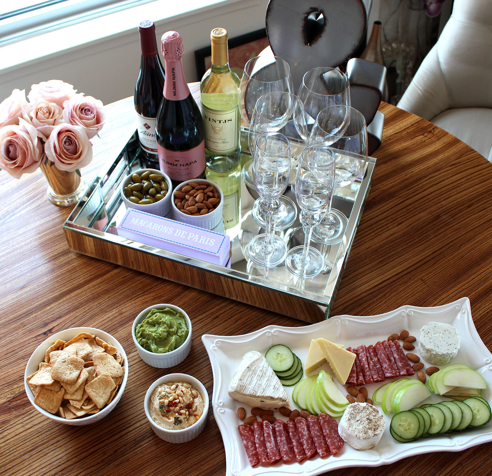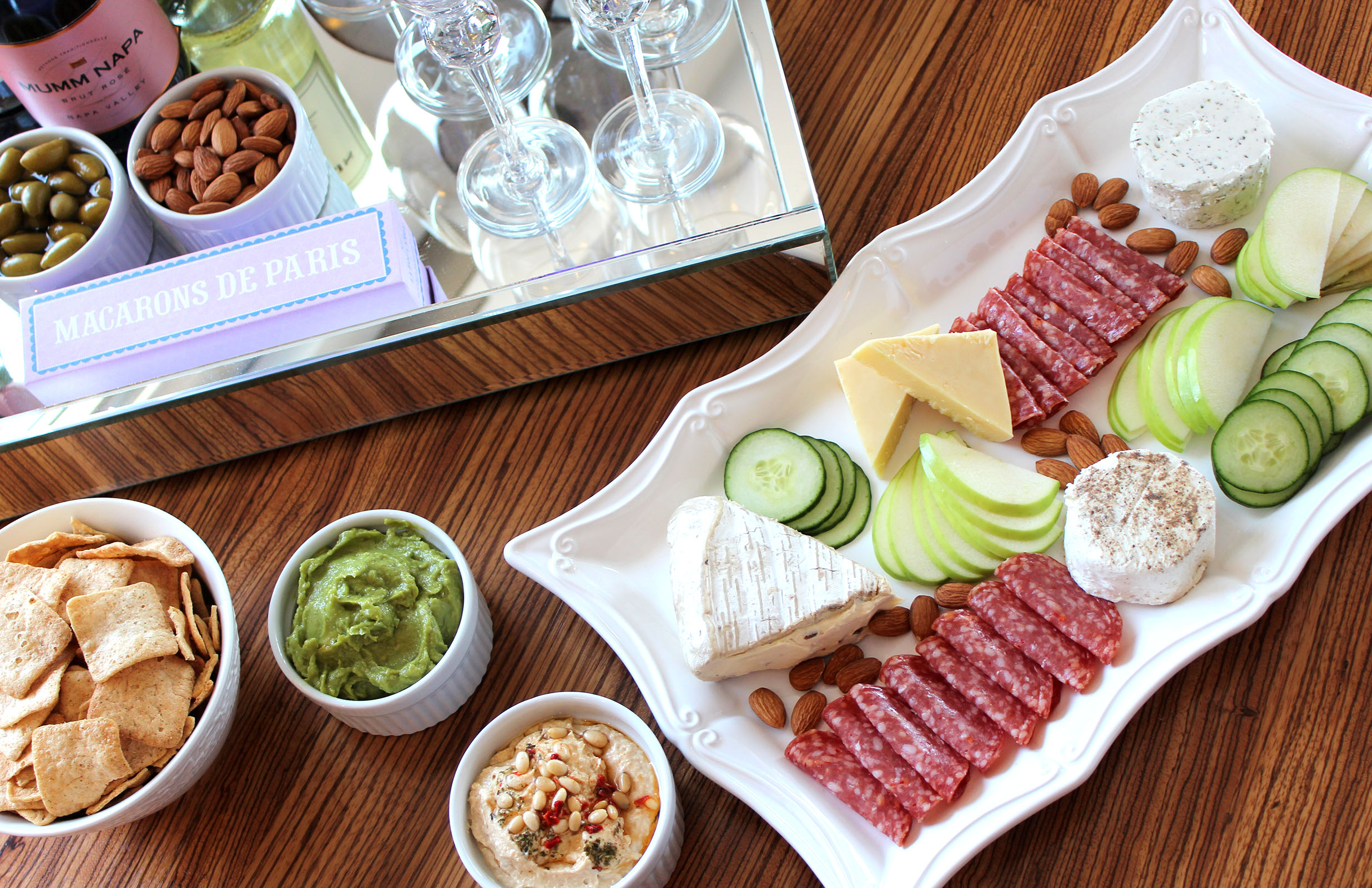 Don’t get me wrong, going out to check out San Francisco’s (or wherever I’m traveling) newest bars and restaurants is one of my favorite ways to see my friends, socialize, and enjoy delicious apps and drinks.  But sometimes (after a particularly loooong week), it’s nice to avoid the crowds and stay home for a low key evening.  Since I’m the one hosting our next get together, I wanted to share my take on hosting girls night in with snacks and drinks to cater to the many preferences of my friends.  Take a look at what I’m serving up as hostess at Chez Just Add Glam: