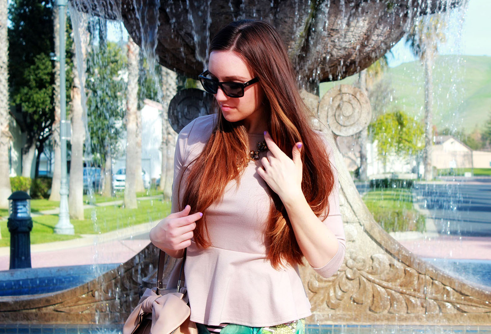 We’re both wearing peplum tops and pencil skirts today! LOVE the blush color of the top, so pretty!