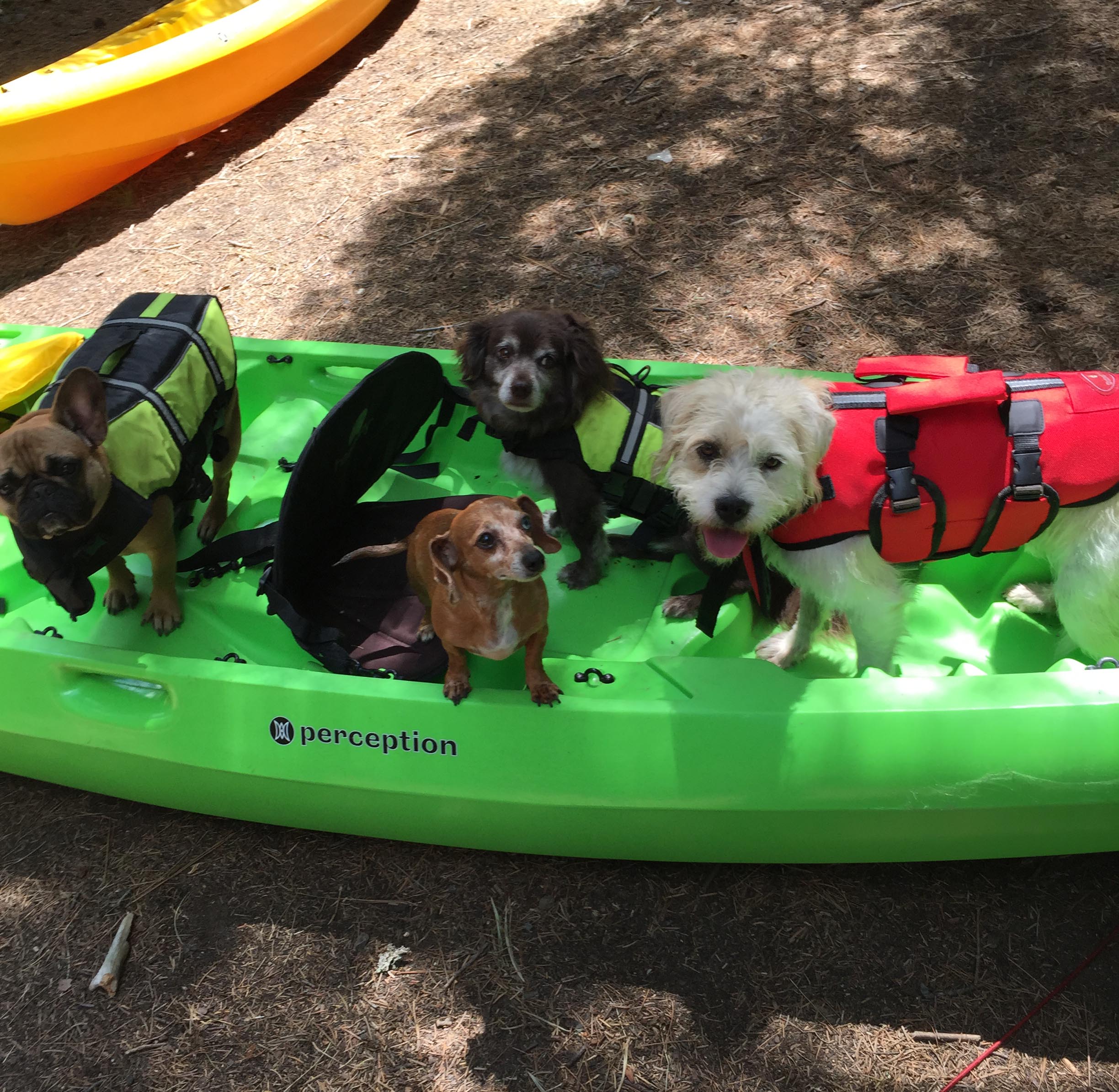 Lola and her friends in a kayak wearing lifevests–is there anything cuter?!?