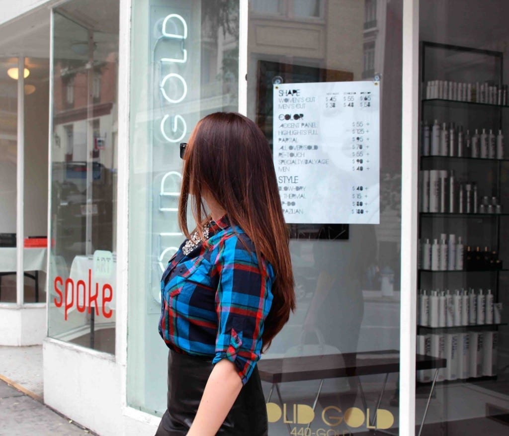 San Francisco is well known for its hipster fashion–and I needed to debut a hipster staple: the plaid shirt. Plaid has always reminded me of lumberjacks and the Brawny paper towel guy, and didn’t seem to be the cutest of styles but I was up for the challenge to glam-up this San Francisco style. When mixing a black leather pencil skirt (so warm, so comfortable…can I please live in this?!?) and some ridiculous-awesome jewelry bling to plaid pattern–this mountaineer plaid has transformed into ‘well hello Miss Lumberjack!’