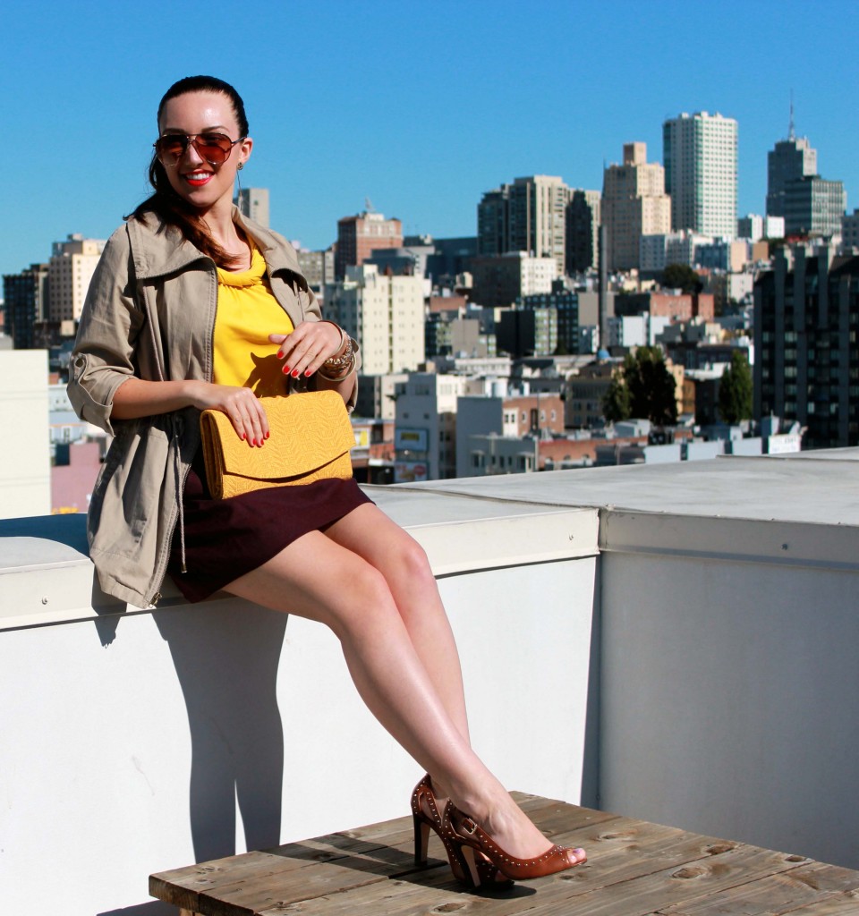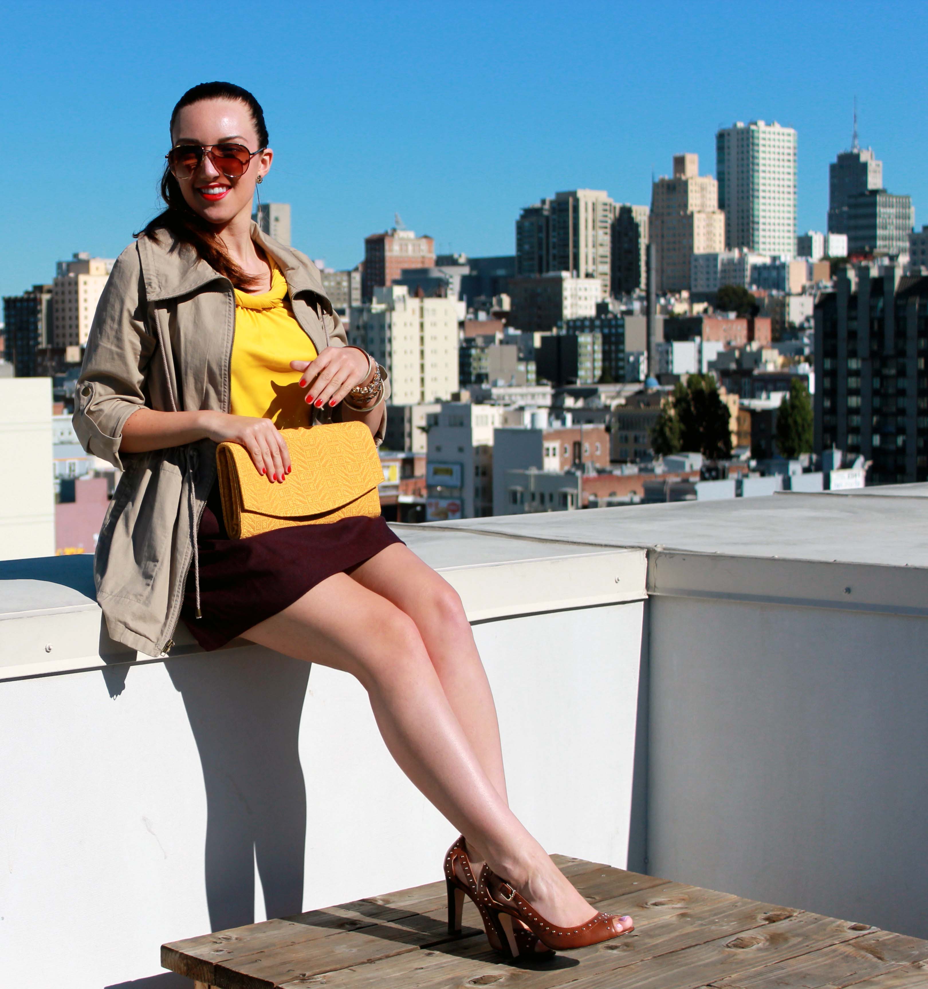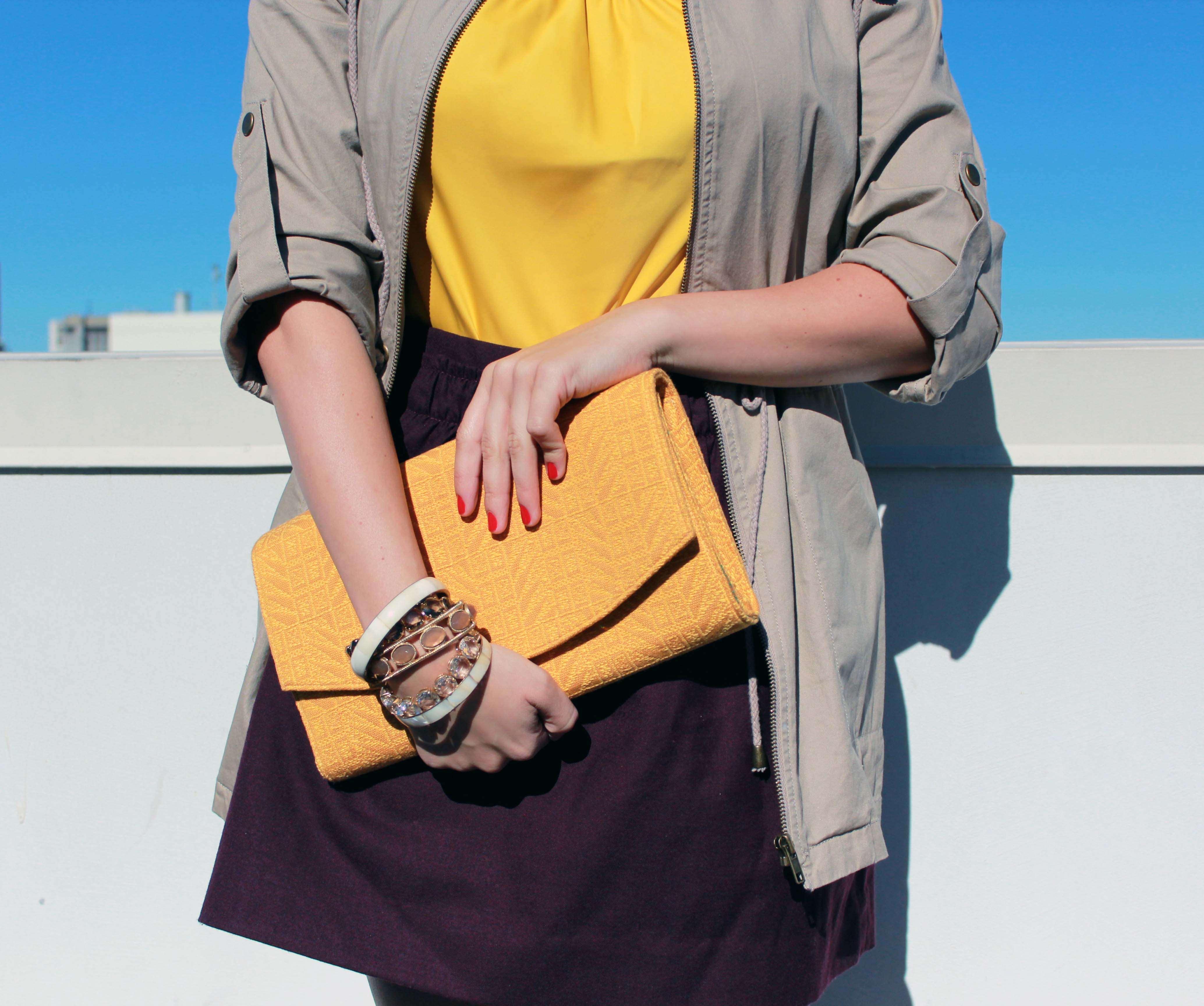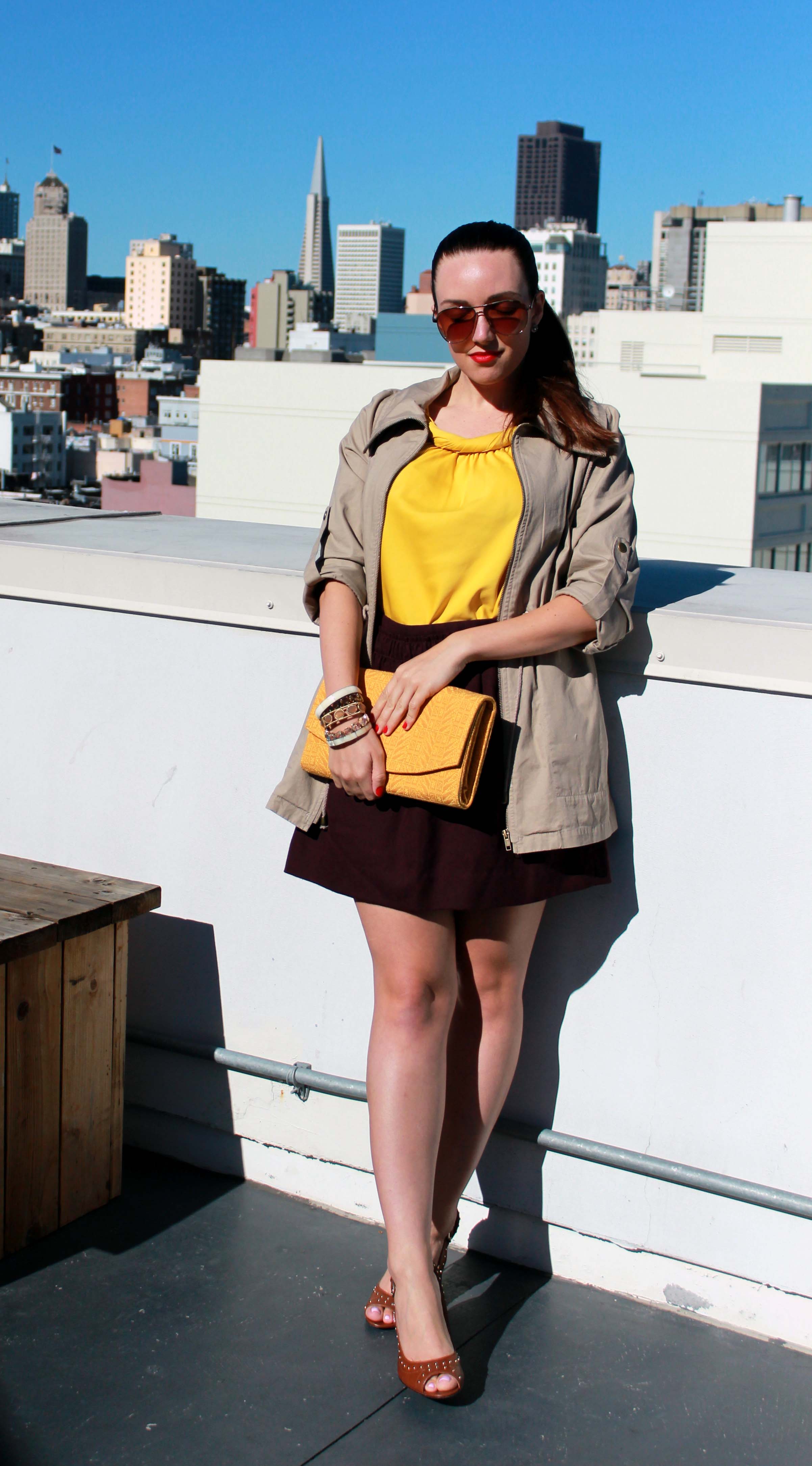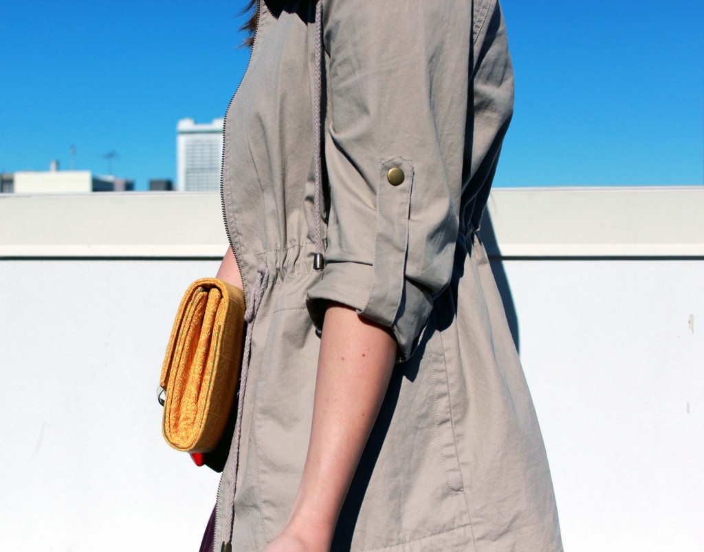 I saw this jacket at Forever 21 and practically had to pull it off the mannequin I loved it so much.  I like how I can adjust the drawstring at the waist to make a more hourglass shape based on my outfit.  To pull all of these warm colors together, I chose my ISLY clutch for a beautiful, classic shape that easily goes from day to night.  And when the sun begins to set, I can switch out the utility jacket and my outfit is perfectly ready for night!