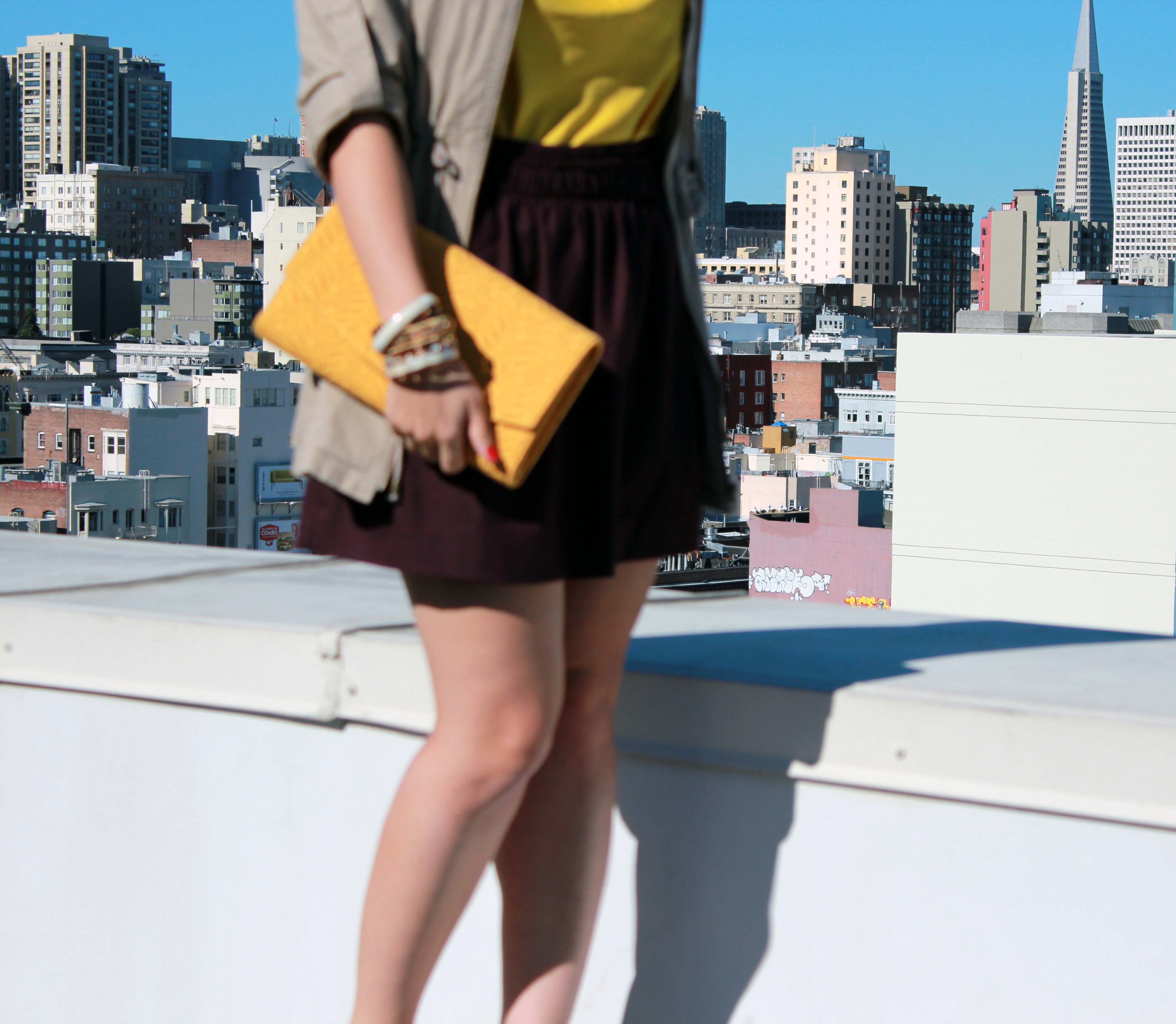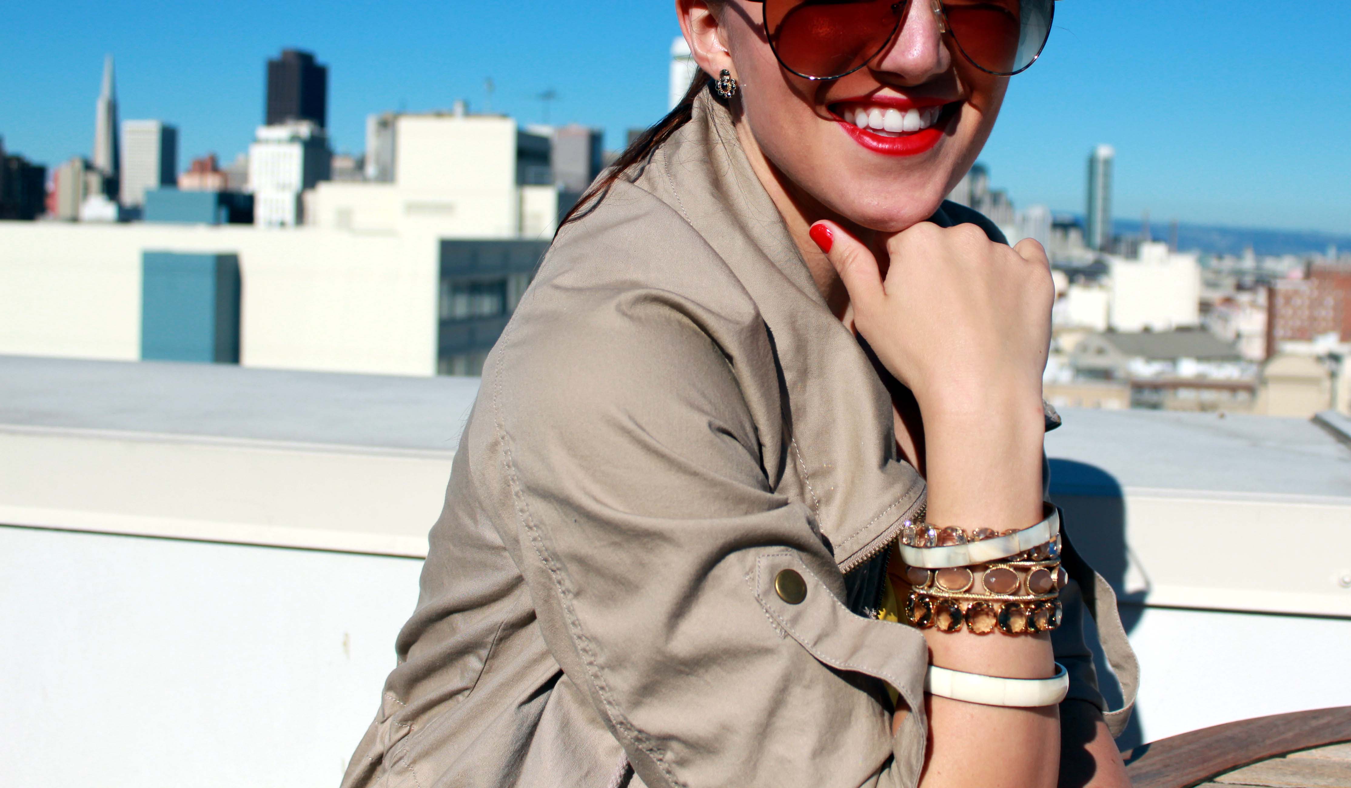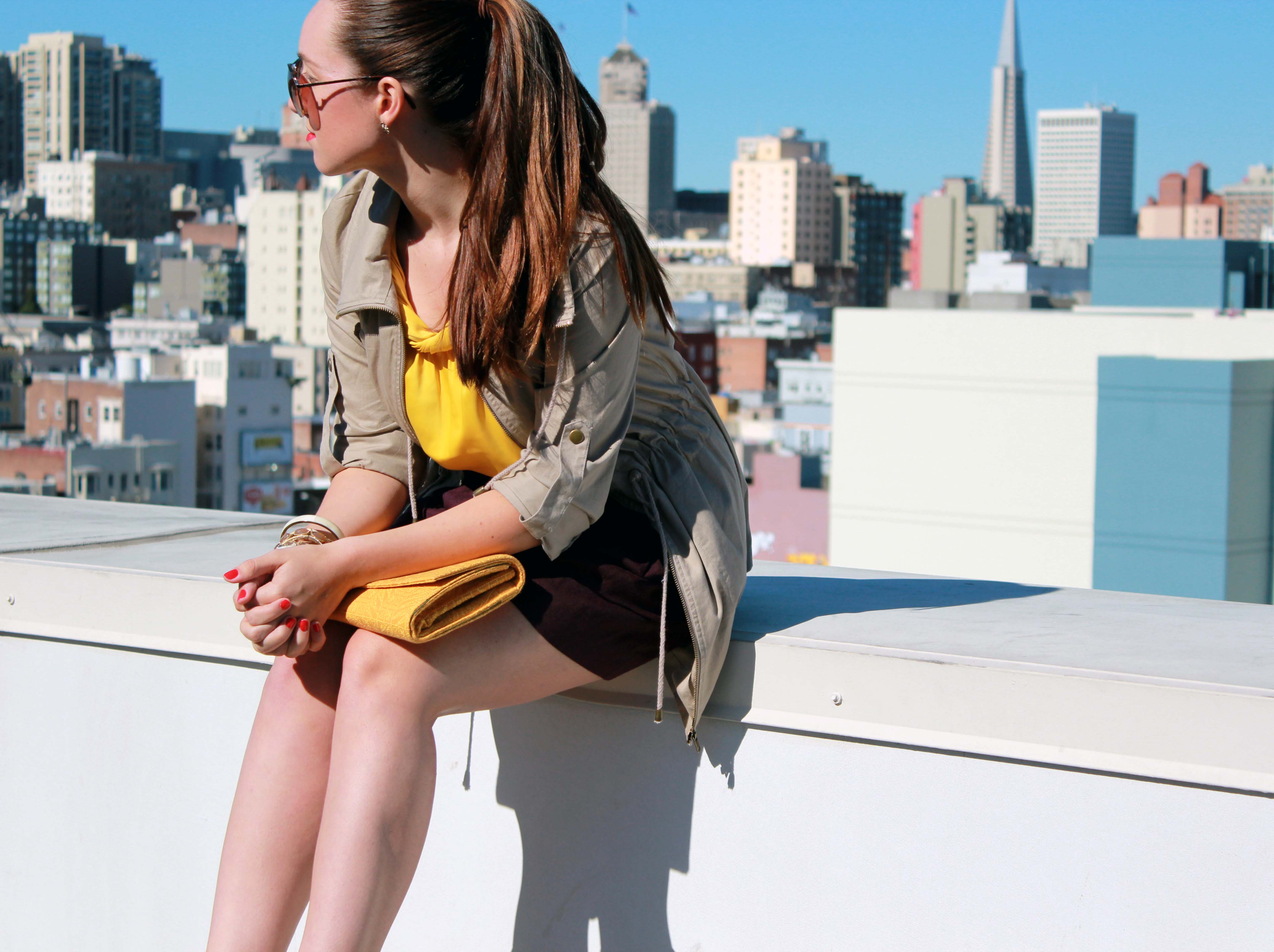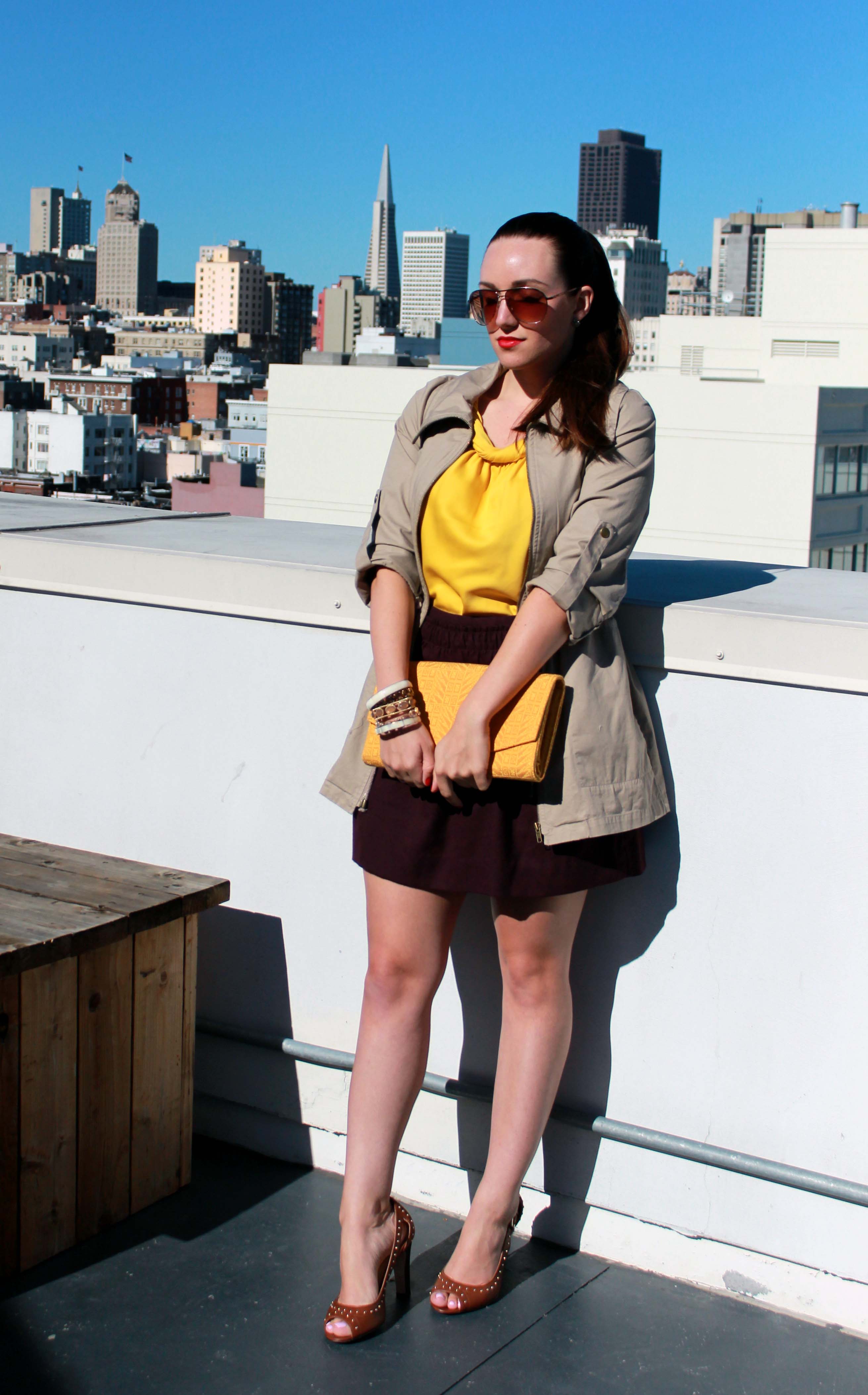 I saw this jacket at Forever 21 and practically had to pull it off the mannequin I loved it so much.  I like how I can adjust the drawstring at the waist to make a more hourglass shape based on my outfit.  To pull all of these warm colors together, I chose my ISLY clutch for a beautiful, classic shape that easily goes from day to night.  And when the sun begins to set, I can switch out the utility jacket and my outfit is perfectly ready for night!