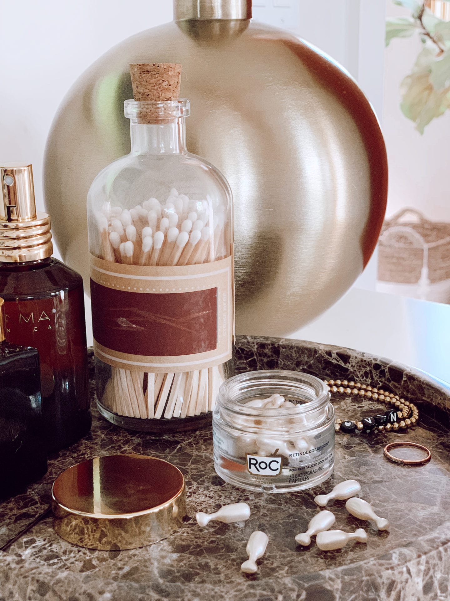 As I get older and have more demands (hello having a newborn!), my skin has taken a toll. From a few more fine lines, to a little duller skin I’ve been on the lookout for something to help. Plus, I’m a firm believer that treating your skin is the perfect little form of self-care, which I can definitely use right now. I’ve been using RoC Retinol Correxion Line Smoothing Night Serum Capsules for the last couple of weeks to help smooth and firm up my complexion and deeply hydrate. I’m loving it! Here’s how I use RoC Retinol Capsules for more youthful skin.