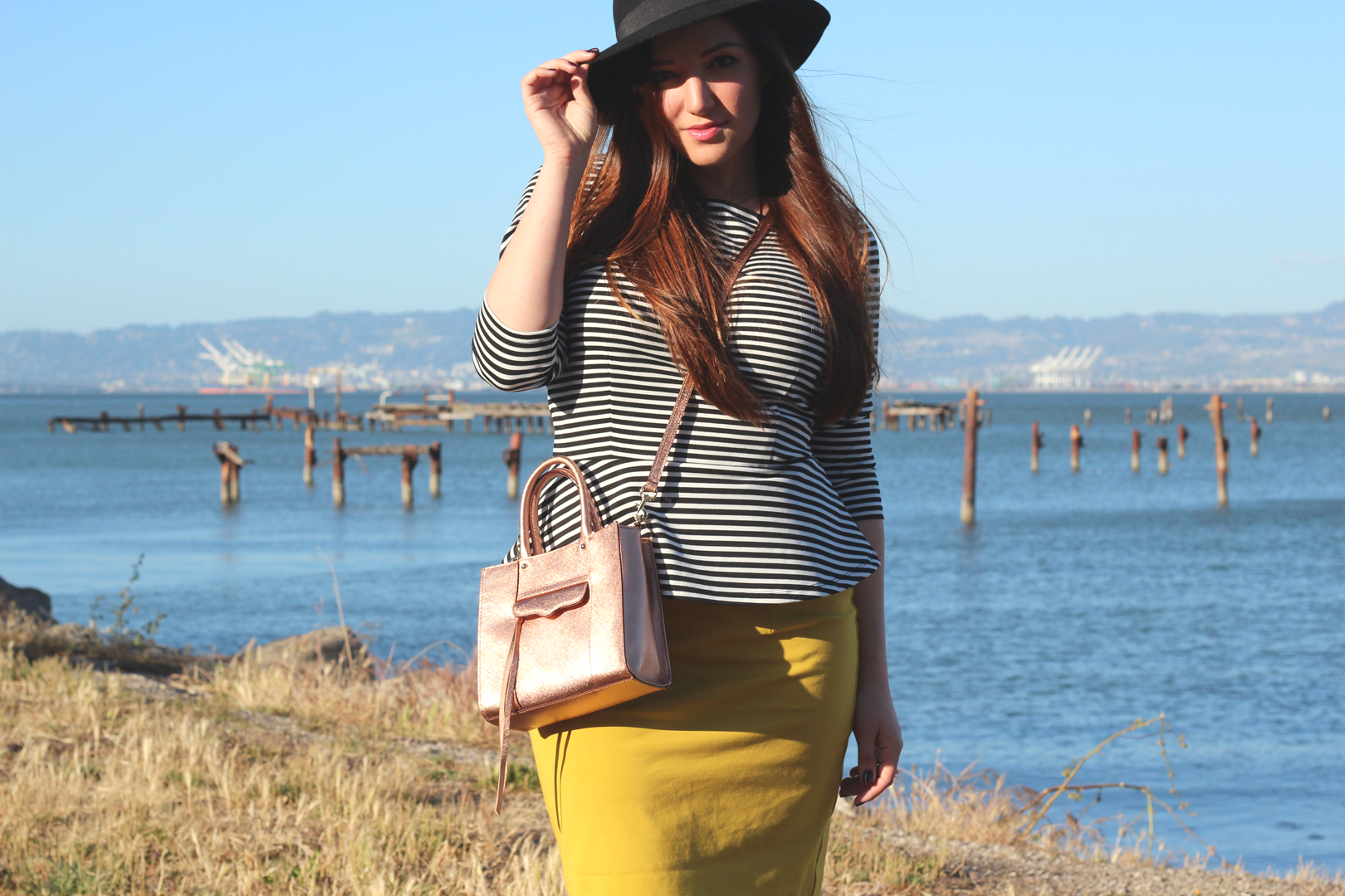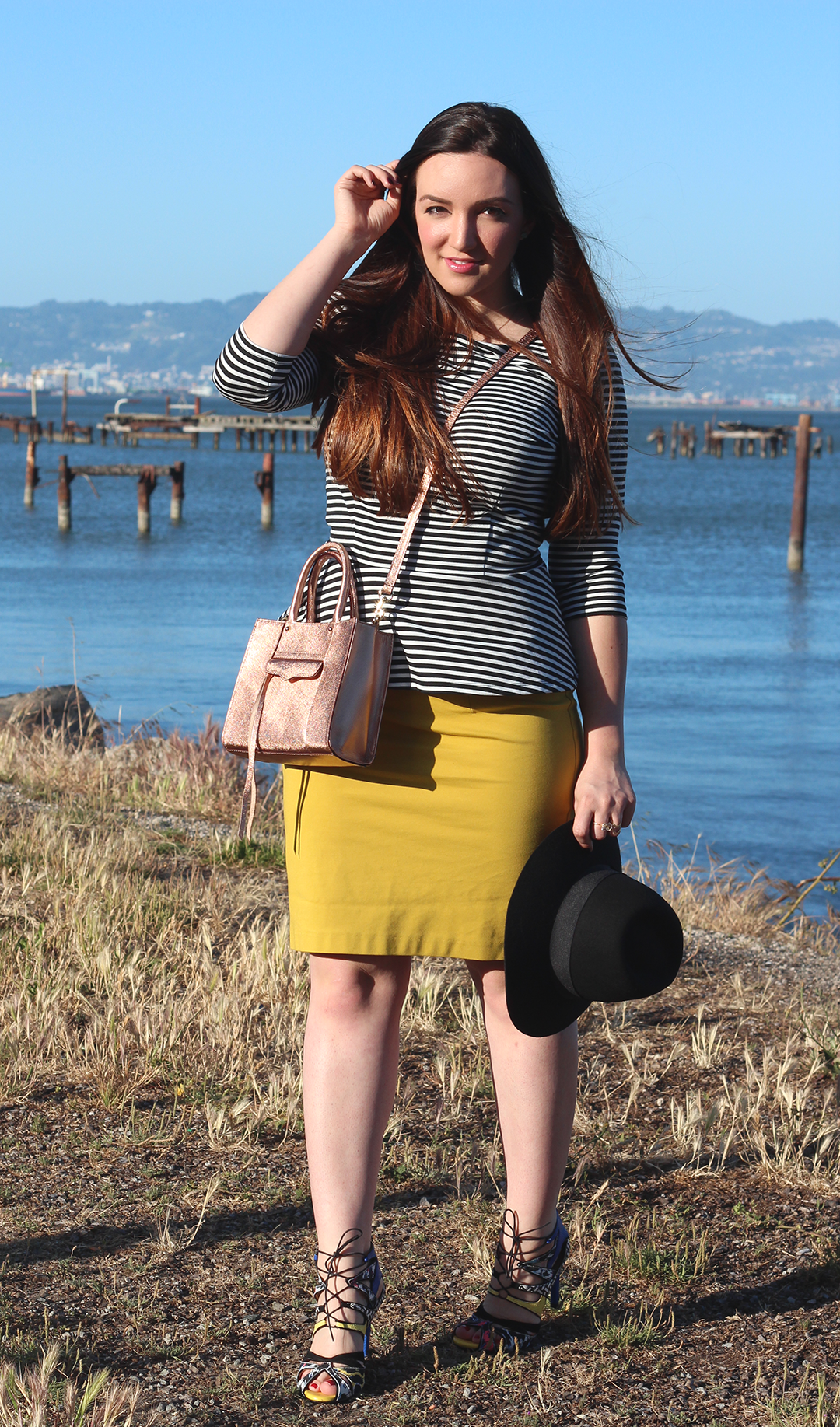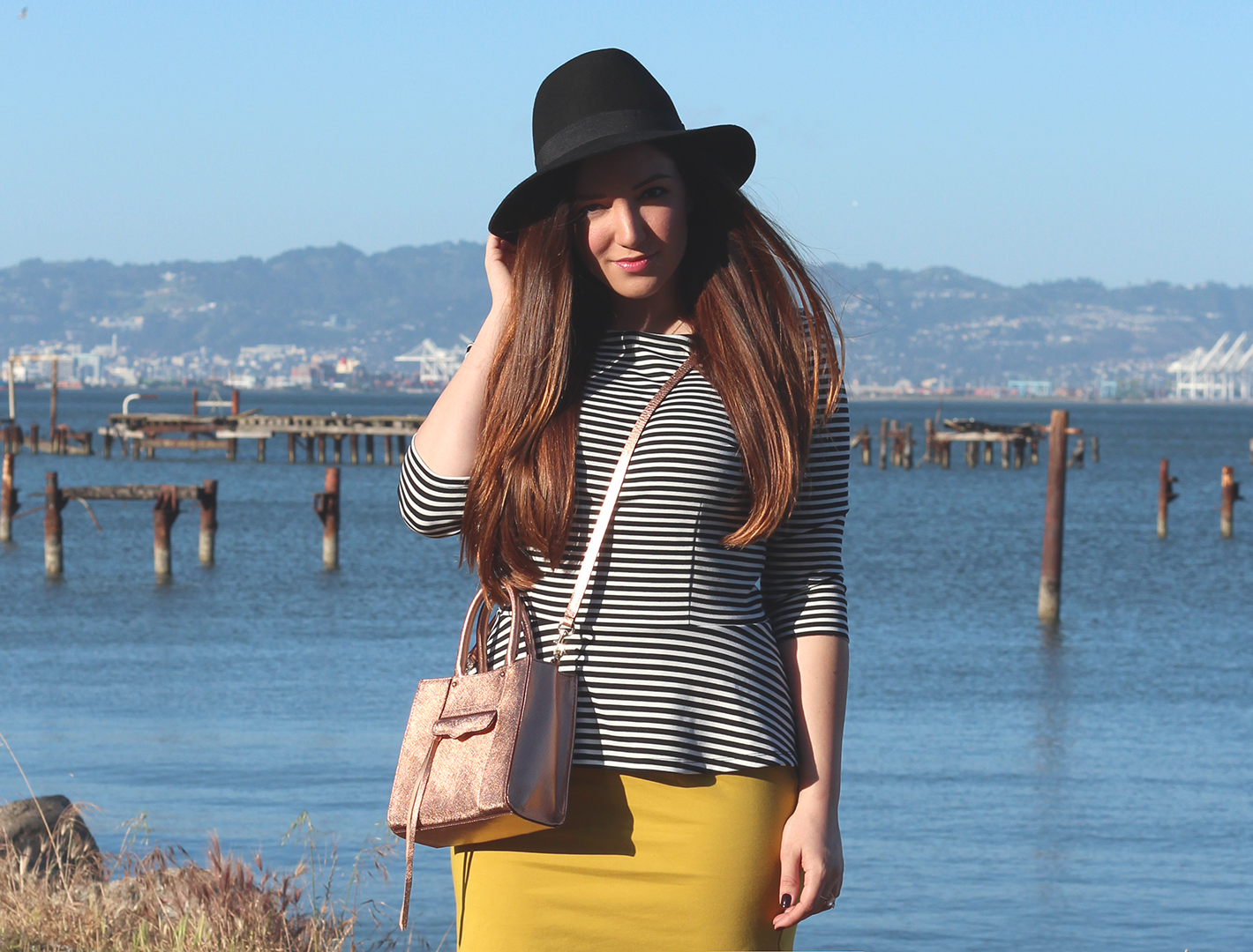 Top: Ann Taylor, similar here // Skirt: LOFT // Hat: Forever 21 // Bag: Rebecca Minkoff c/o // Heels: Zara, similar here // Ring: World Market // Nails: Essie Solemate