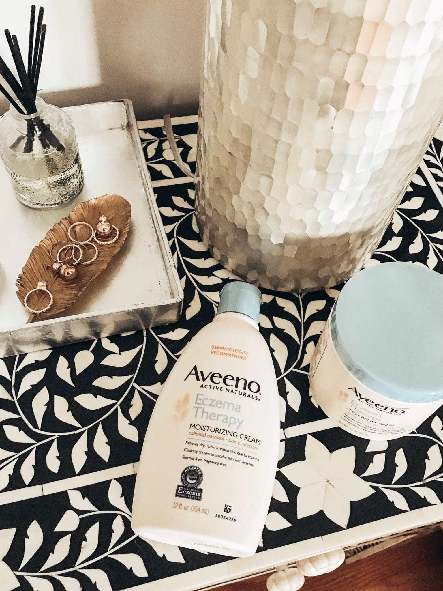 Since that moment, I’ve learned more about my eczema and how to deal with it so that I have a routine when flare ups happen. After trying many different lotions, I found myself using the Aveeno Eczema Therapy line for hydration on my skin. I had used Aveeno hand cream previously and when restocking in the drugstore, I discovered their Eczema Therapy range of creams, lotions, and balms.