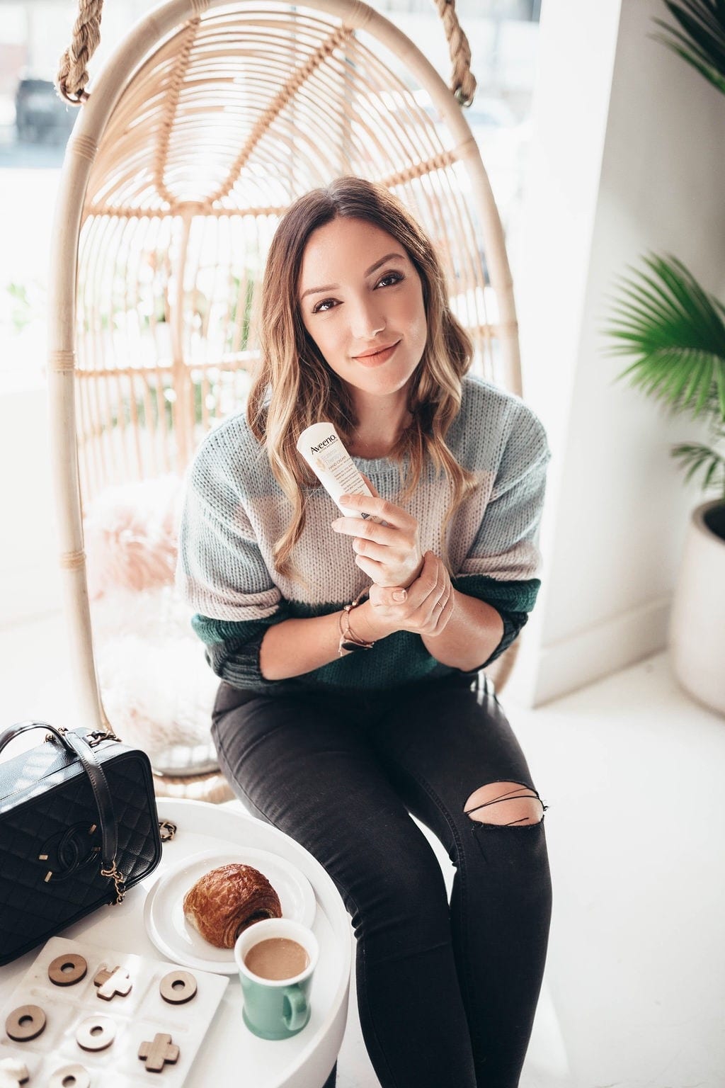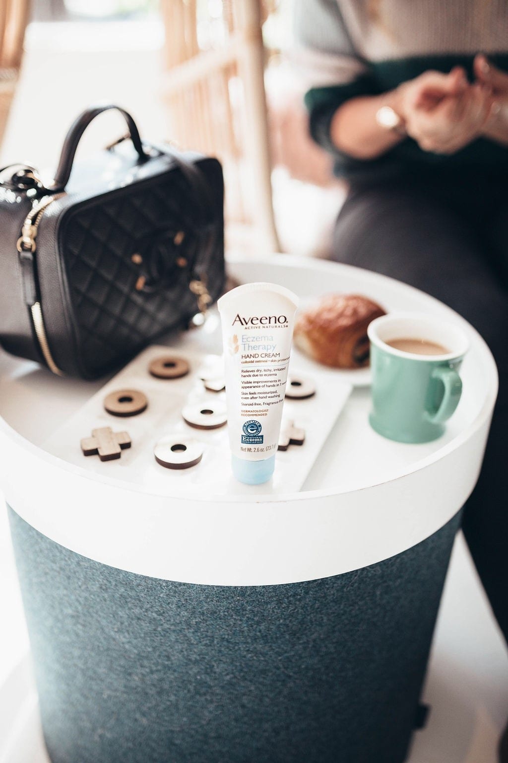 When I have active eczema situations I’ll use a combination of the Aveeno products to speed through the process and get my skin hydrated and back to happy as quickly as possible. For everyday and bringing around in my bag, I’ll pack the Aveeno Eczema Therapy Hand Cream with me. It’s actually just fantastic as a hand cream but great for instant touch ups throughout the day as needed. When I’m home, I use the Aveeno Eczema TherapyMoisturizing Cream on my body and the Itch Relief Balm on problem areas for an extra dose of moisture.