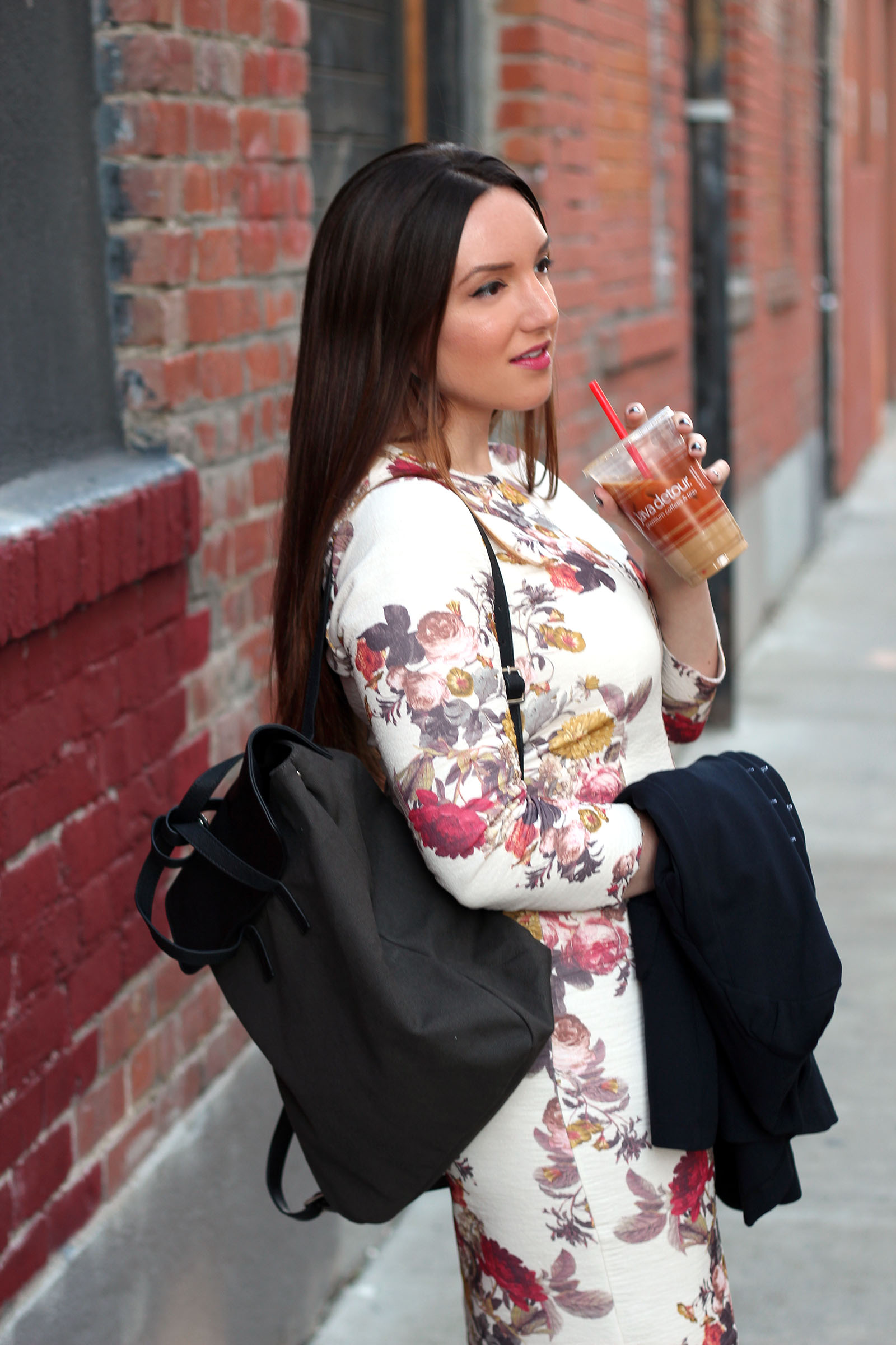 For my look, I was really excited to style the Hugo backpack from Be&D into my look.  I’m been on the hunt for a grown up and glam backpack for what seems like forever and I finally have found it from Be&D.  To go along with the leather straps on the bag I wore some strappy cage heels and a floral shift dress to balance out the harder accessories with a flirty print and shape.  I love the mix of soft are hard pieces together to make an outfit really interesting.