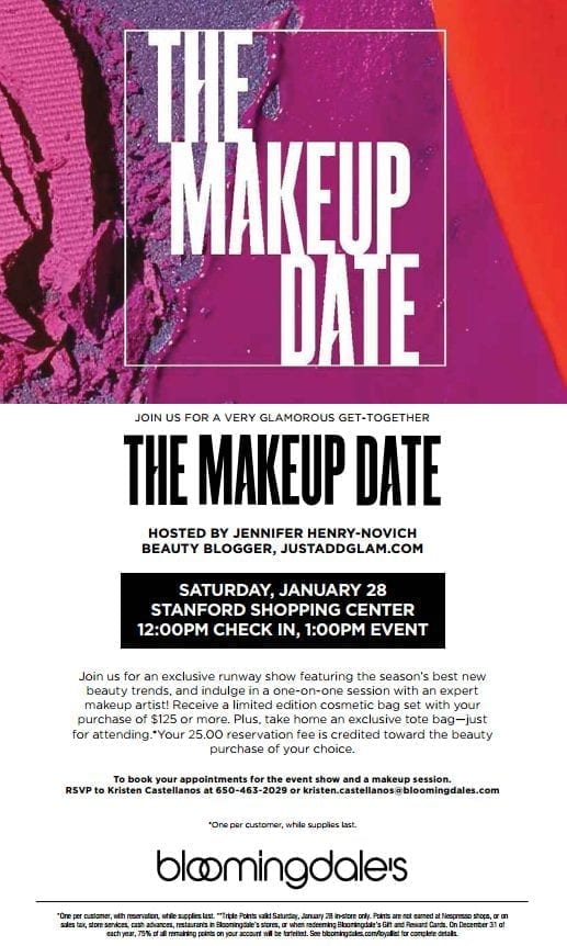 I love trying out new skincare and makeup…and I want you to get in on the fun too!  I’ve partnered with Bloomingdale’s and would like to cordially invite you to their annual The Makeup Date event–hosted by yours truly!  The event is coming up on Saturday January 28 at Bloomingdale’s, Stanford Shopping Center at 1pm (12pm check in).