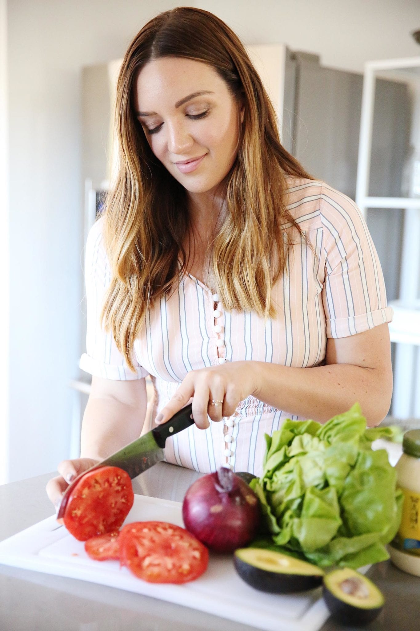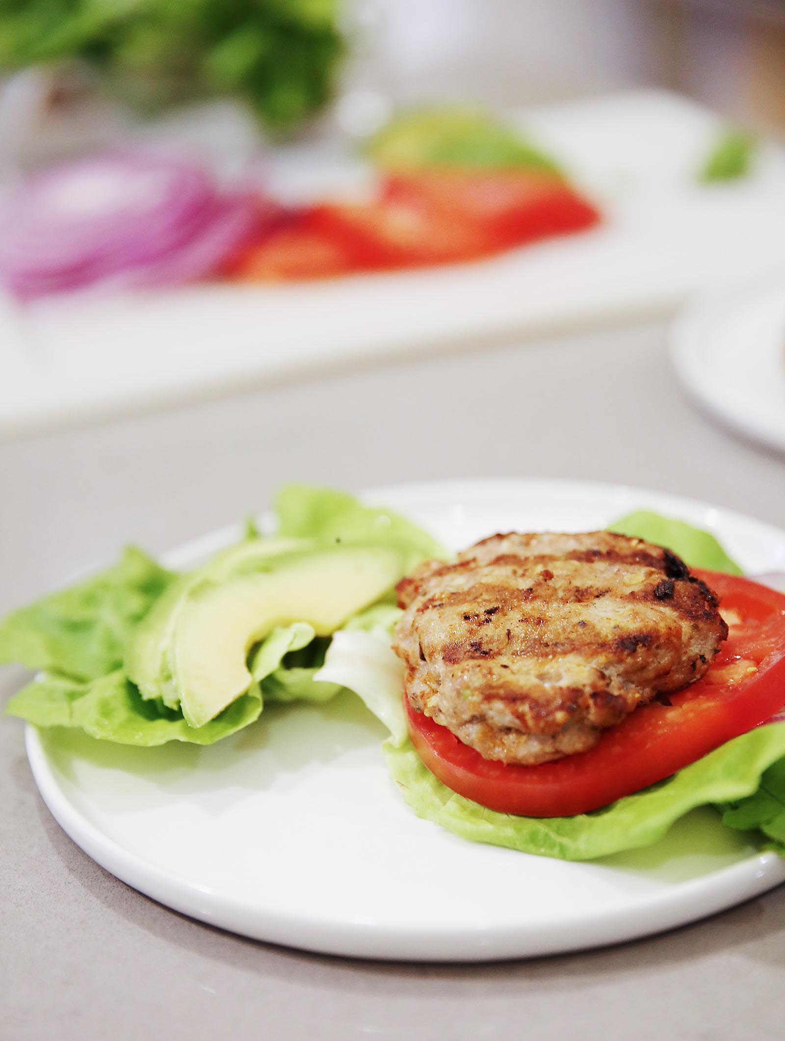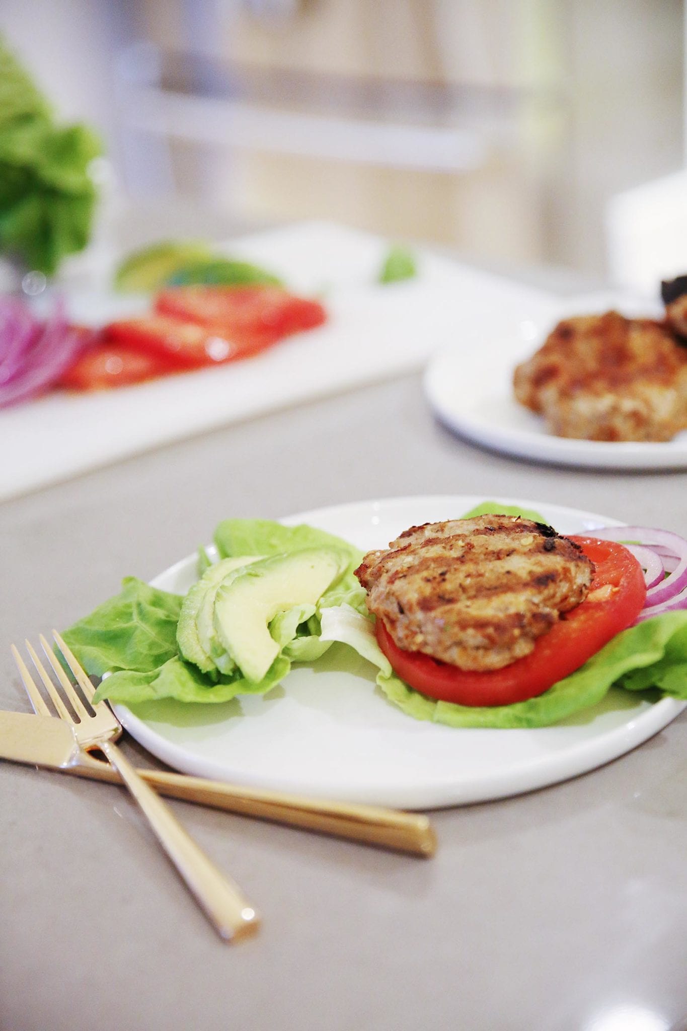 While our juicy turkey smash burgers are cooking up, I sliced up the beautifully red heirloom tomato, red onion, avocado, and peeled “buns” with the butter lettuce. Once the burgers were ready, we made a little assembly station available for our guests and plated up these yummy turkey smash burgers!