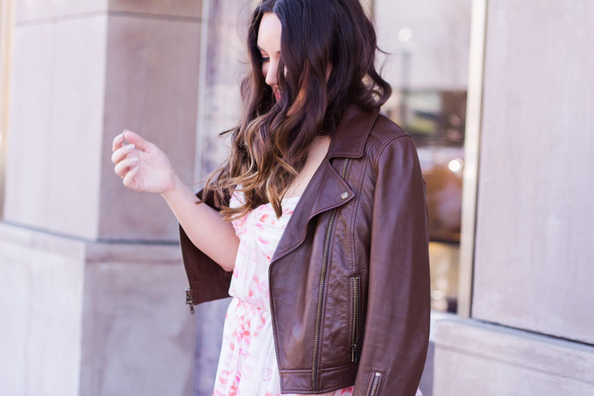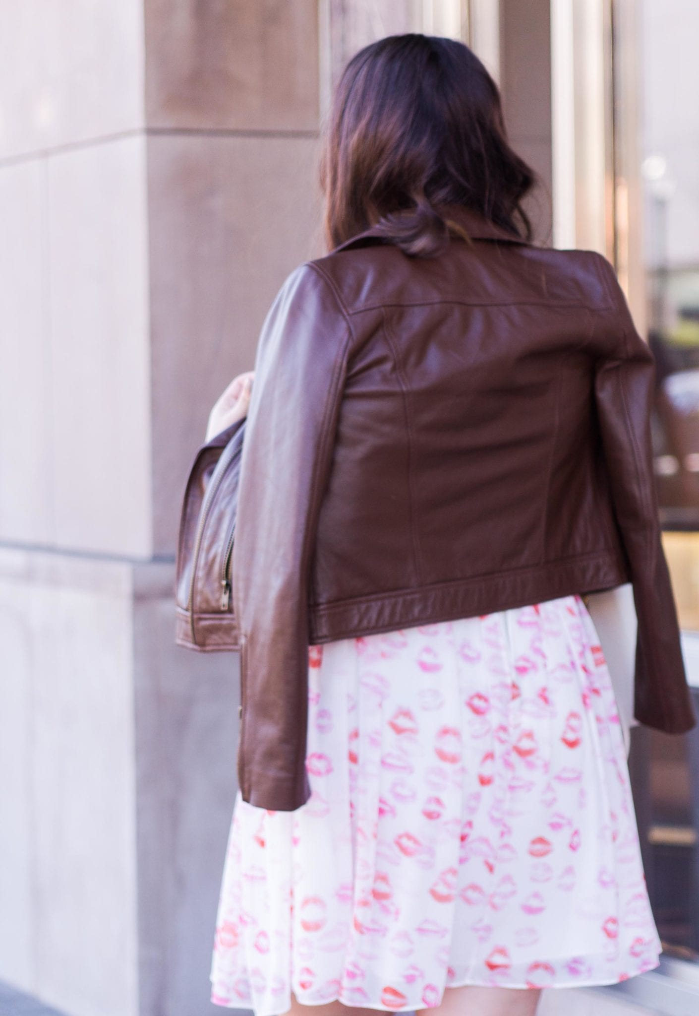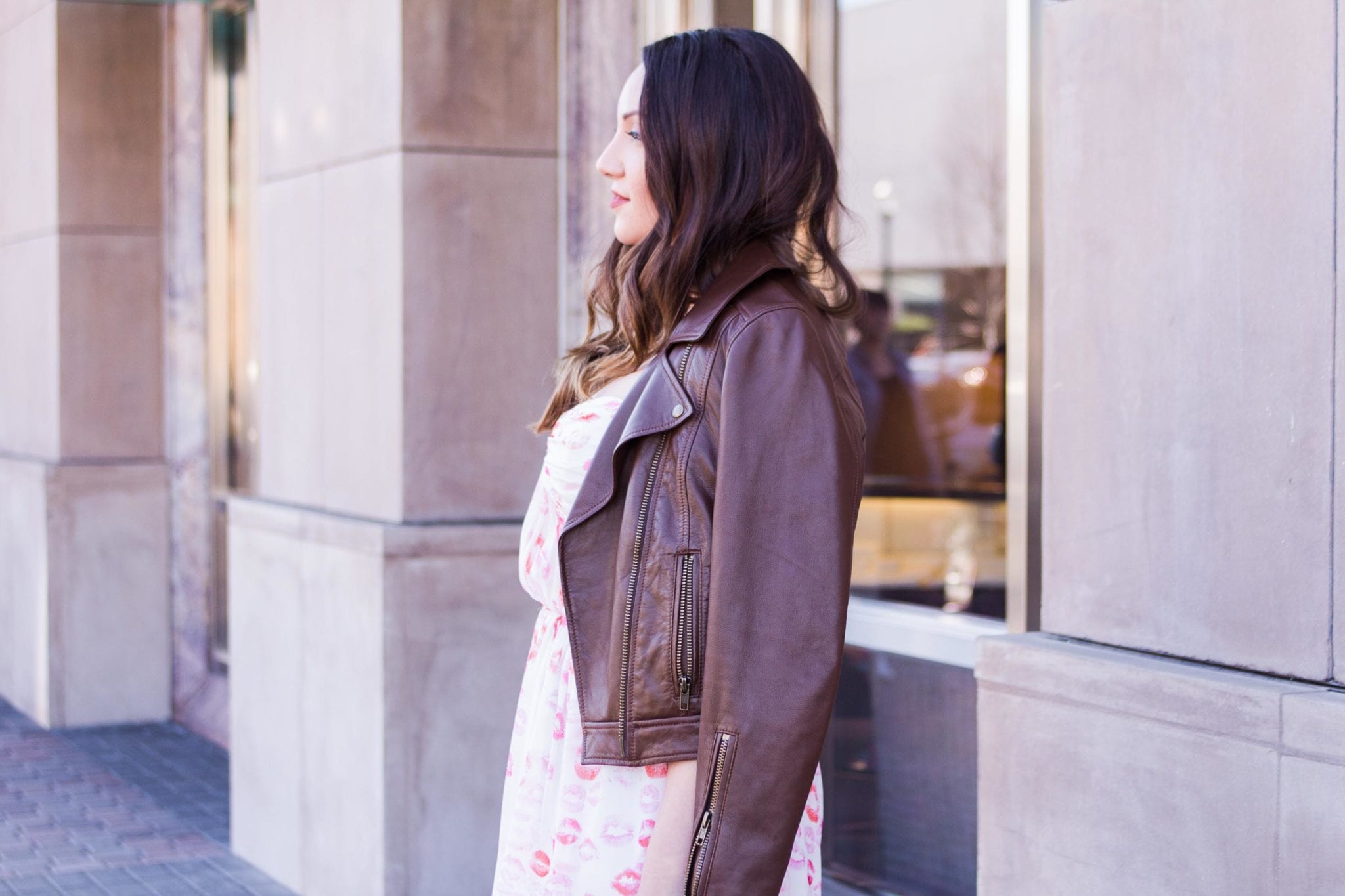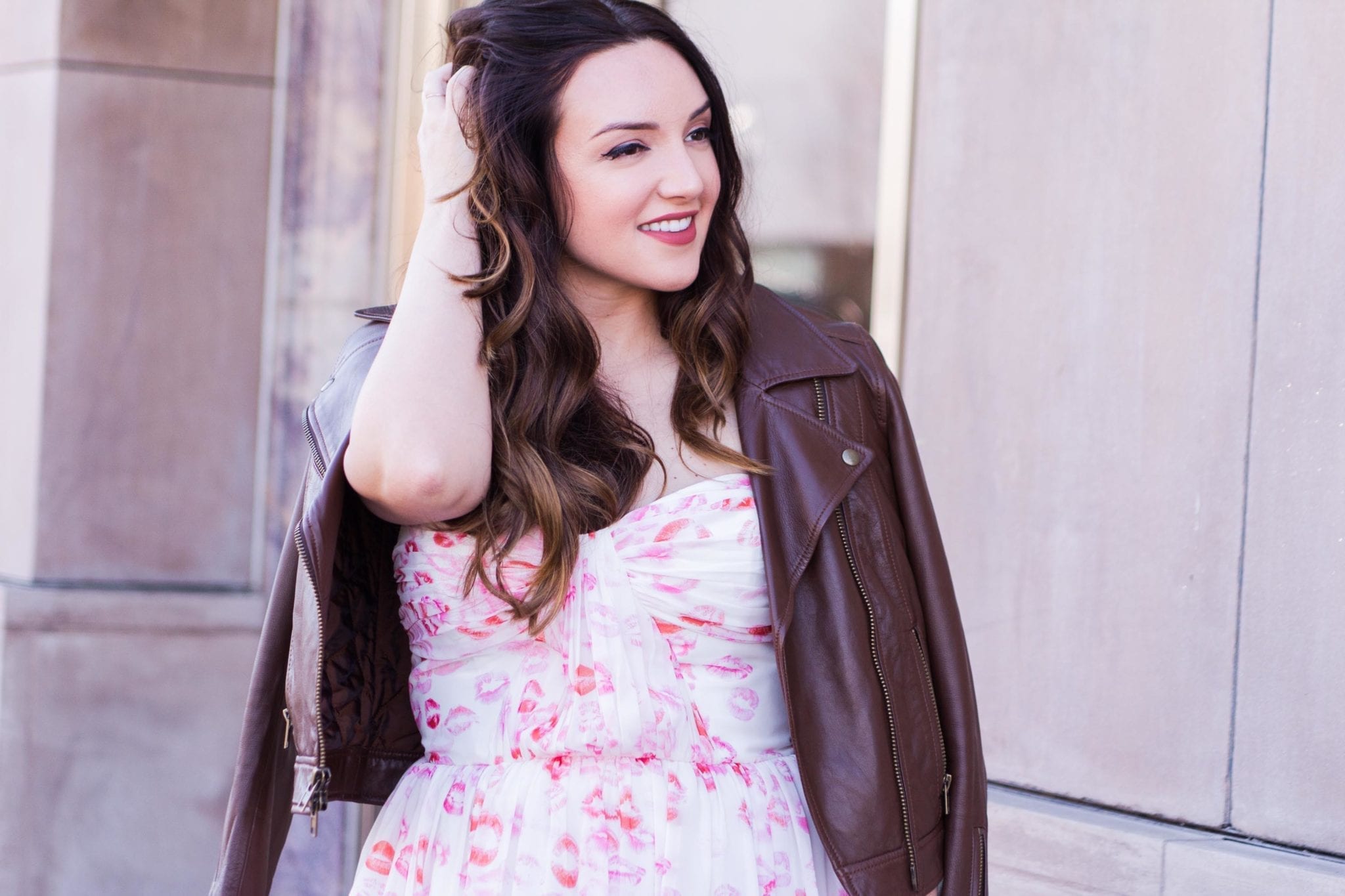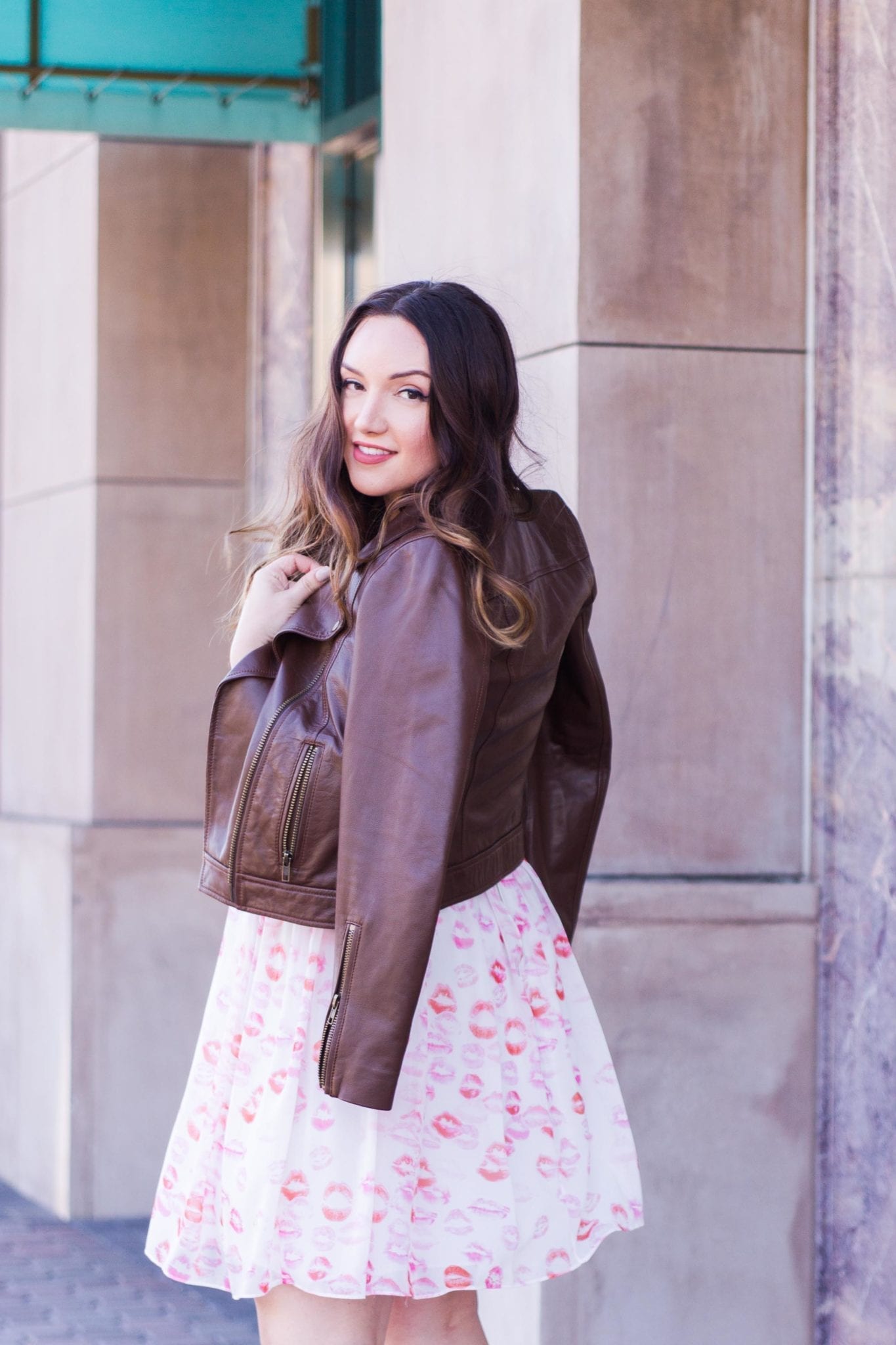 This Valentine’s Day I’m heading to brunch instead of dinner to mix things up, especially since it lands on a Sunday this year.  I’ve been wanting to wear this dress on Valentine’s Day for so long and I’m excited to finally wear it.  In order to make it look less cutesy–because lets be real, its covered in lipstick kisses–I added my favorite leather jacket on top to to give it some edge.  I love these types of outfits where you mix a bit of girly with edgy–so fun!