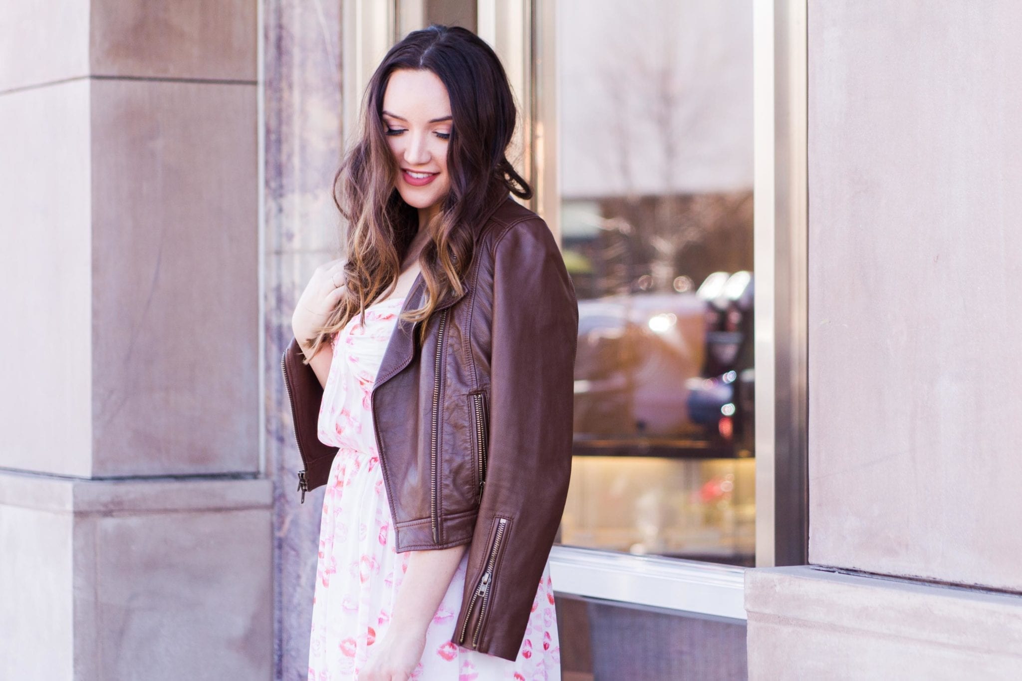 What a darling dress! I love how you paired the feminine dress with a more masculine leather jacket. Absolutely lovely look. Happy Valentine’s Day!