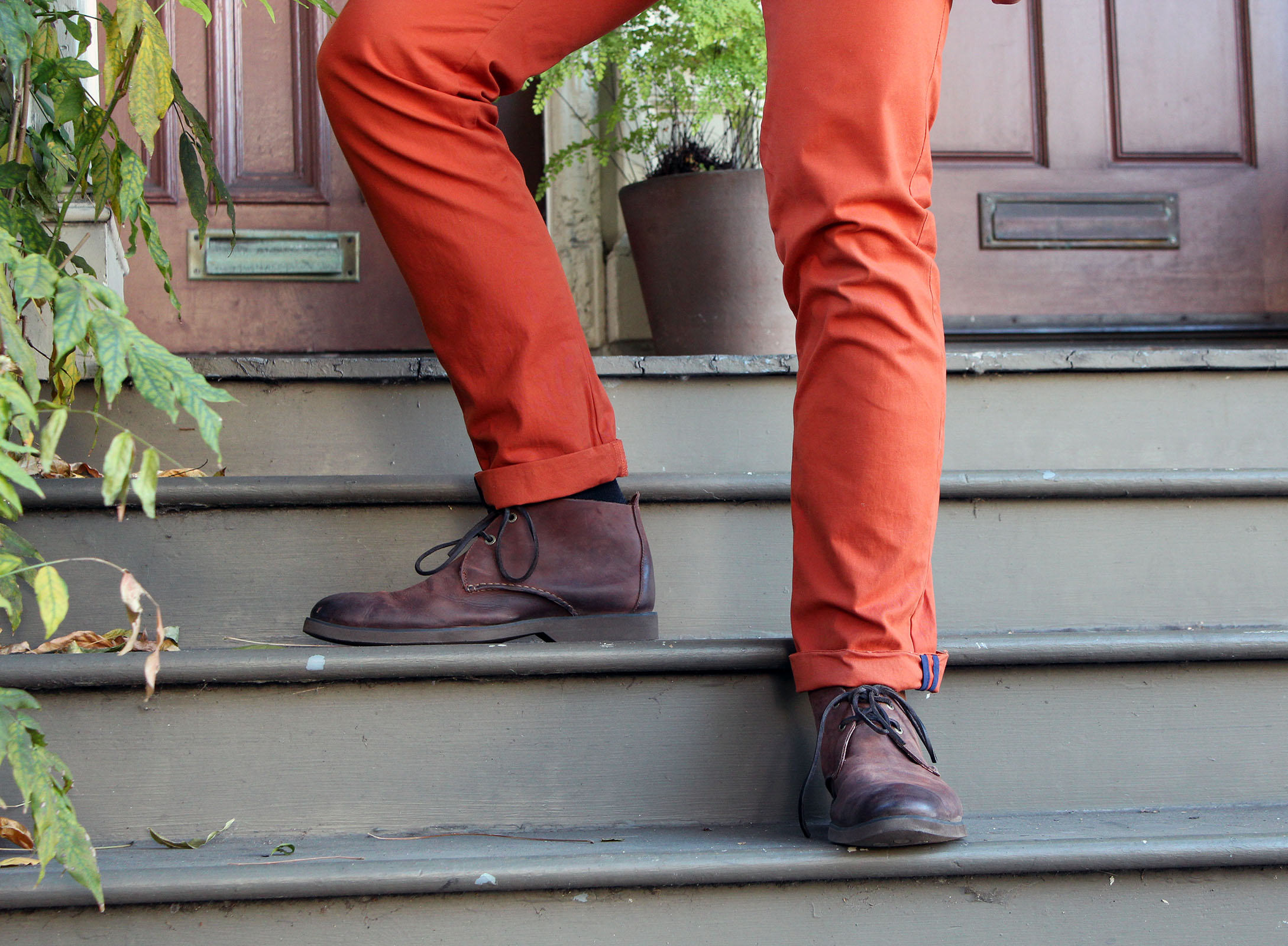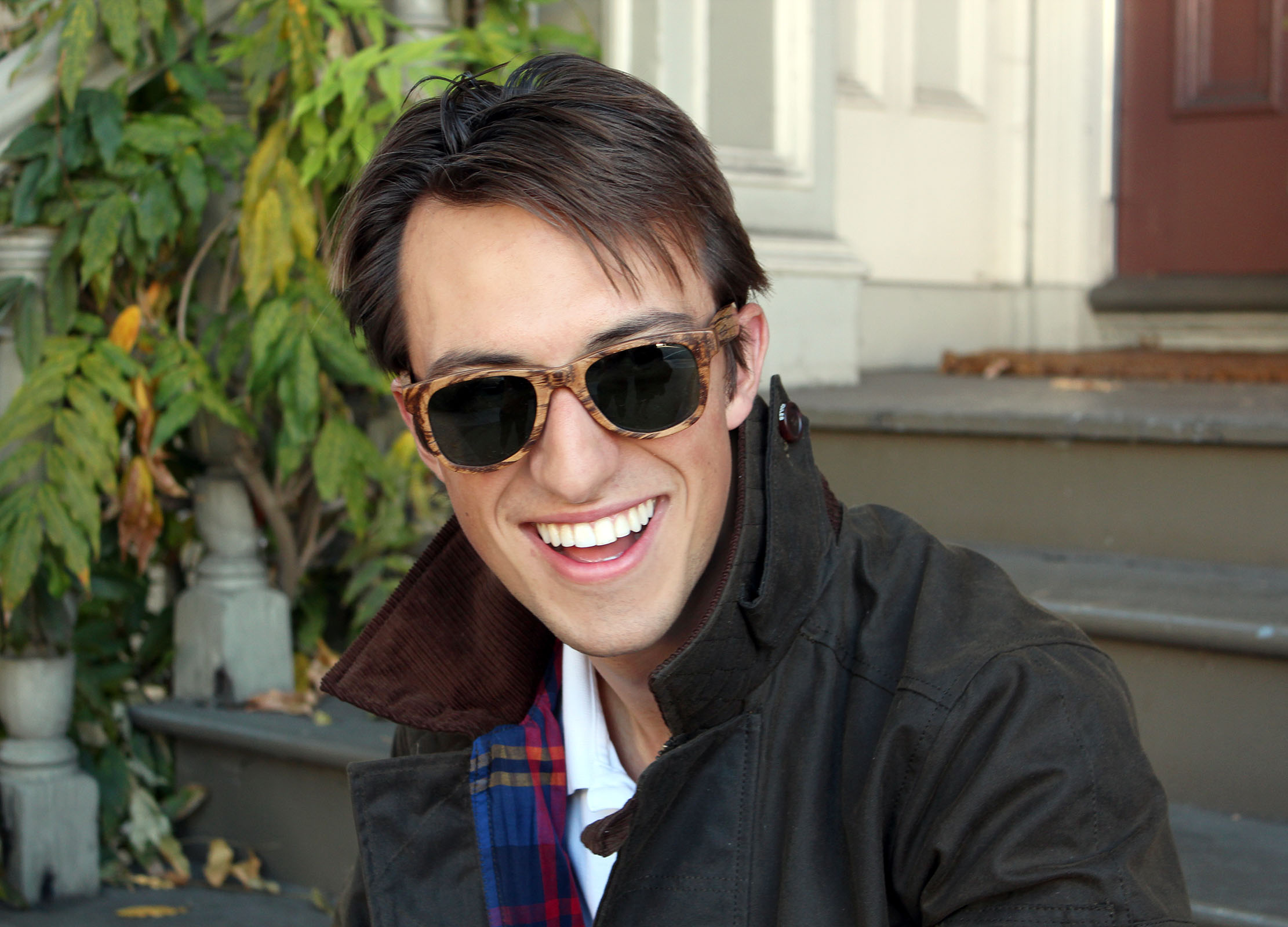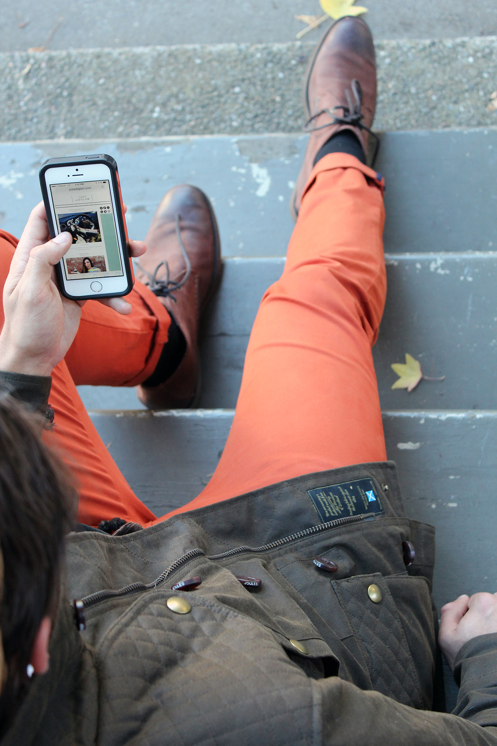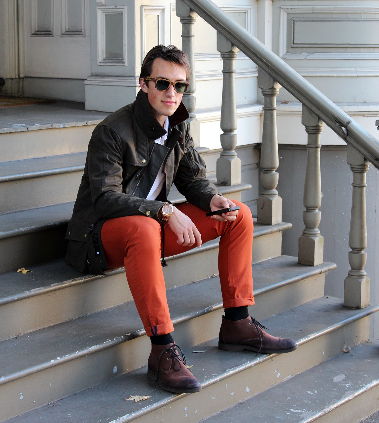 Andrew wore the Landsdale wax jacket from the selection of Joules men’s coats which has this really cool waxy finish to it which is great to battle the elements of rain or snow (or misty fog in the case of San Francisco!). He kept the warm tones going as well and opted for a burnt orange skinny chino and perfectly worn-in Sperry boots. Andrew is always rocking cool shades and his wooden sunglasses from WOOED are no exception. These sunglasses are actually made from reclaimed zebrawood which happens to be the same wood as my dining table at home, a handmade gift from my father. How cool is that?
