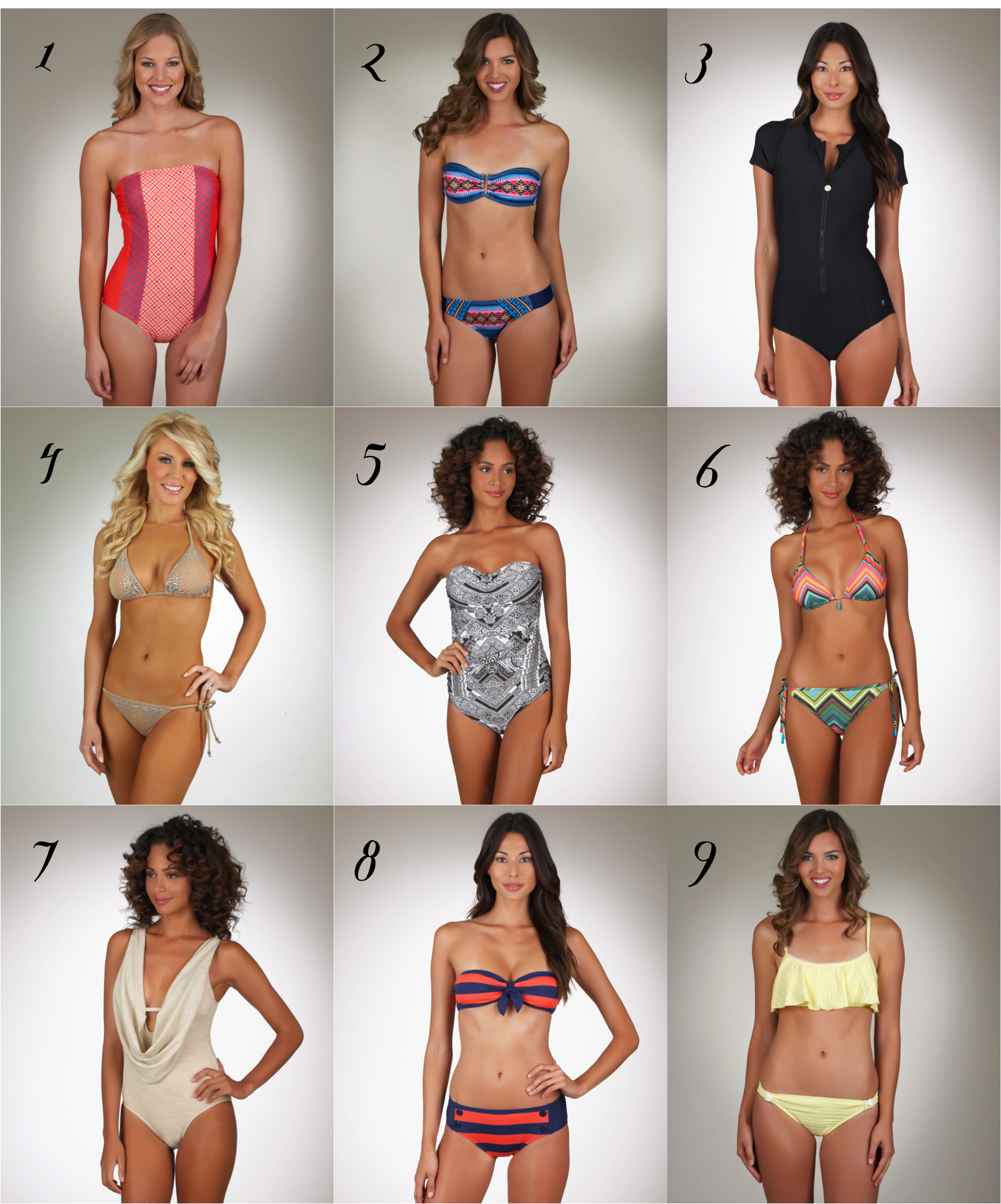1. Ella Moss Sun Tile Bandeau // 2. Hurley Mayan Stripe Bandeau // 3. Next Good Karma Zip One Piece // 4. Gretchen Christine x LUXE Bling Triangle Bikini // 5. St. John Sintra Bandeau // 6. Ella Moss Caravan Reversible Triangle Bikini // 7. LUXE by Lisa Vogel Opening Night Maillot // 8. Splendid Marcel Stripe Bandeau Bikini // 9. Splendid Ginger Eyelet Bikini